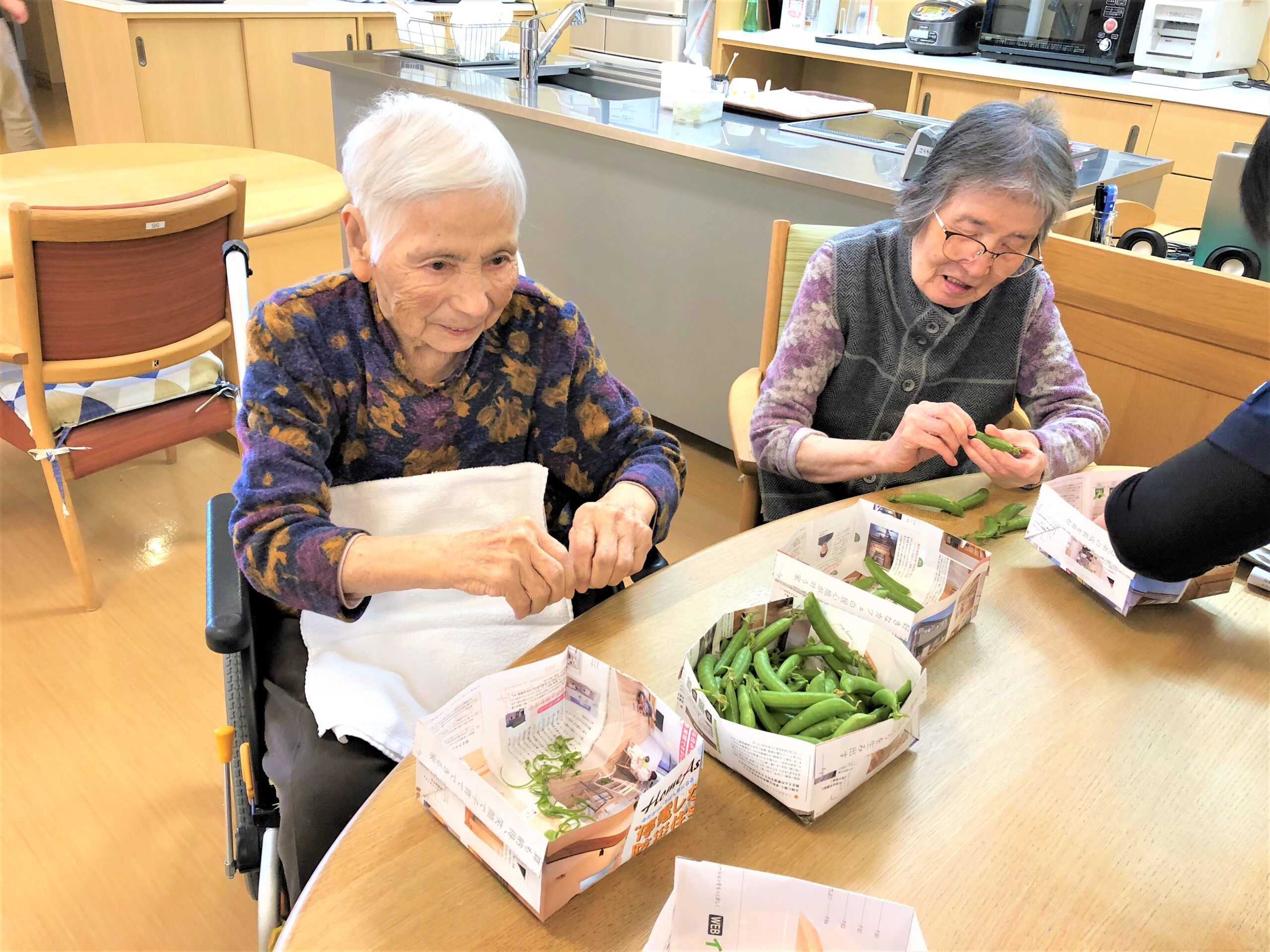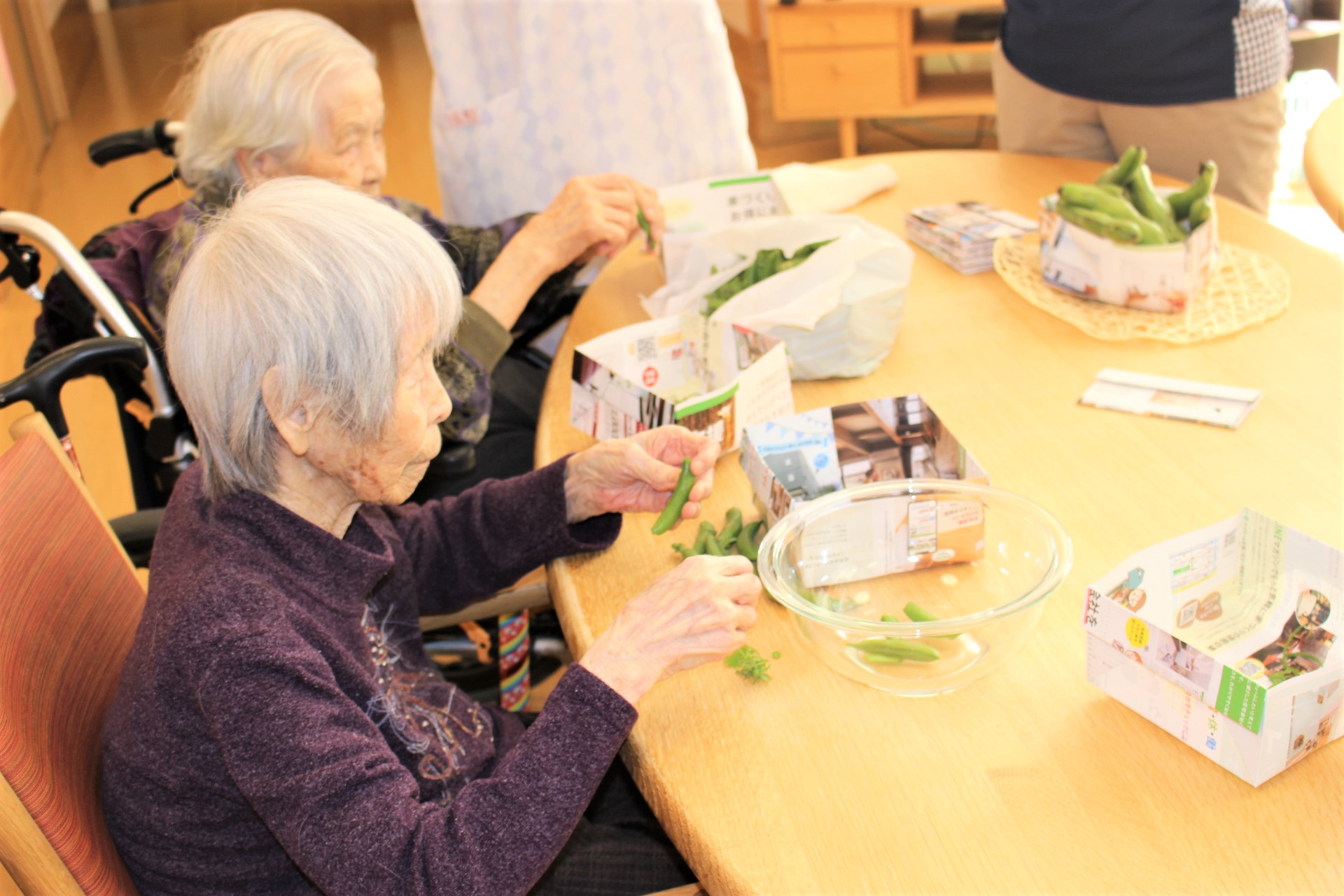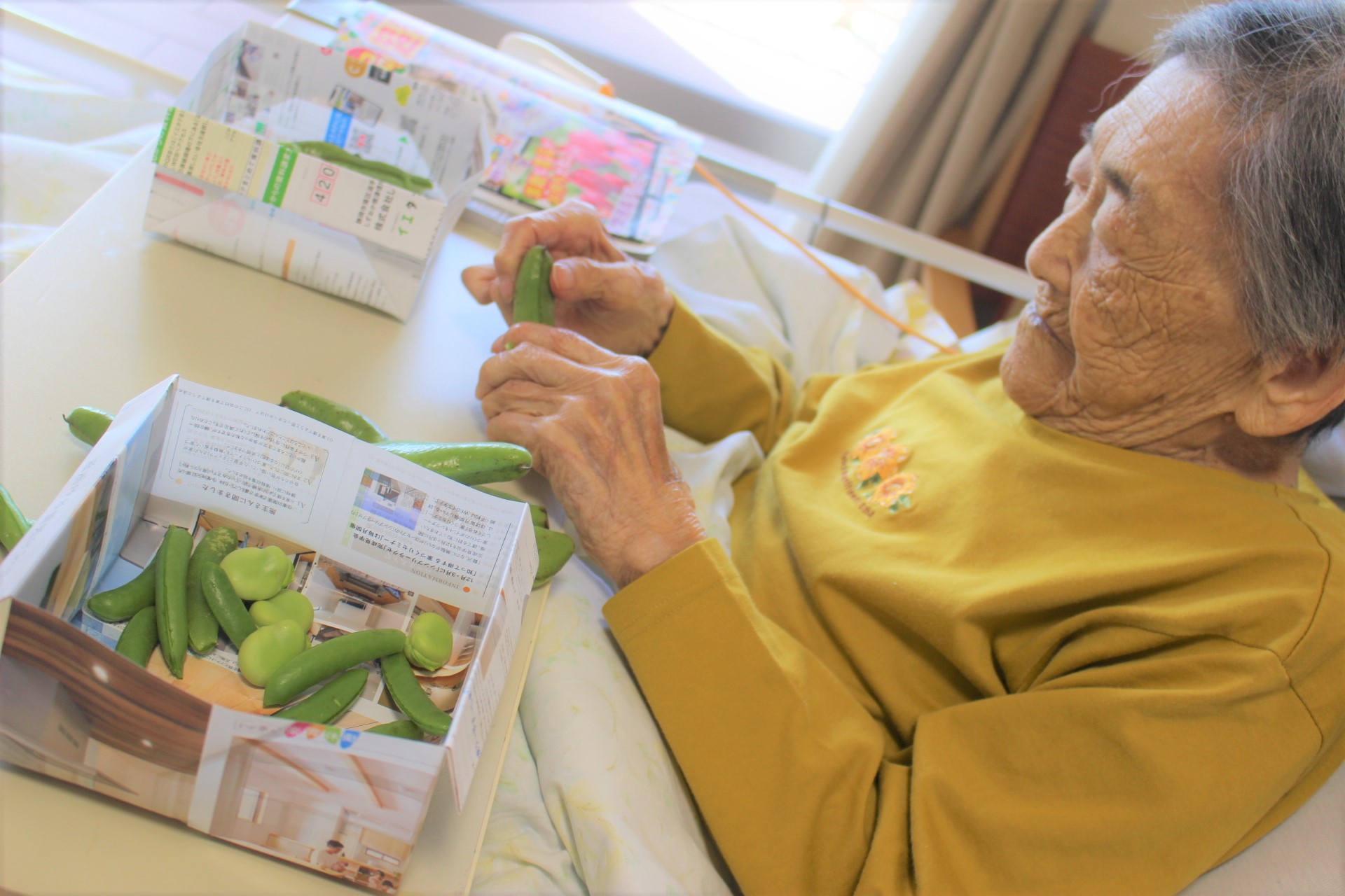 指先が上手く動かない方には大きめのそら豆を剝いてもらい、片手が利かず作業ができないよという方は職員と一緒に近くに行ったり応援をしてもらい、それぞれができることをやりました。
