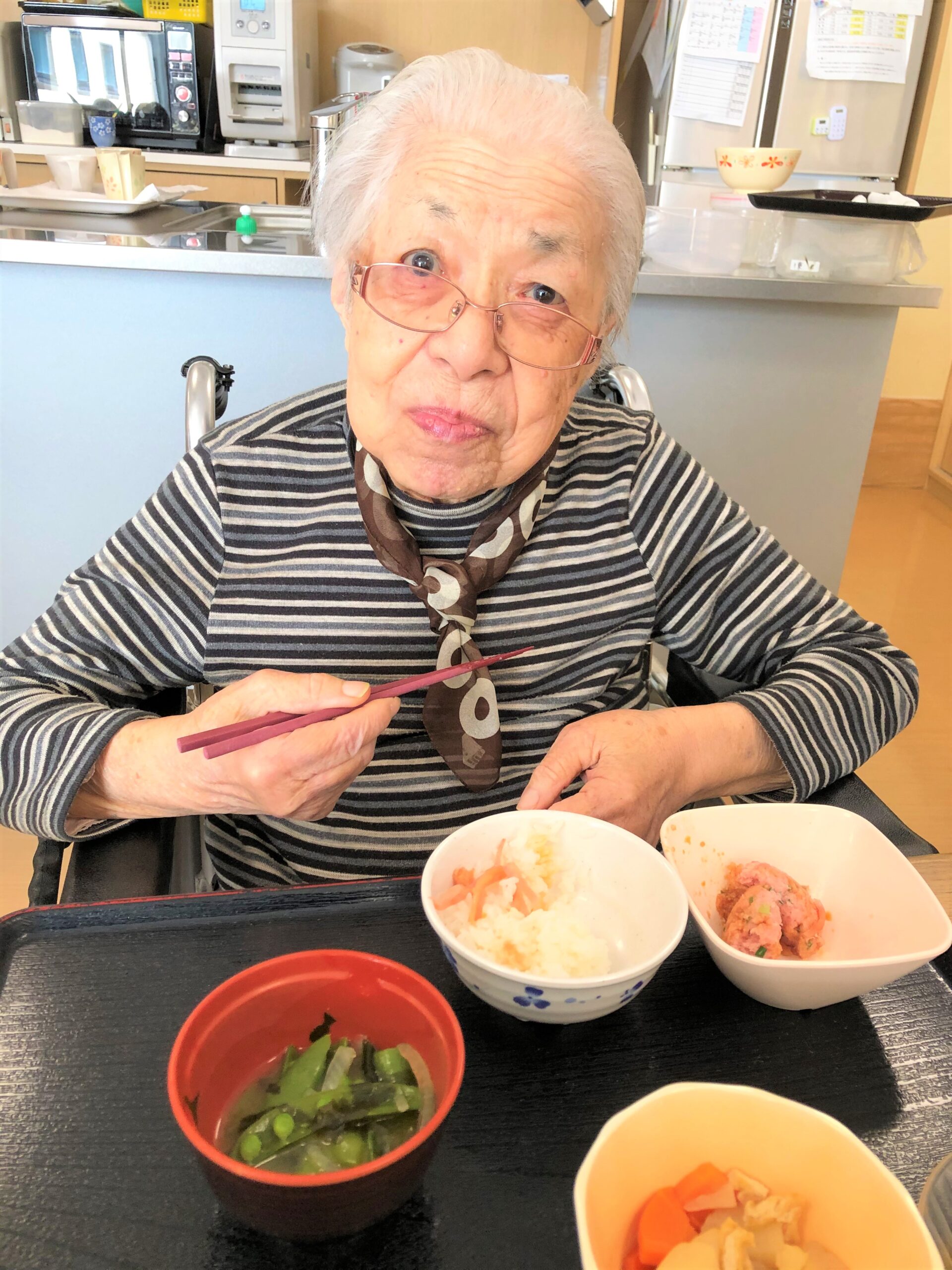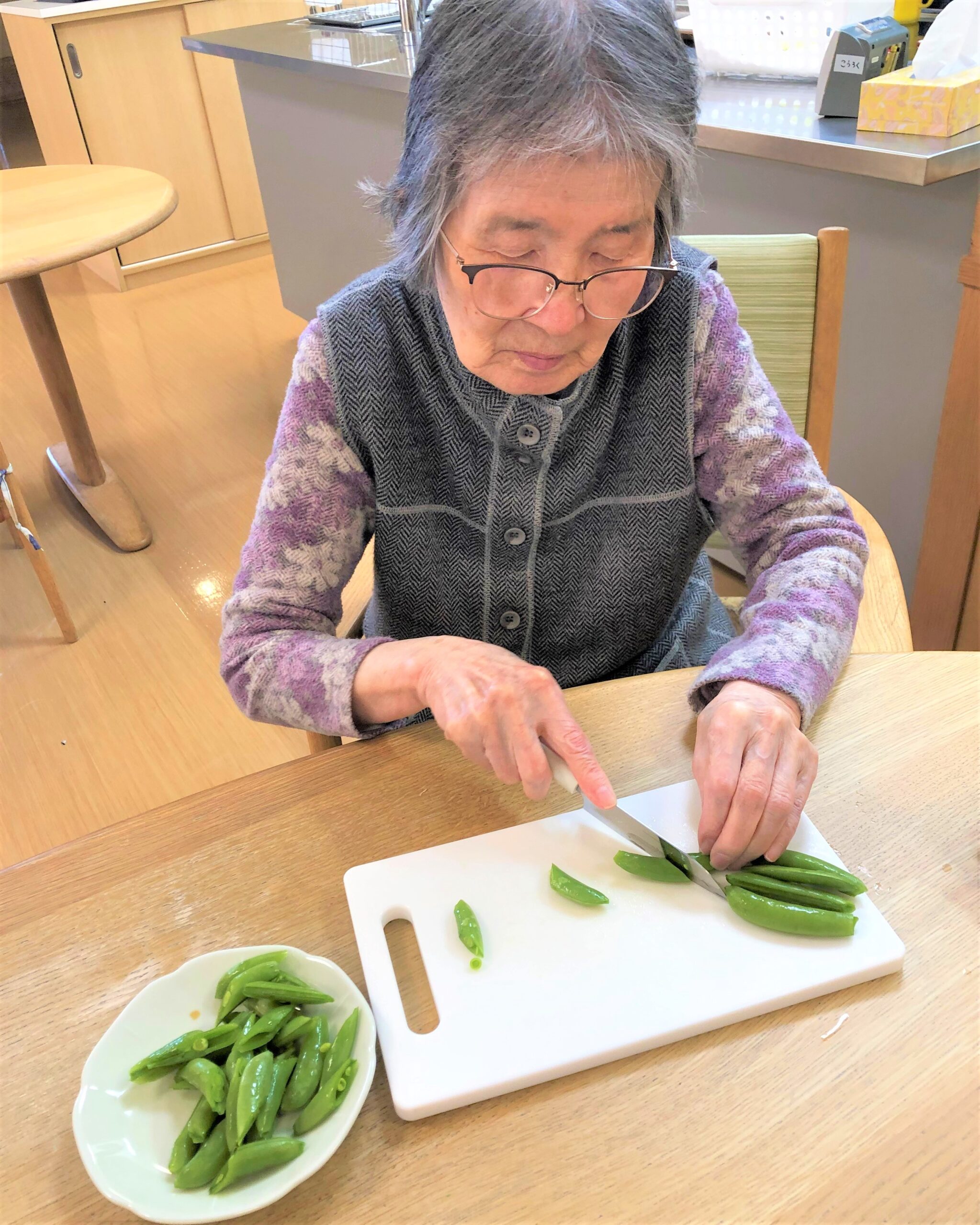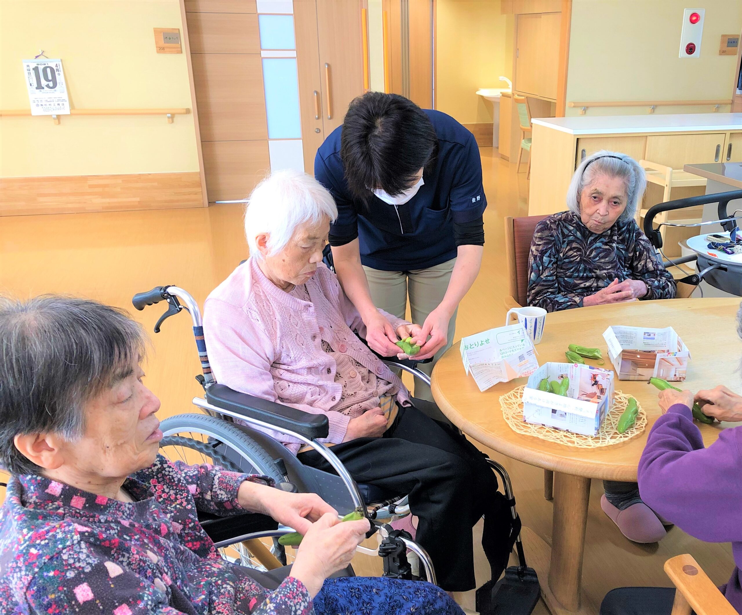 指先が上手く動かない方には大きめのそら豆を剝いてもらい、片手が利かず作業ができないよという方は職員と一緒に近くに行ったり応援をしてもらい、それぞれができることをやりました。