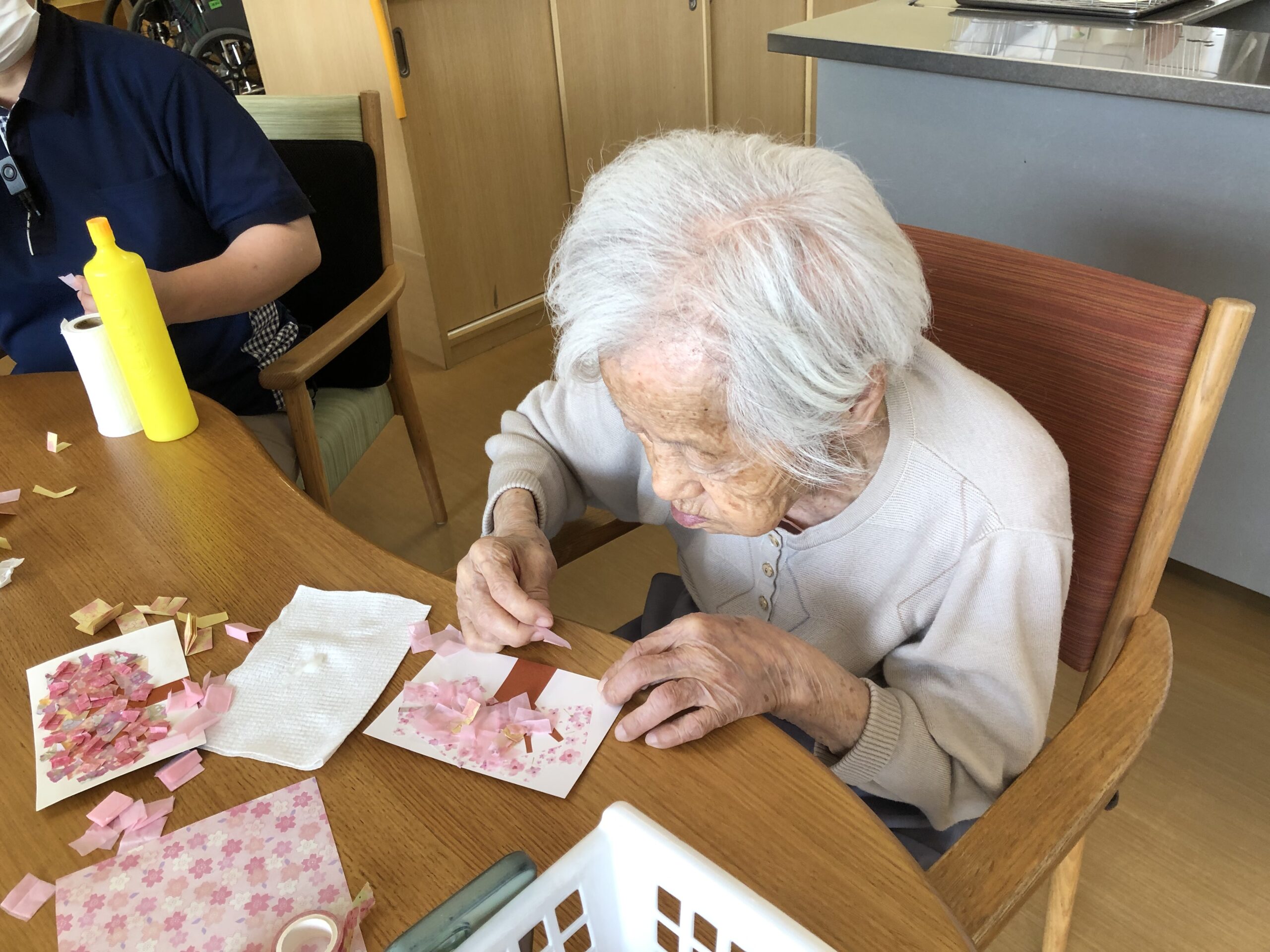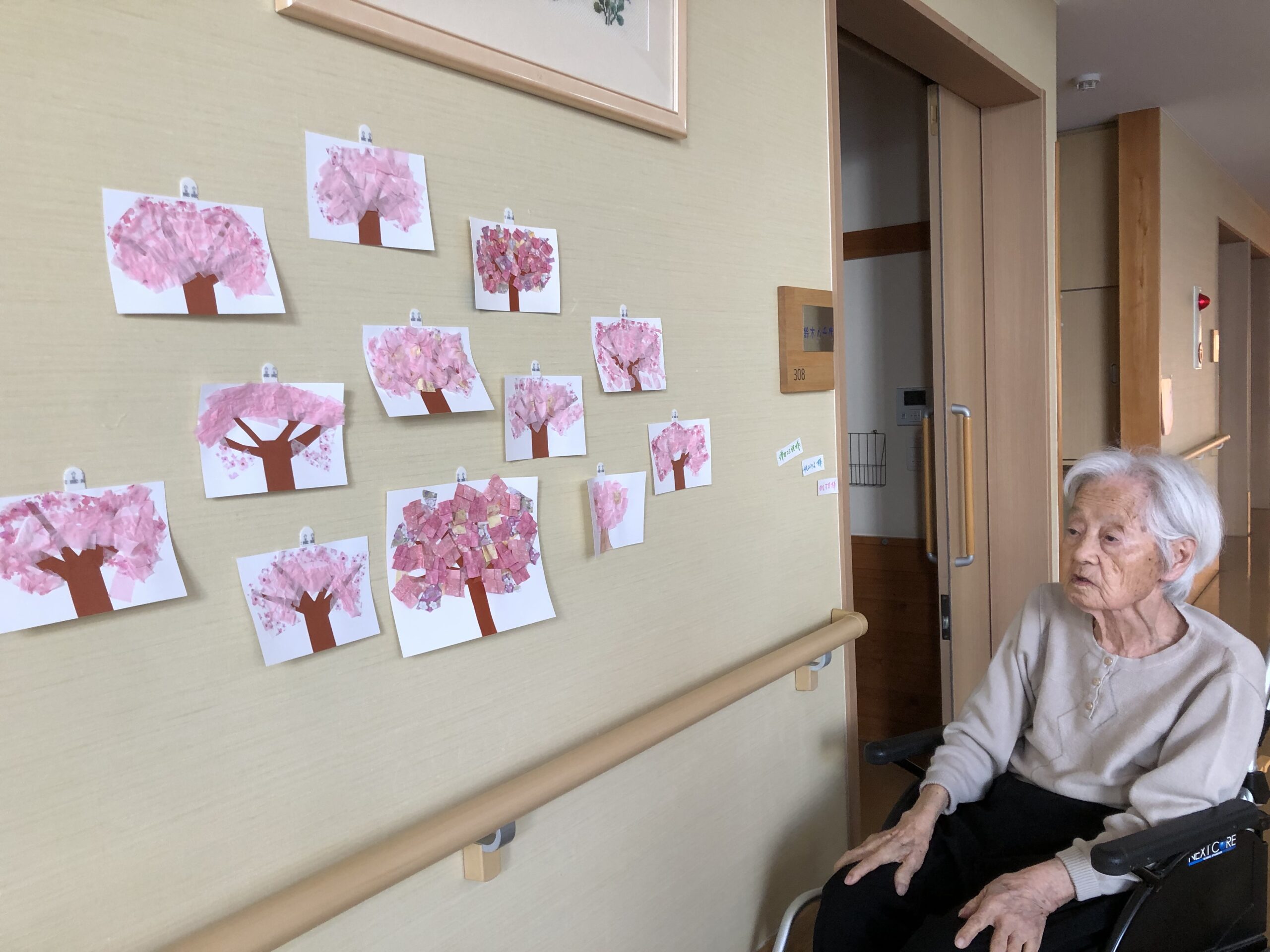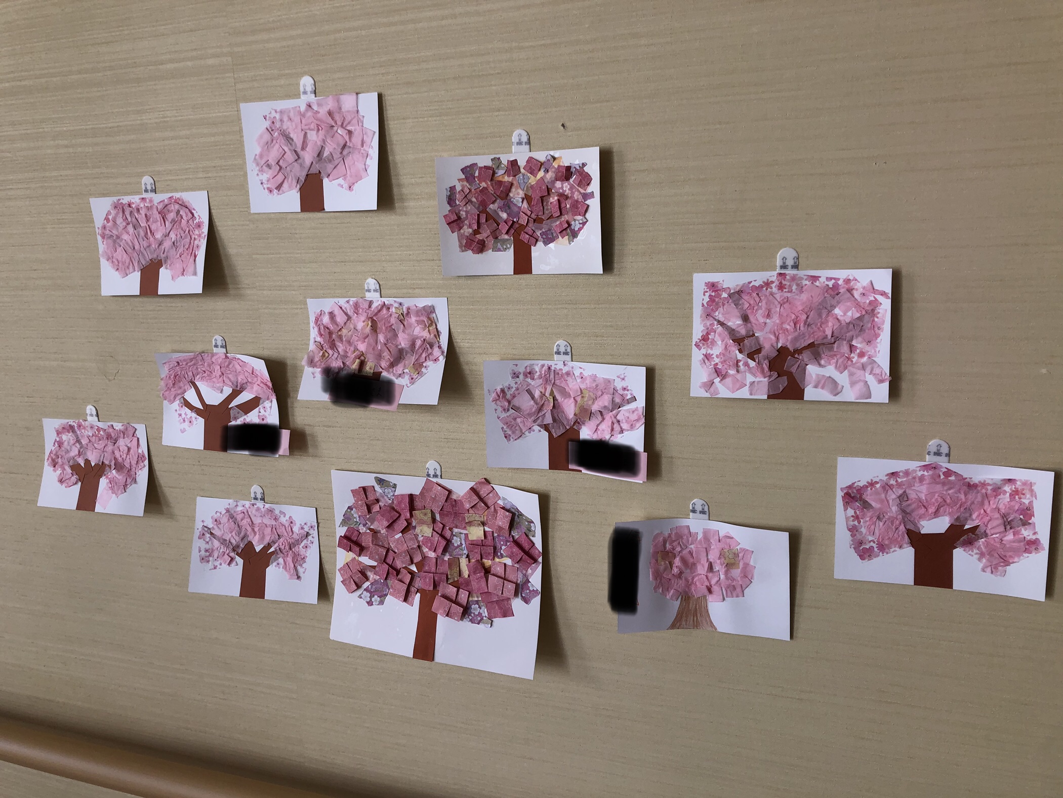 春を感じていただくため、桜の貼り絵を制作していただきました。