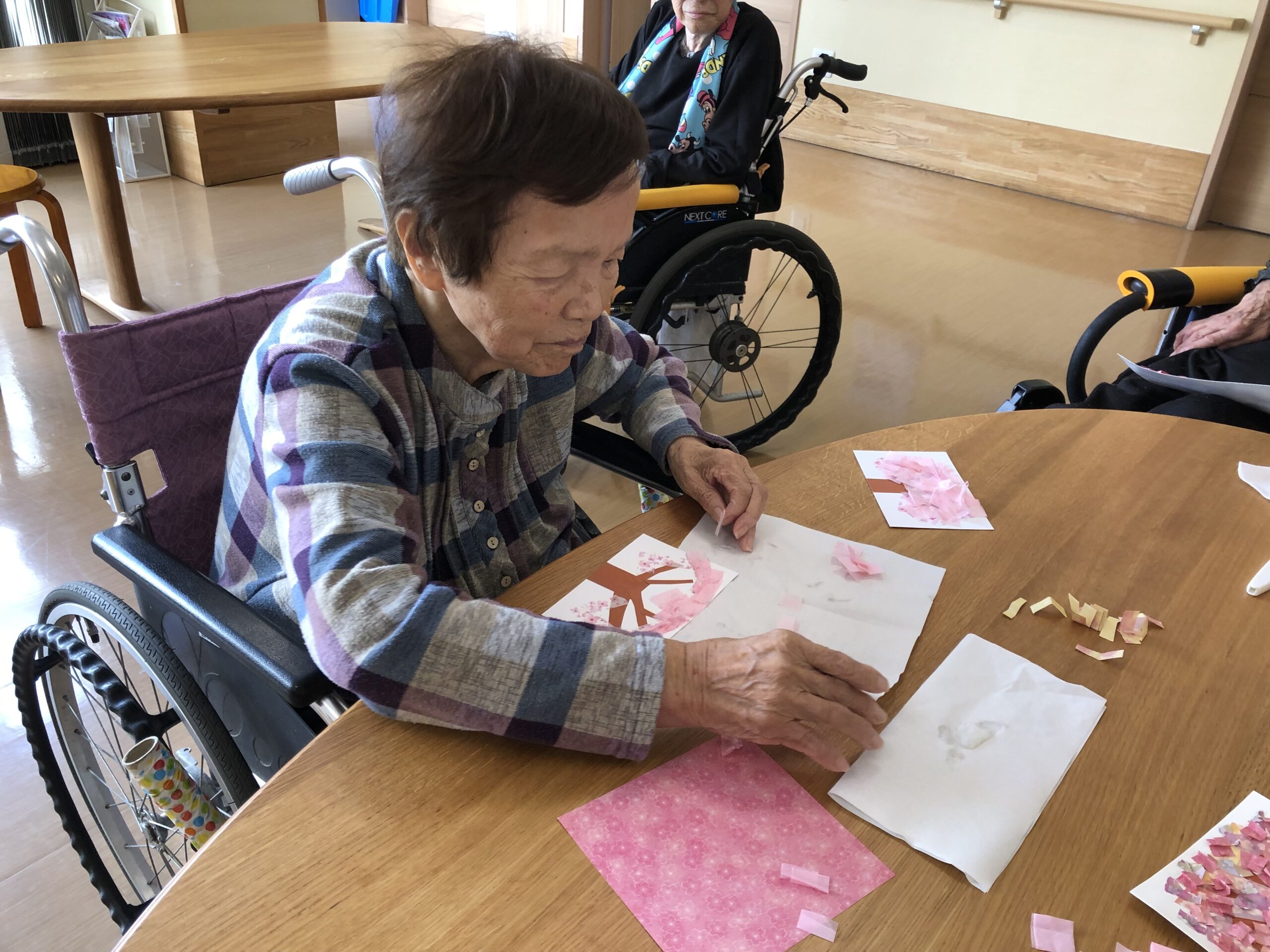 「ここから作るの?」と完成させることができるのか不安そうなご様子でしたが、職員と一緒にフラワーペーパーやマスキングテープを貼っていくうちに華やかになっていく作品に笑顔が見られました。