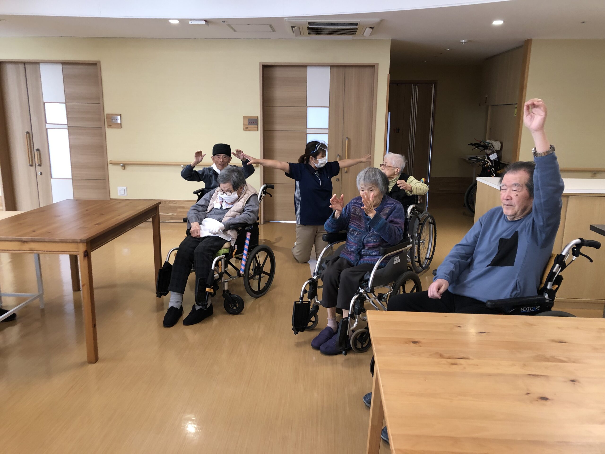 ユニット1階では「体操をやりたいや」とご要望されたお客様もいらっしゃることから、定期的に体操を行っています。
