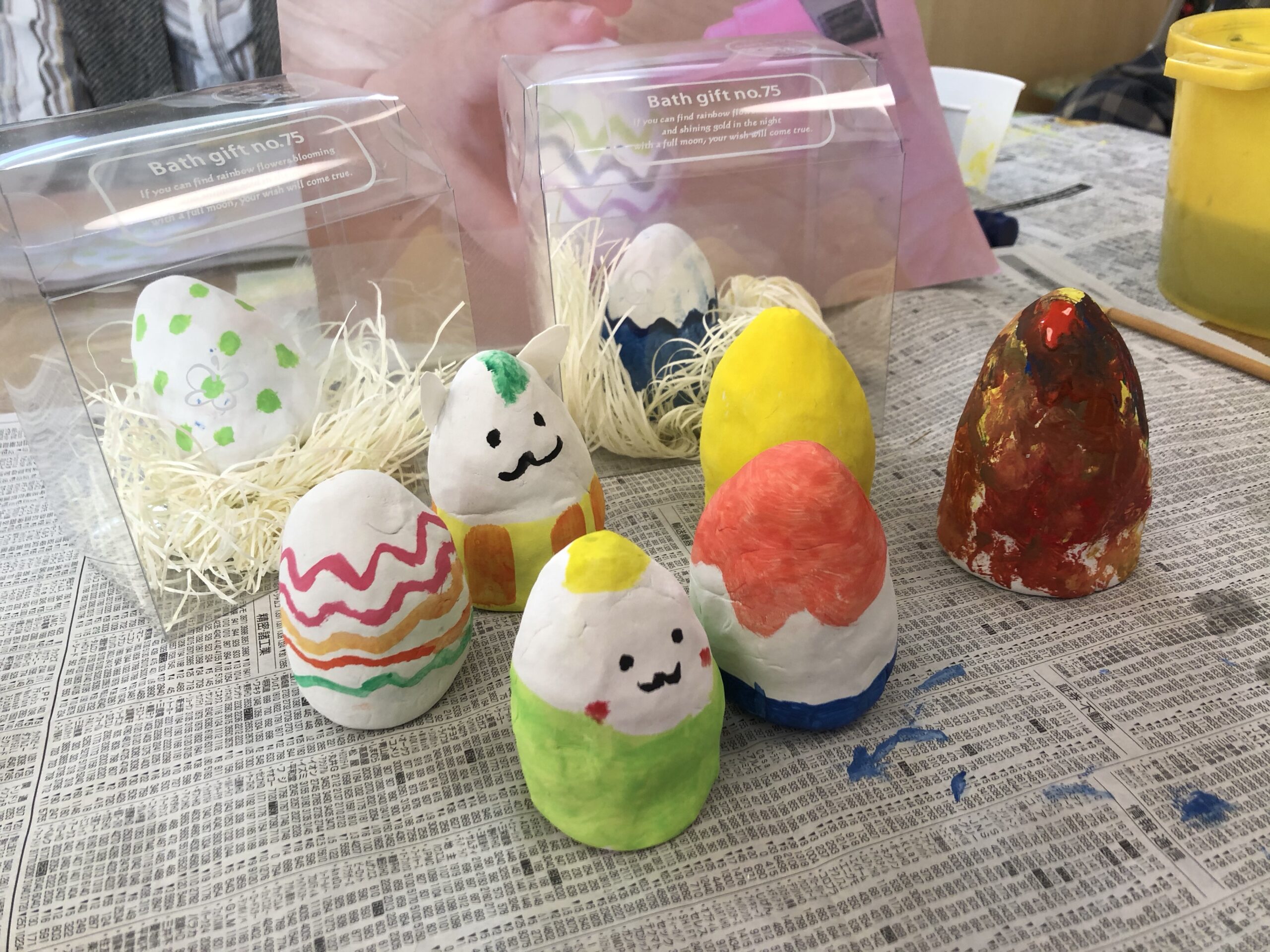 イースター・エッグの「エッグ」は、事前に紙粘土でタマゴ型に整形し準備しておき、そのタマゴに皆様と一緒に絵の具で模様をつけていきました。