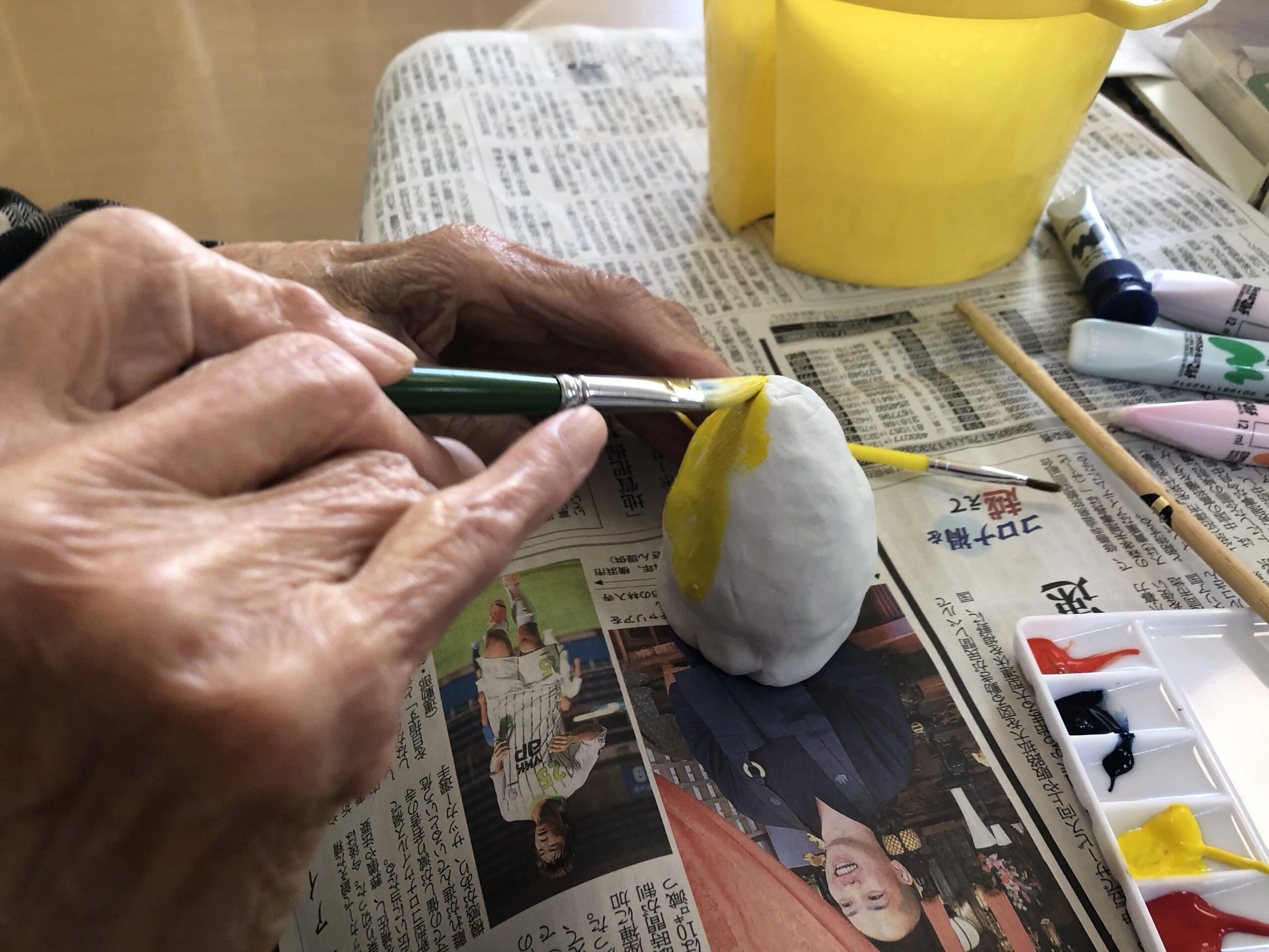 太めの筆を選び、白いタマゴを黄色く広く塗りつぶしていくのを提案させていただきました。指先に不安がある方でも、ベタ塗りなら塗りやすくなります。