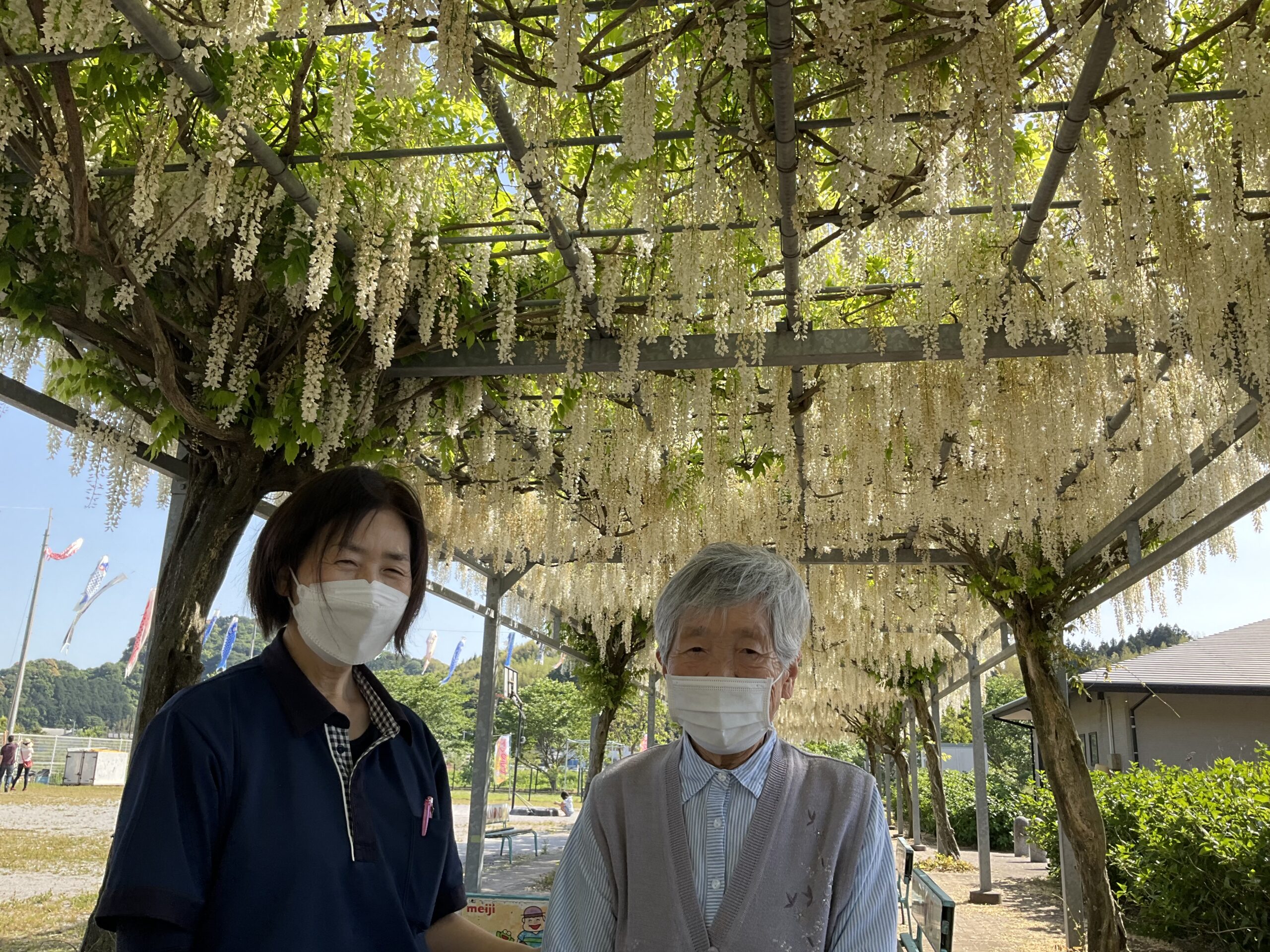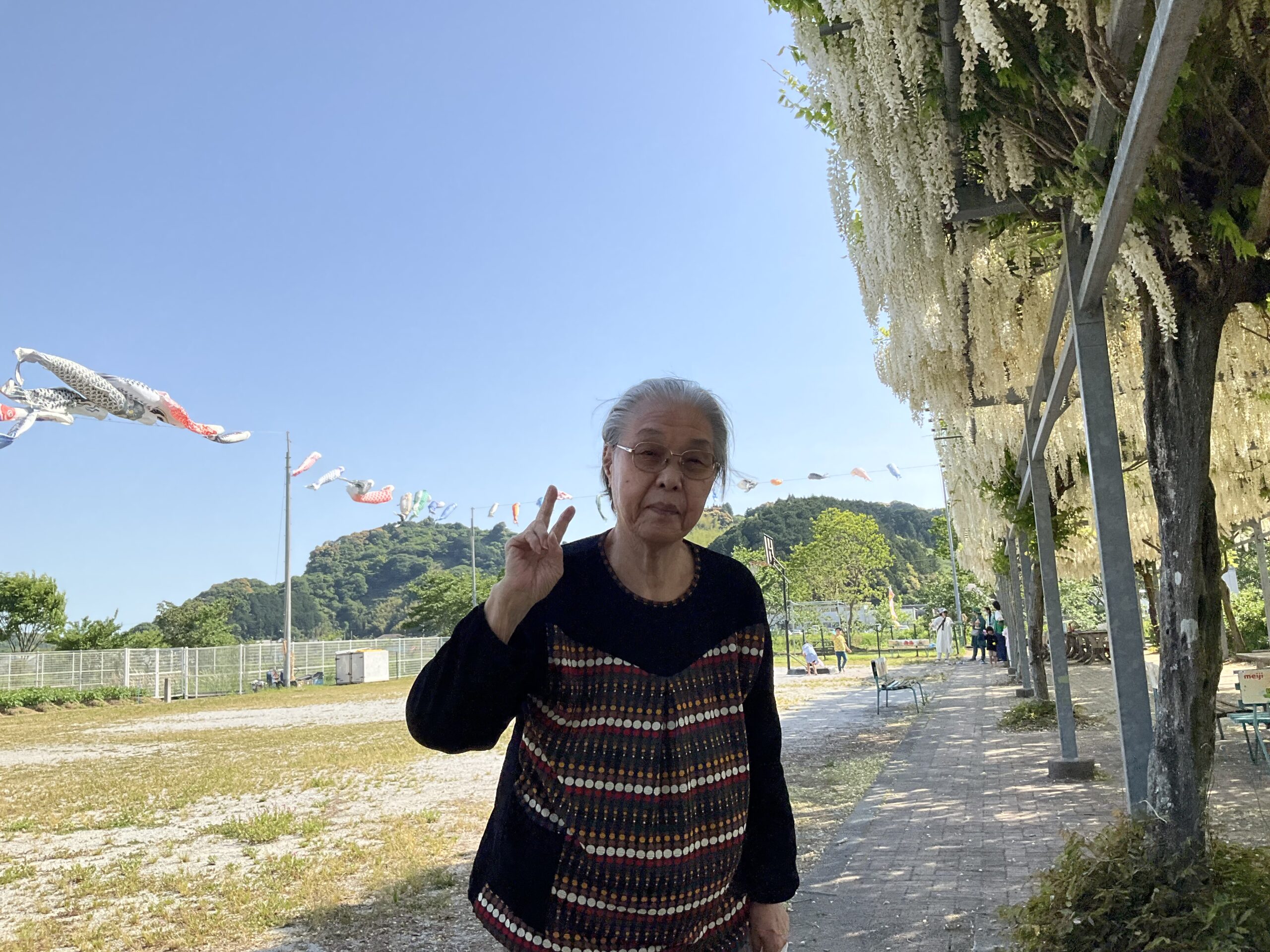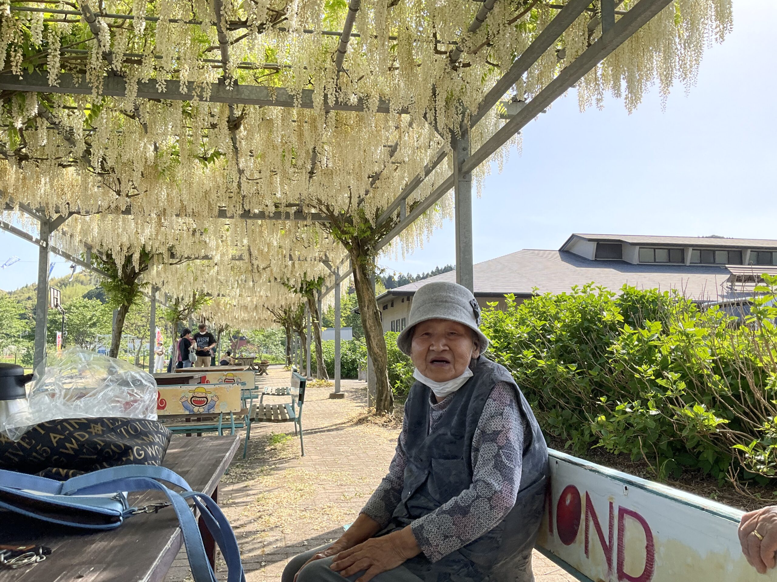 藤棚の日陰のベンチに腰掛けて、山の緑の中をのびのびと泳ぐ鯉のぼりを、皆様のんびりとご覧になっていました。