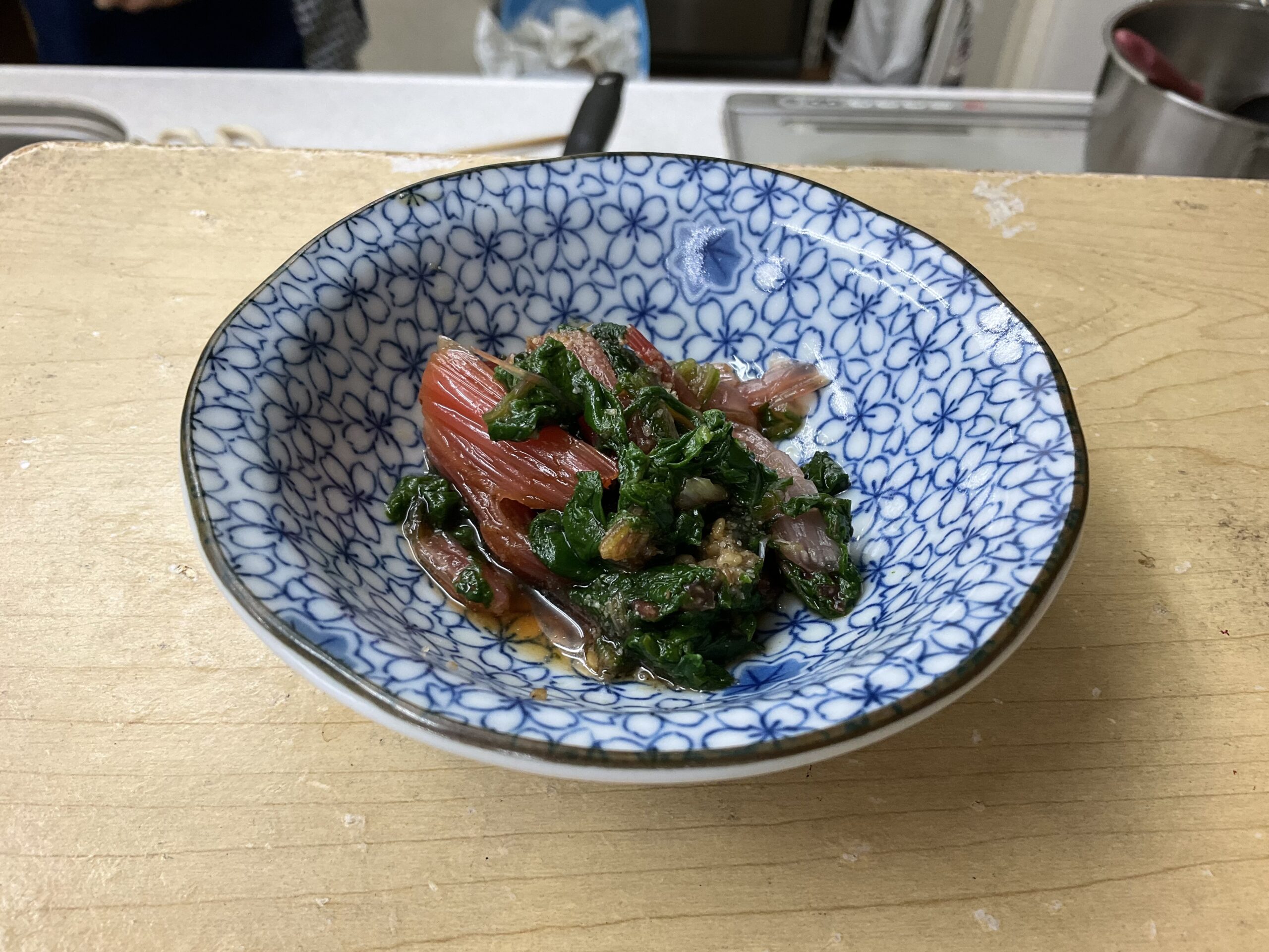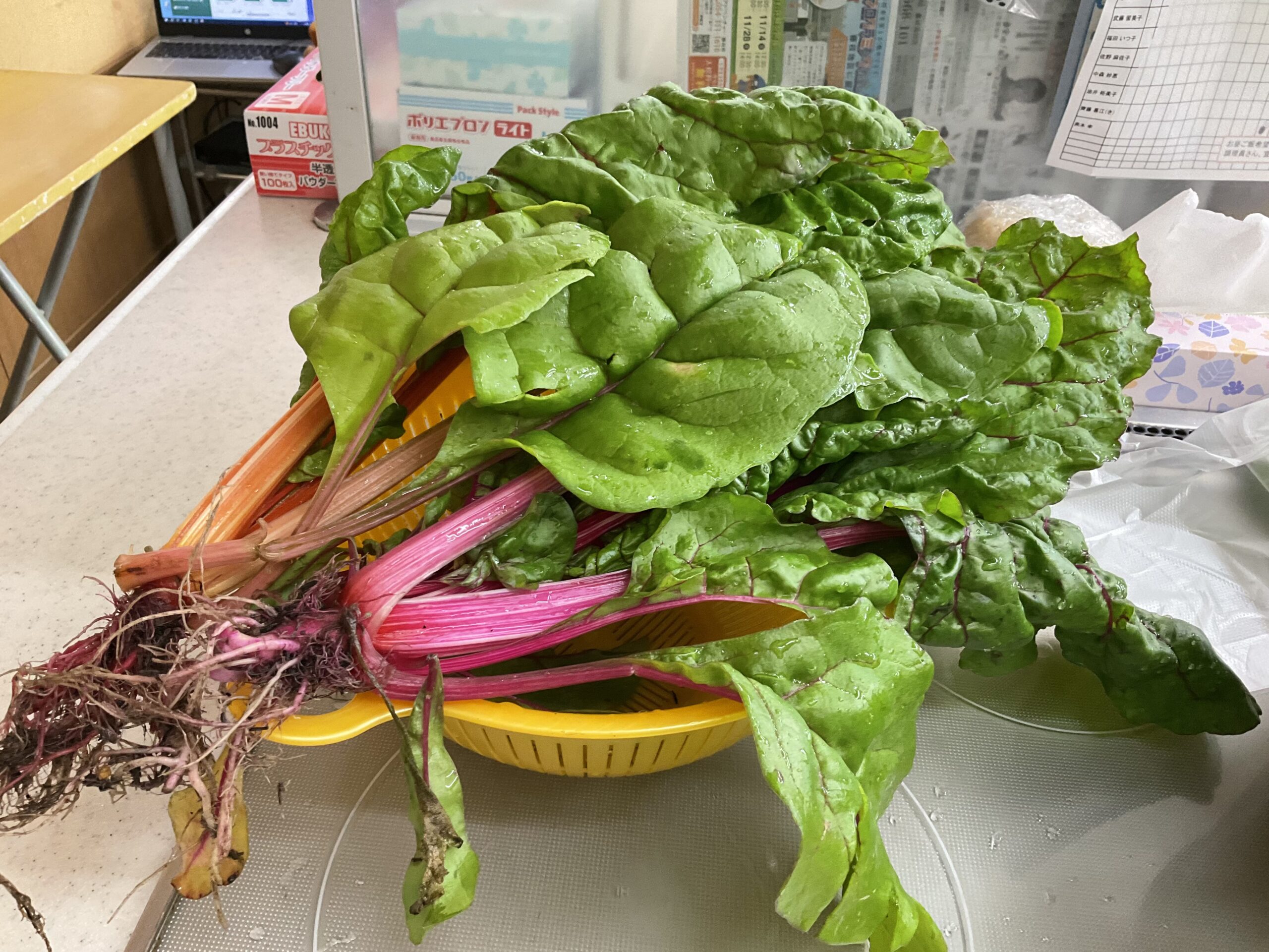 収穫したスイスチャードは、きすみれの調理員さんが腕を振るって下さり、お味噌汁と胡麻和えで頂きました。