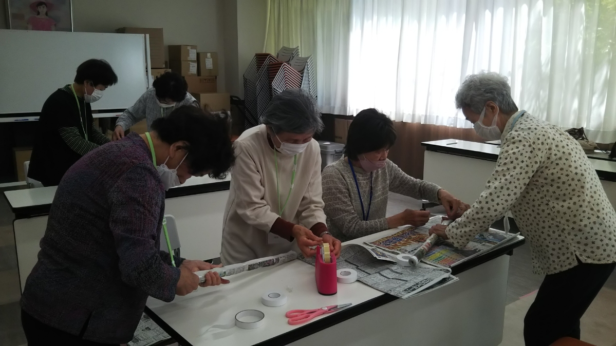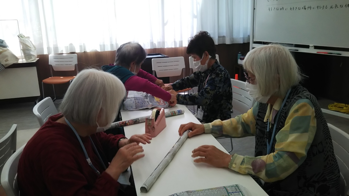 最後には、次回の活動に向けて準備をしました。新聞紙をくるくると丸めて、棒を作ります。