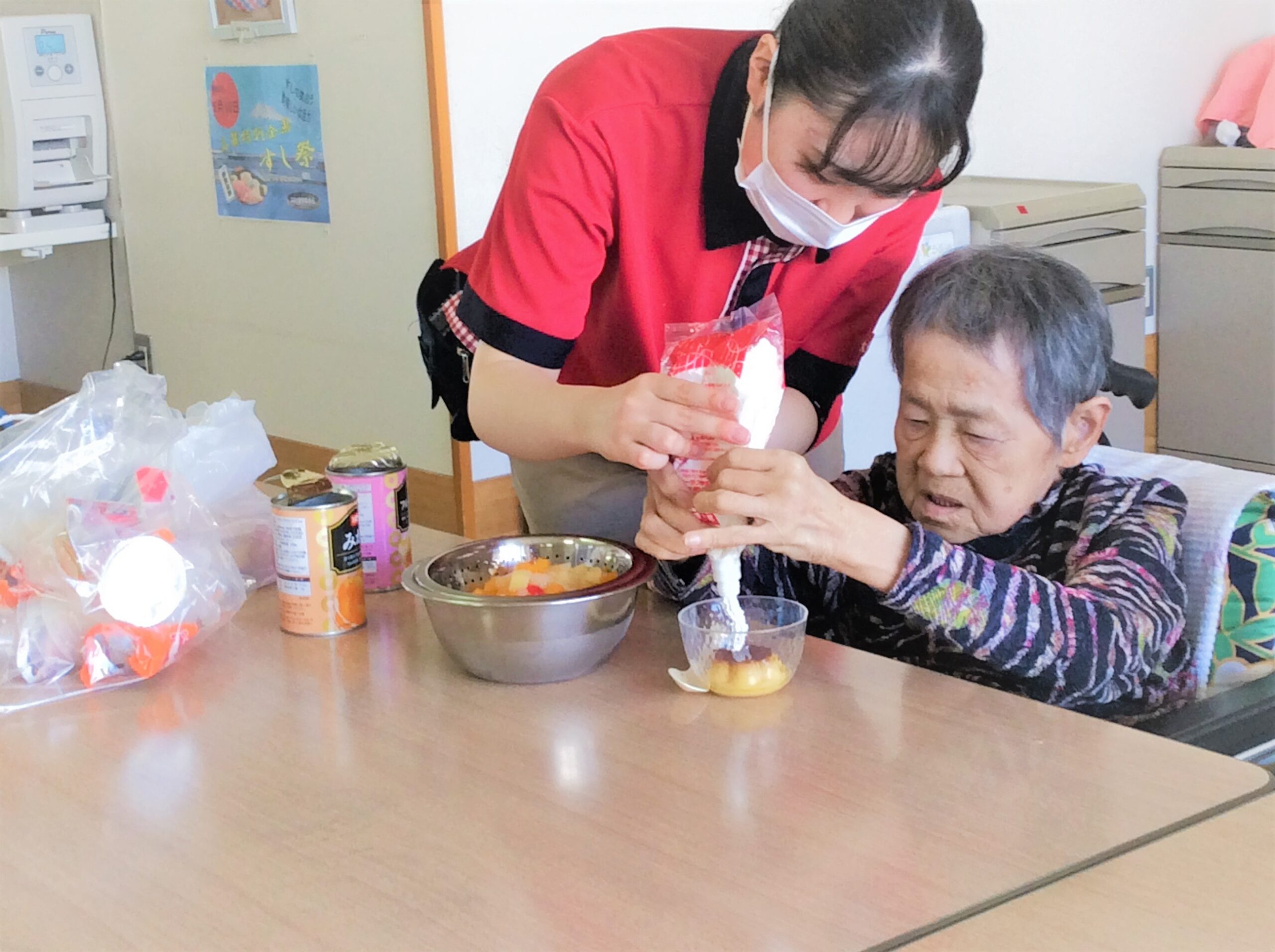 職員と一緒にプリンをお皿に移し、ホイップクリームと果物で飾りつけをしました。