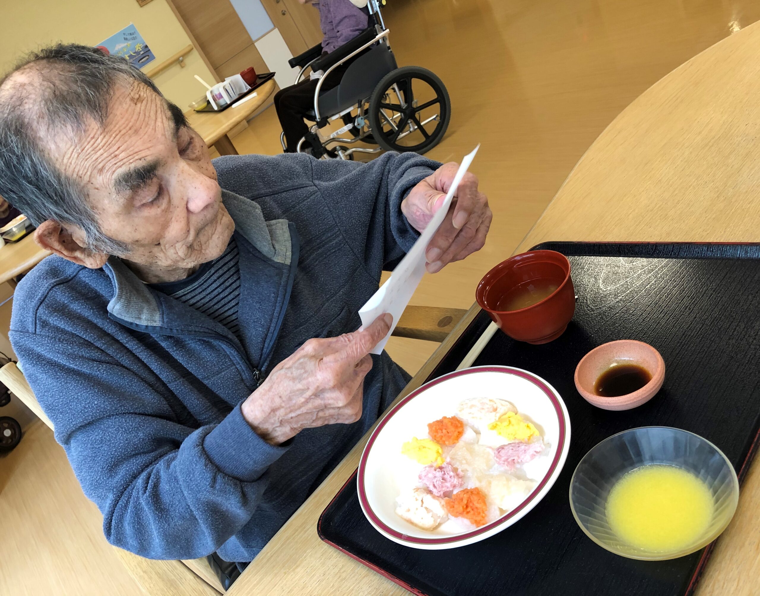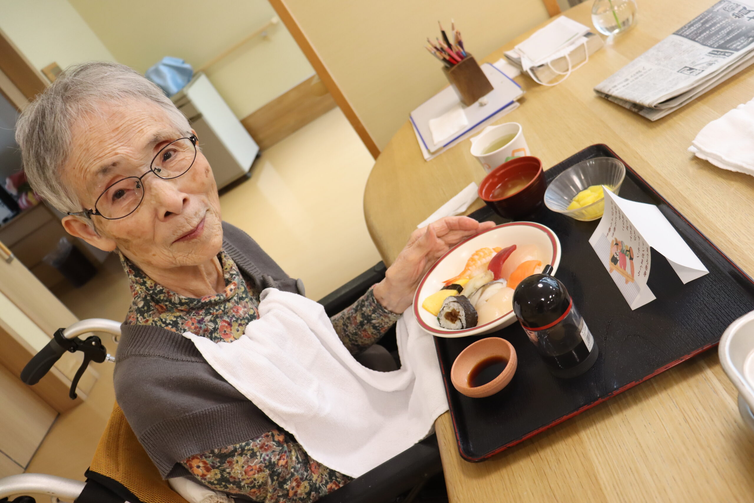 食べやすいようにやわらかくしたソフト寿司(ソフト食)を召し上がる方もお品書きを読むことで、お寿司をより美味しく感じていただくことが出来たようです。