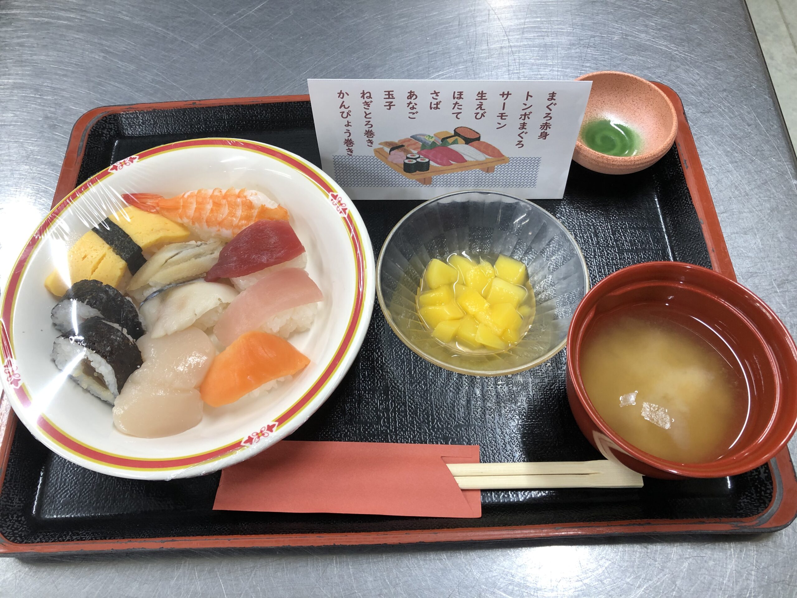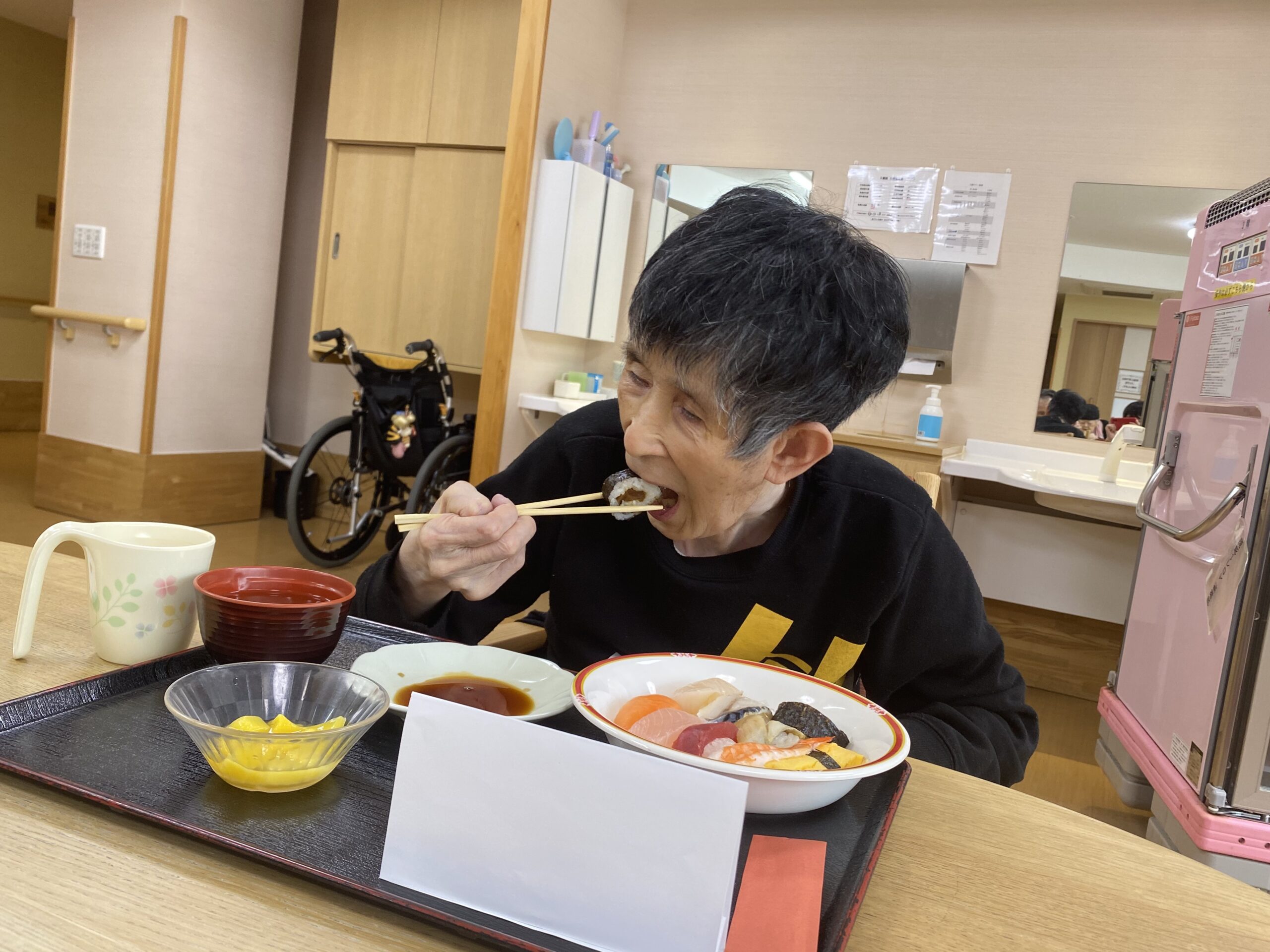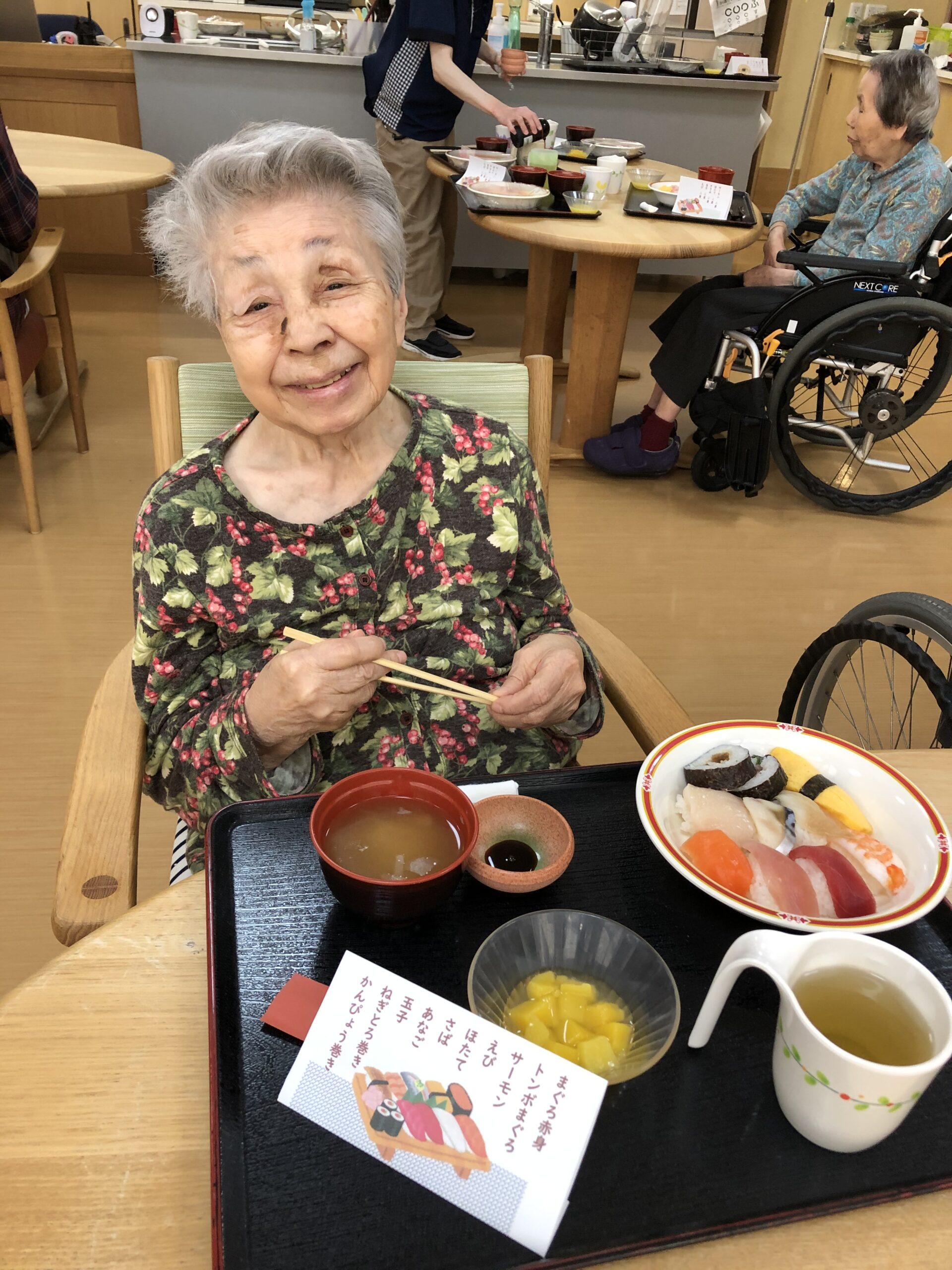 ウイルスの流行が治まる気配がない中、お客様の楽しみを増やすために感染対策をしながら実施する方法を考え、嗜好調査の結果、リクエストNo.1だったお寿司を給食で楽しんでいただくことになりました!