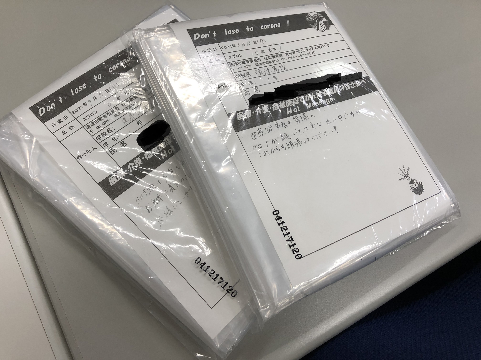 焼津市青少年ボランティア人材バンク様より感染防止エプロンを寄附していただきました。