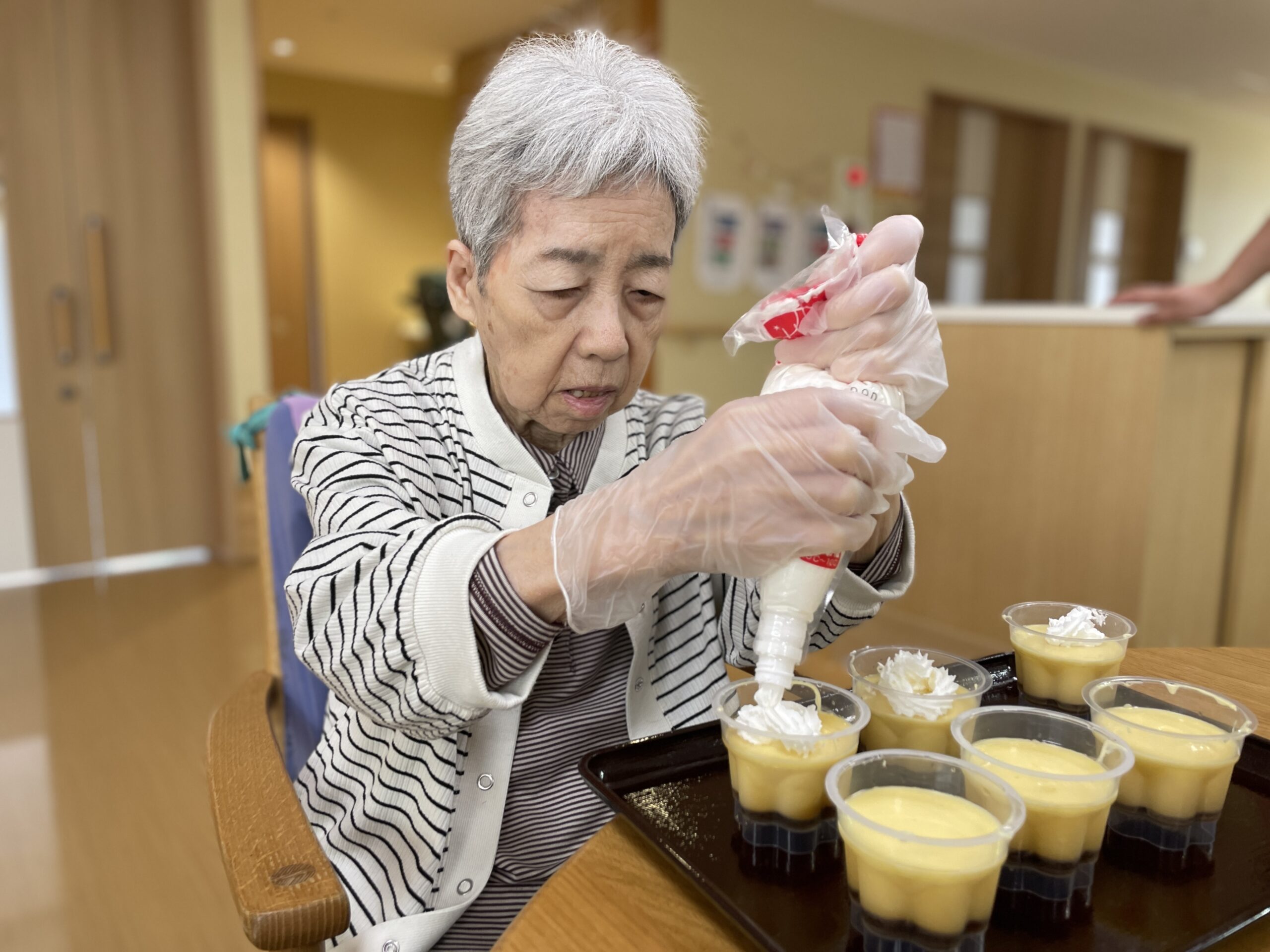 普段ですと、お客様の「自分らしく生きる」を重点するため、色や形もお客様の嗜好に合わせた提供をするのですが、今回はお誕生日のお祝い感を高めるため、あえて同じプリンを提供し、同じ味を一緒に共感しようということになりました。