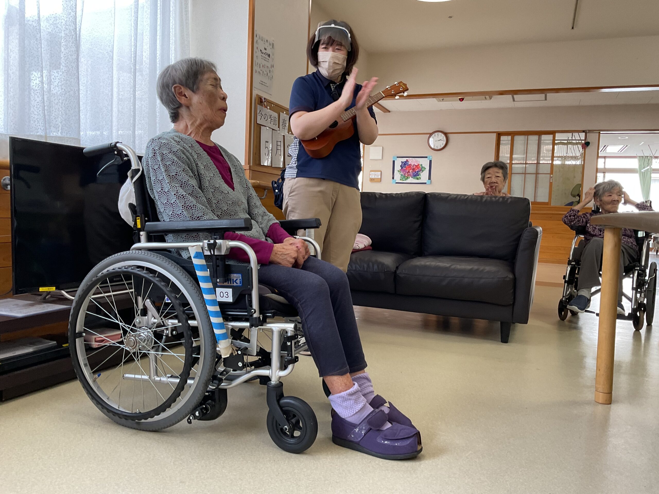 職員のウクレレ伴奏に合わせて「ハッピー・バースデー」を歌い、皆様と職員一同でお祝いさせていただきました。