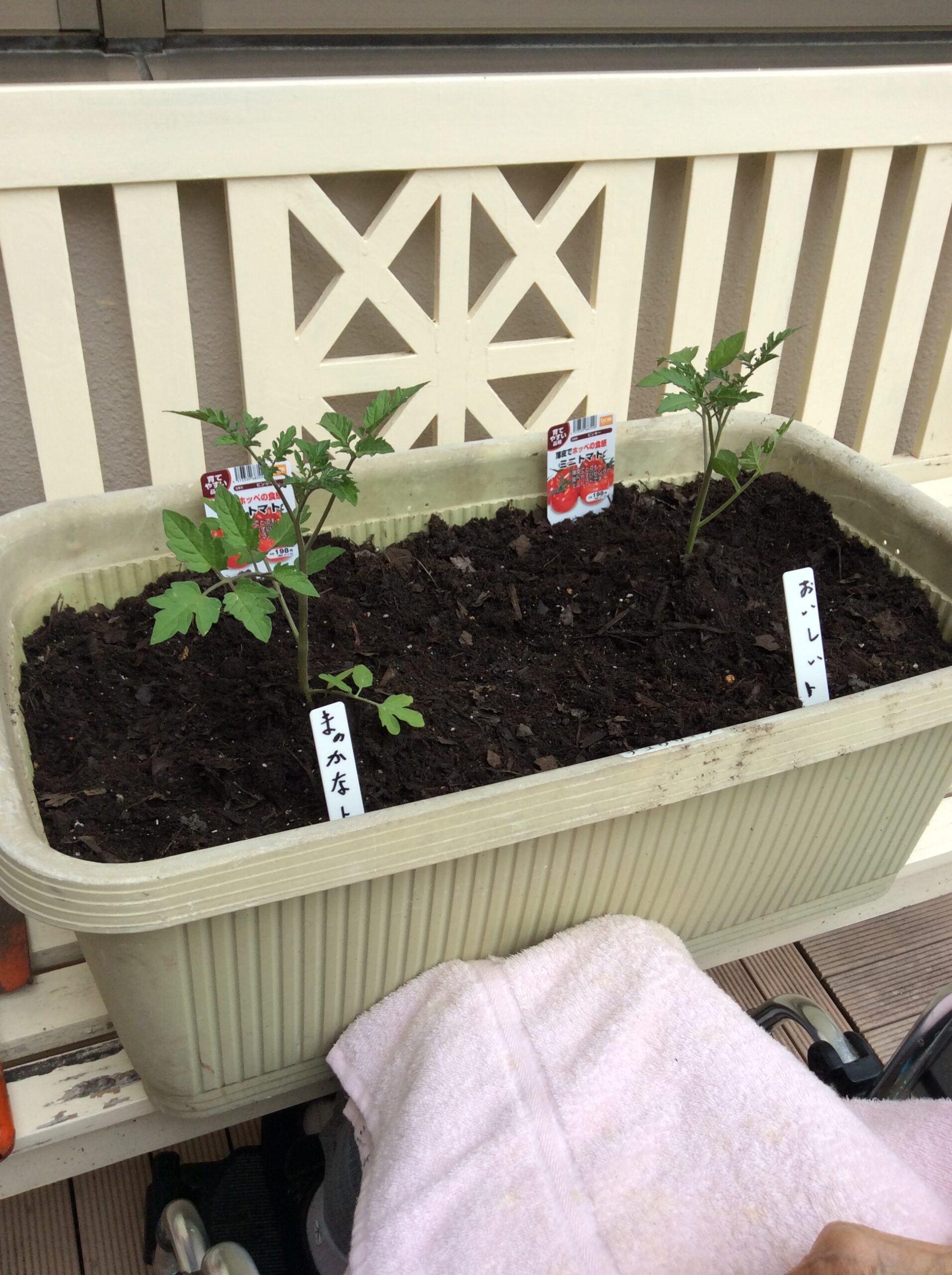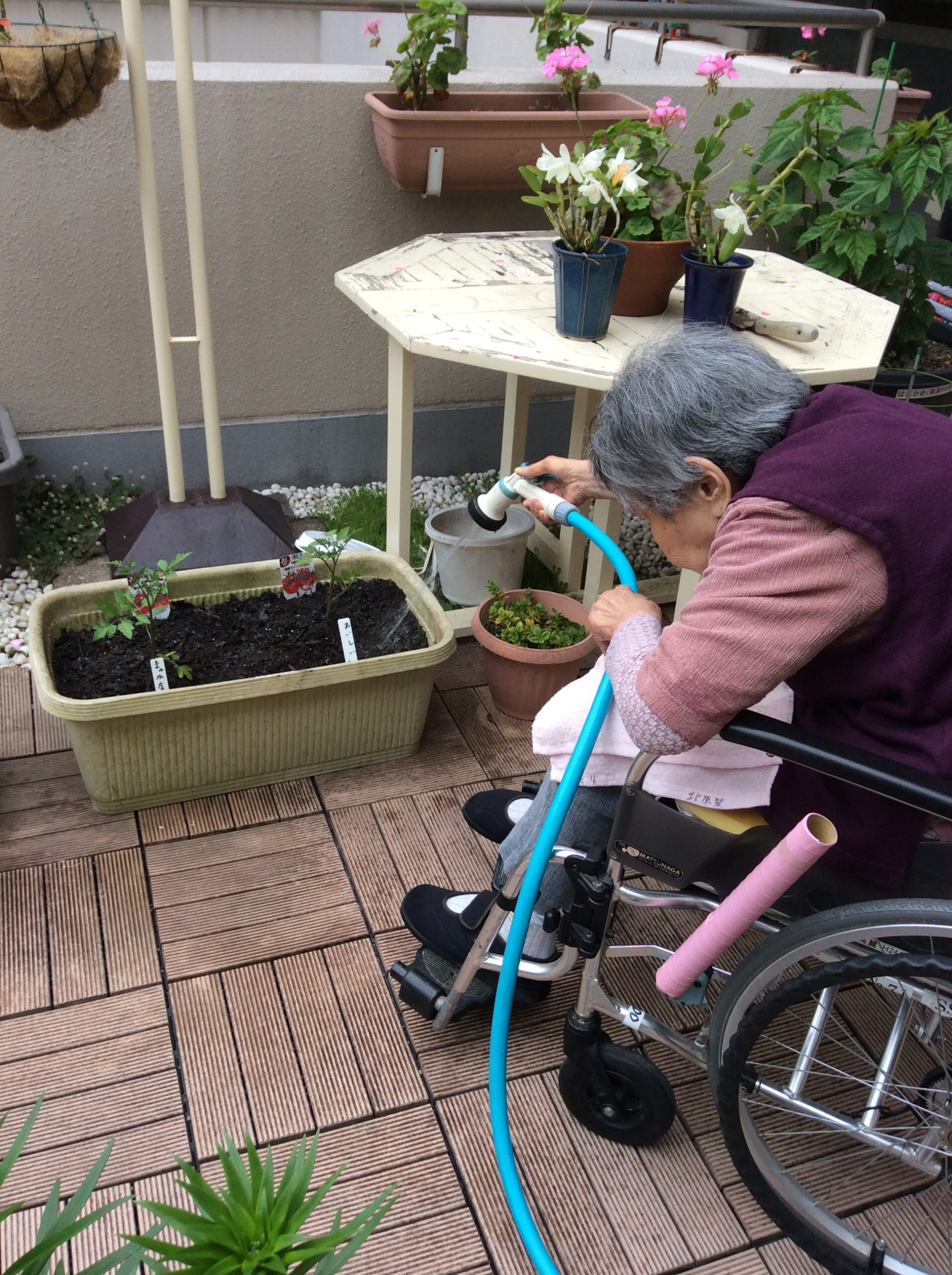 中には足の状態の悪いお客様もおり、車椅子上でかがんで作業するのはお客様にとって負担となるため、プランターを台に置きお客様の高さに合わせて作業をしました。