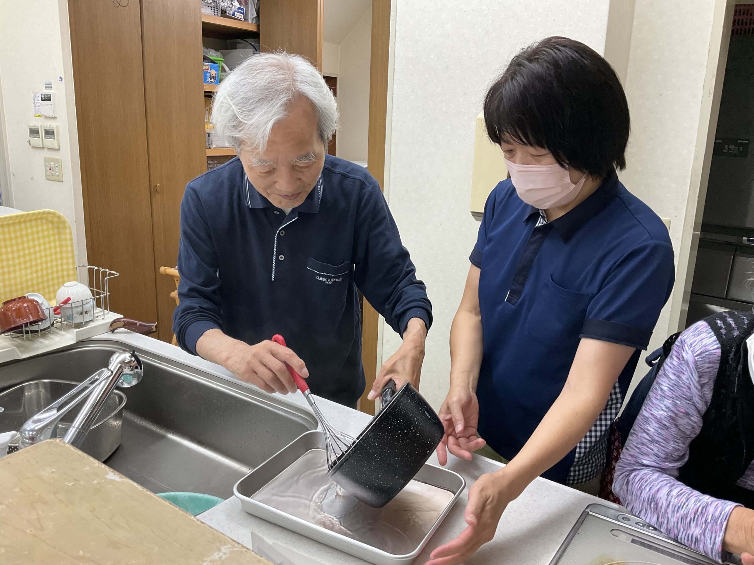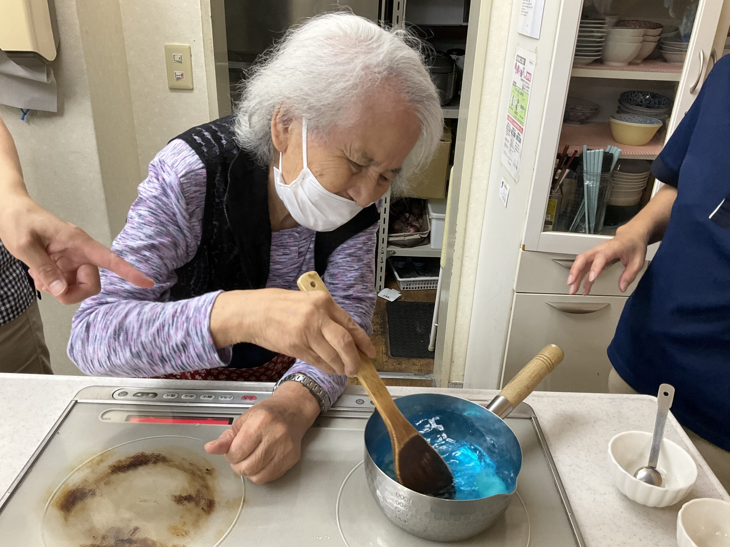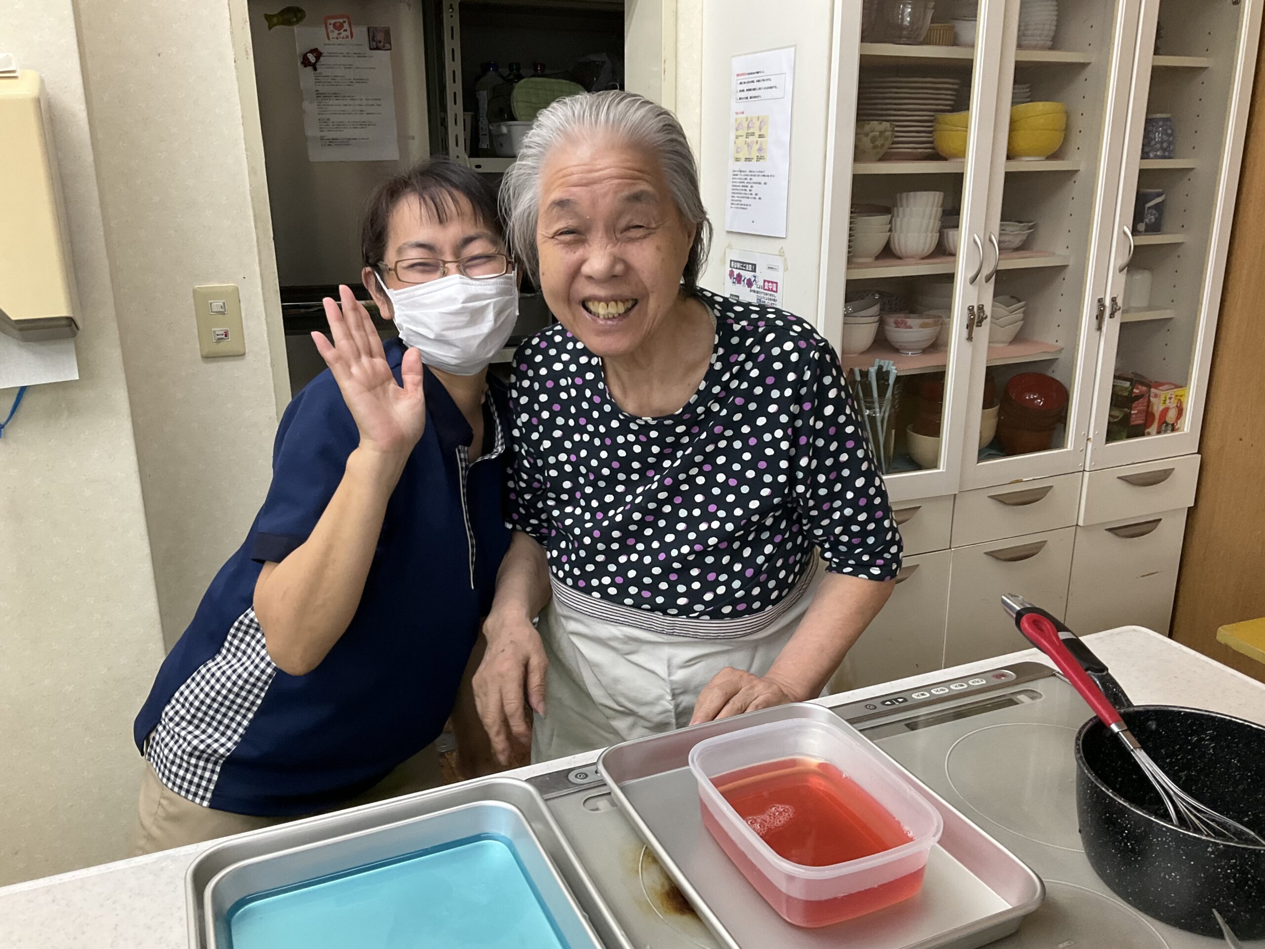 と銘打って、あじさいに見立てたゼリー作りを調理レクリエーションとして催しました。