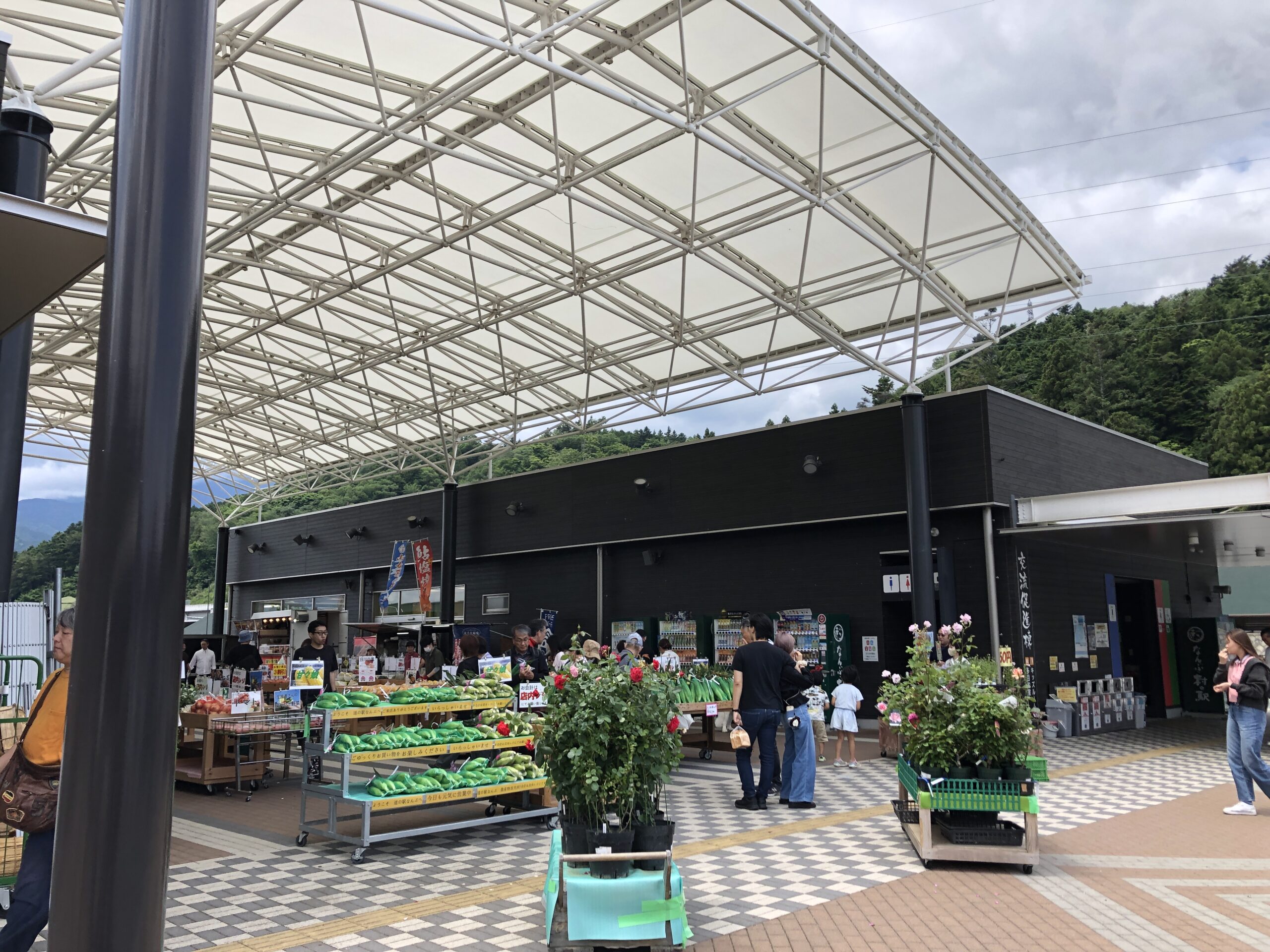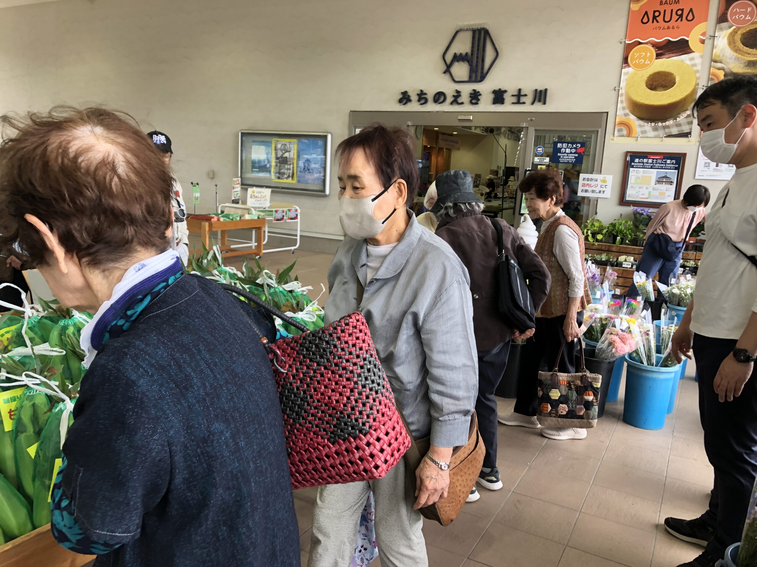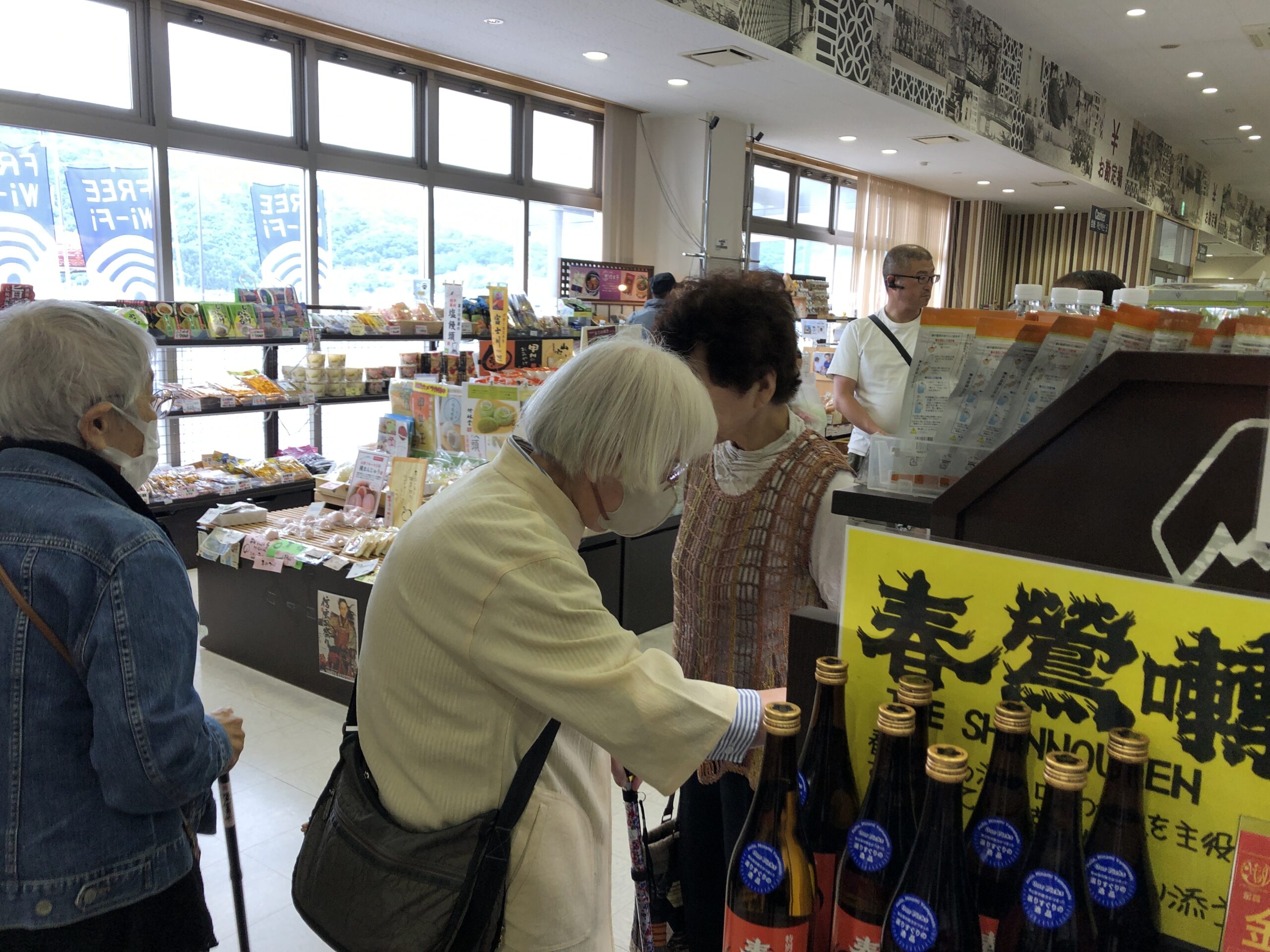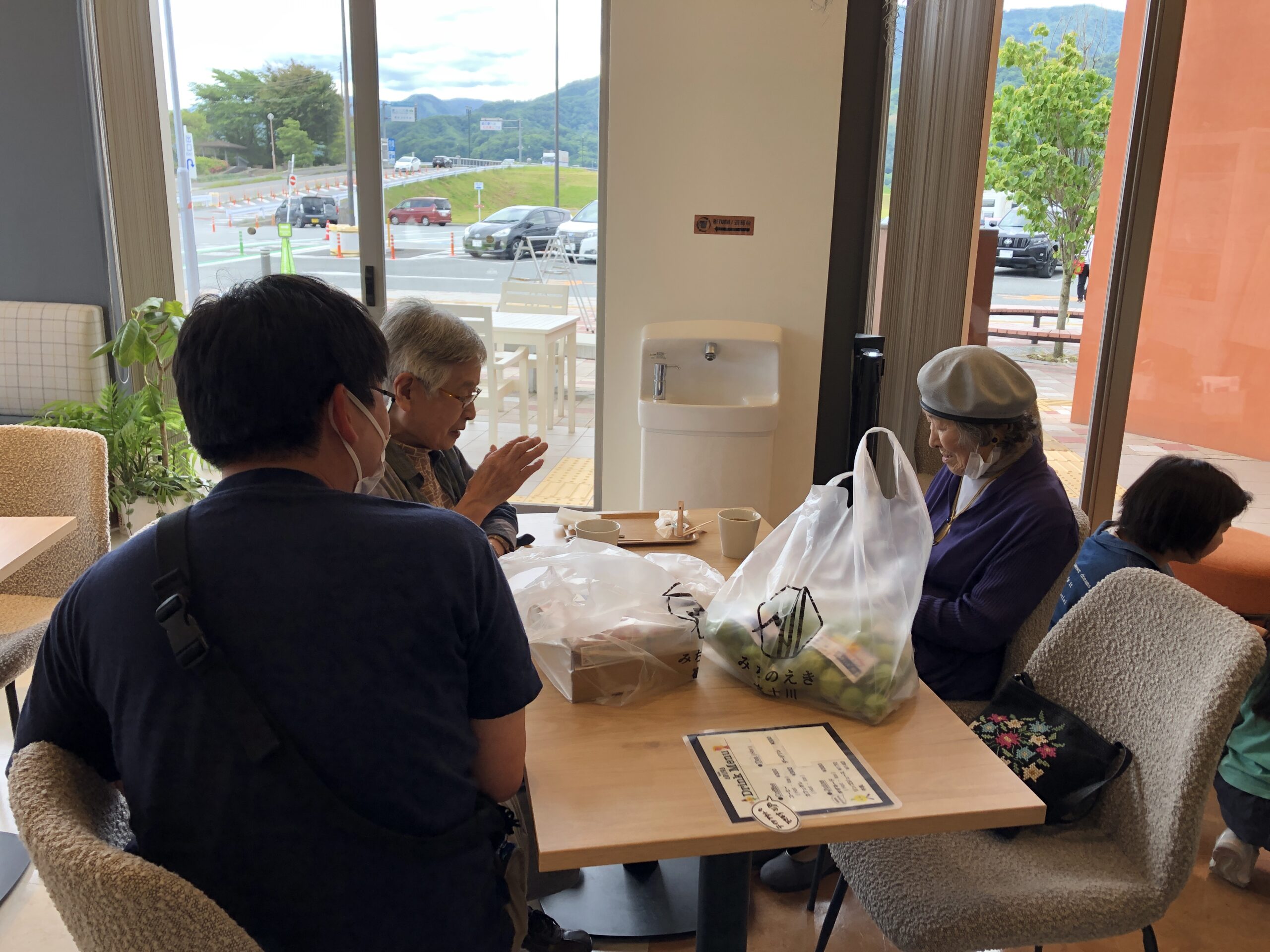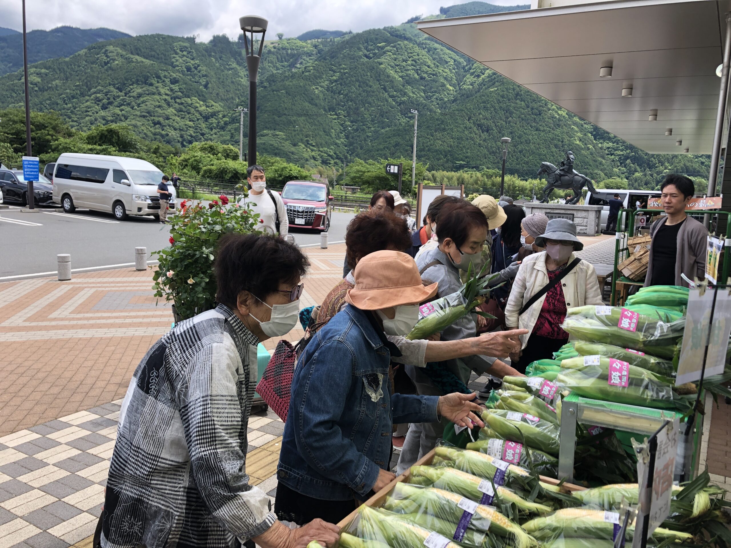 目的地へ到着するとトウモロコシやたけのこ、さくらんぼ、トマトなどの地場産品やスイーツを吟味してお土産として購入されていました。