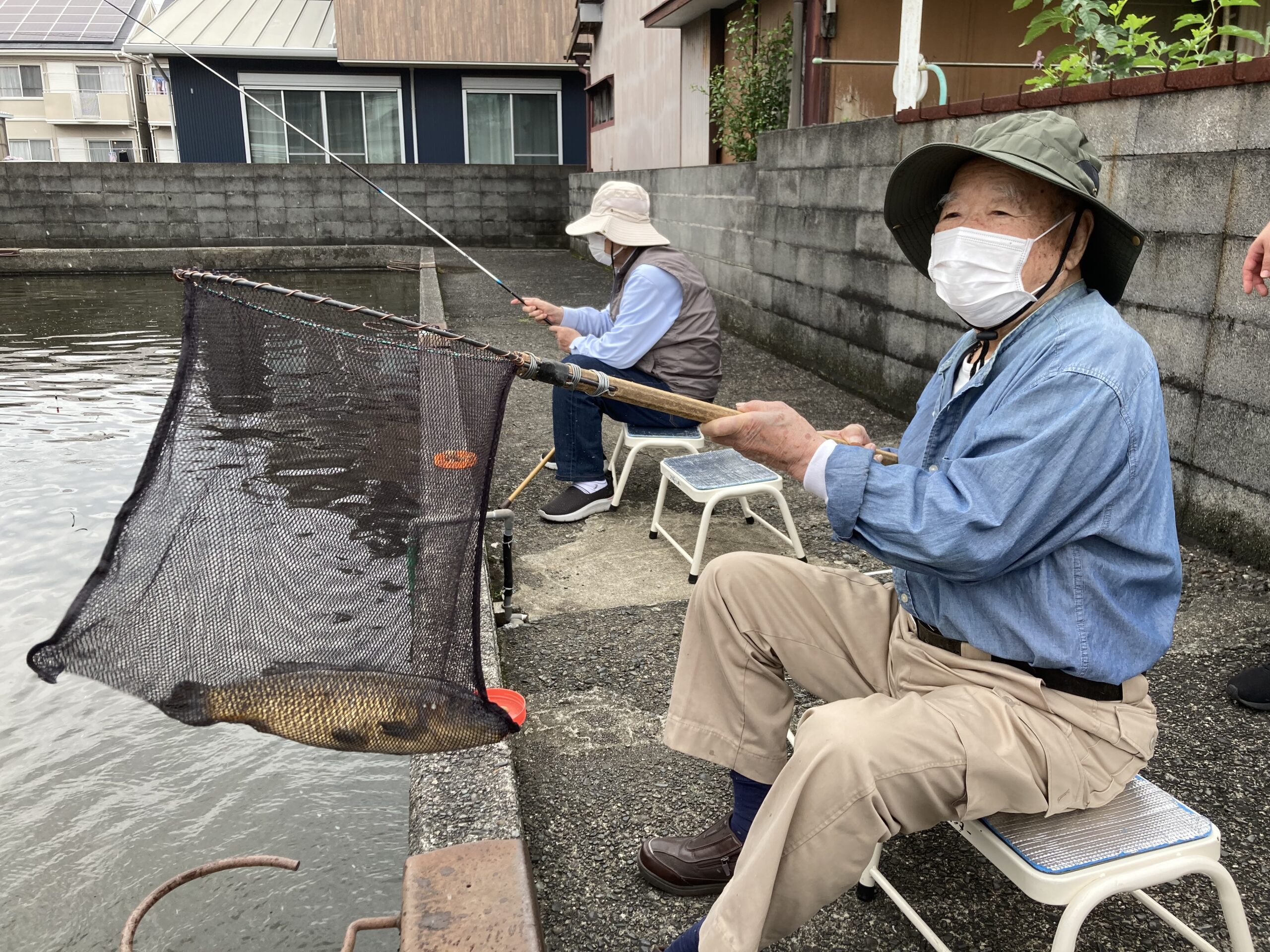 発案者のA様99歳。釣りが趣味です。B様も釣りが趣味でデイをご利用当初、釣りに行きたいと介護計画書に上がっていた方。C様は元料理人。(今回は鯉なので料理はできませんが。)