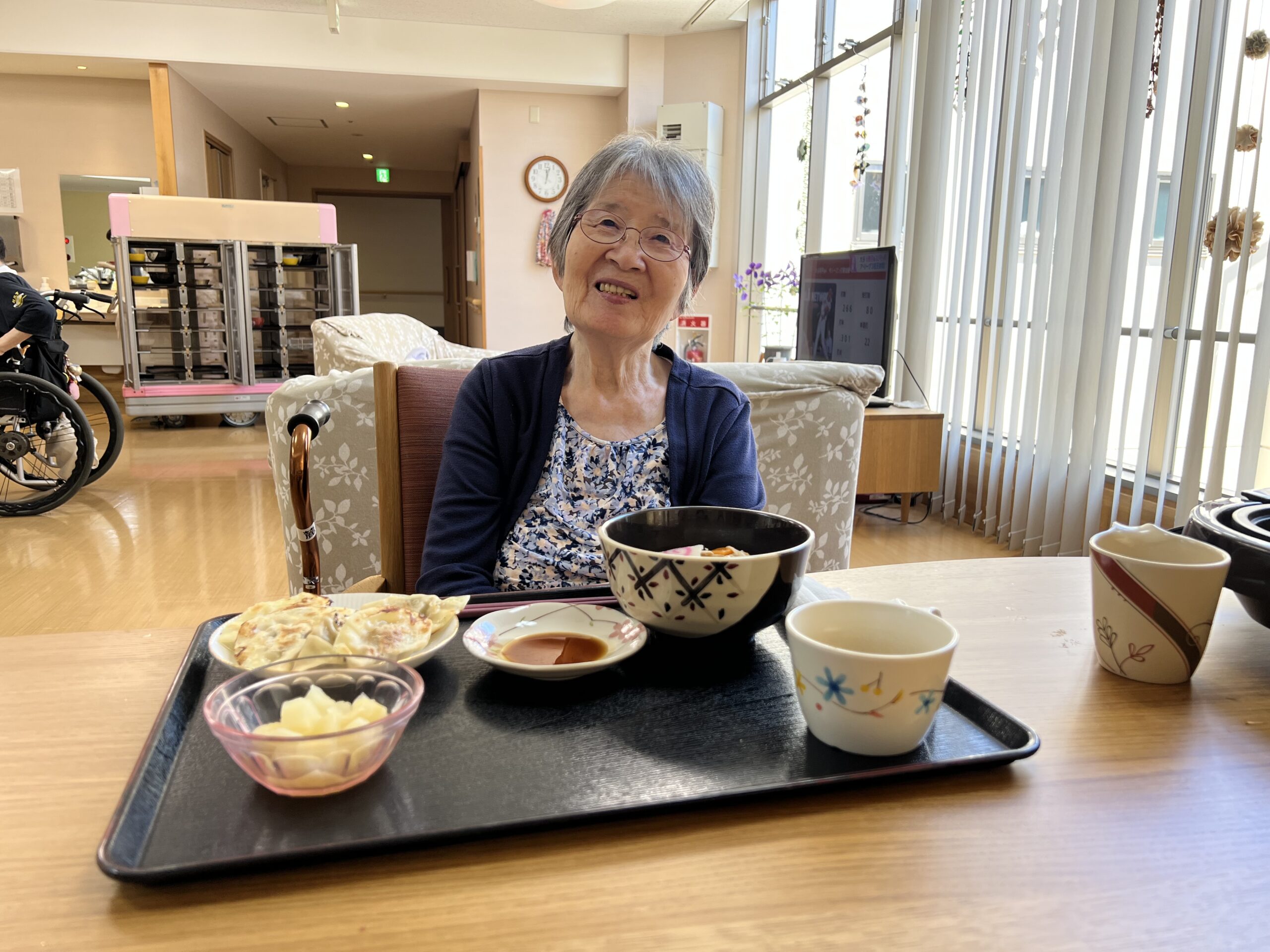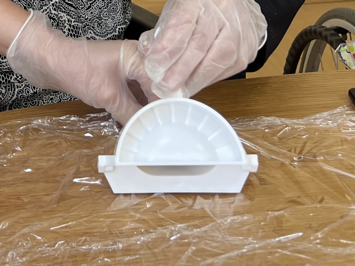 簡単に餃子を包める容器を使い、職員がサポートを少しすることで、餃子作りに参加することができました。
