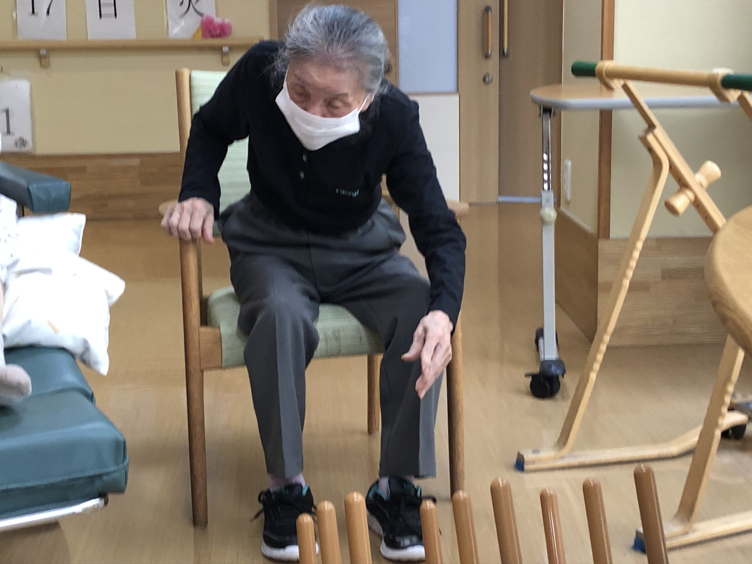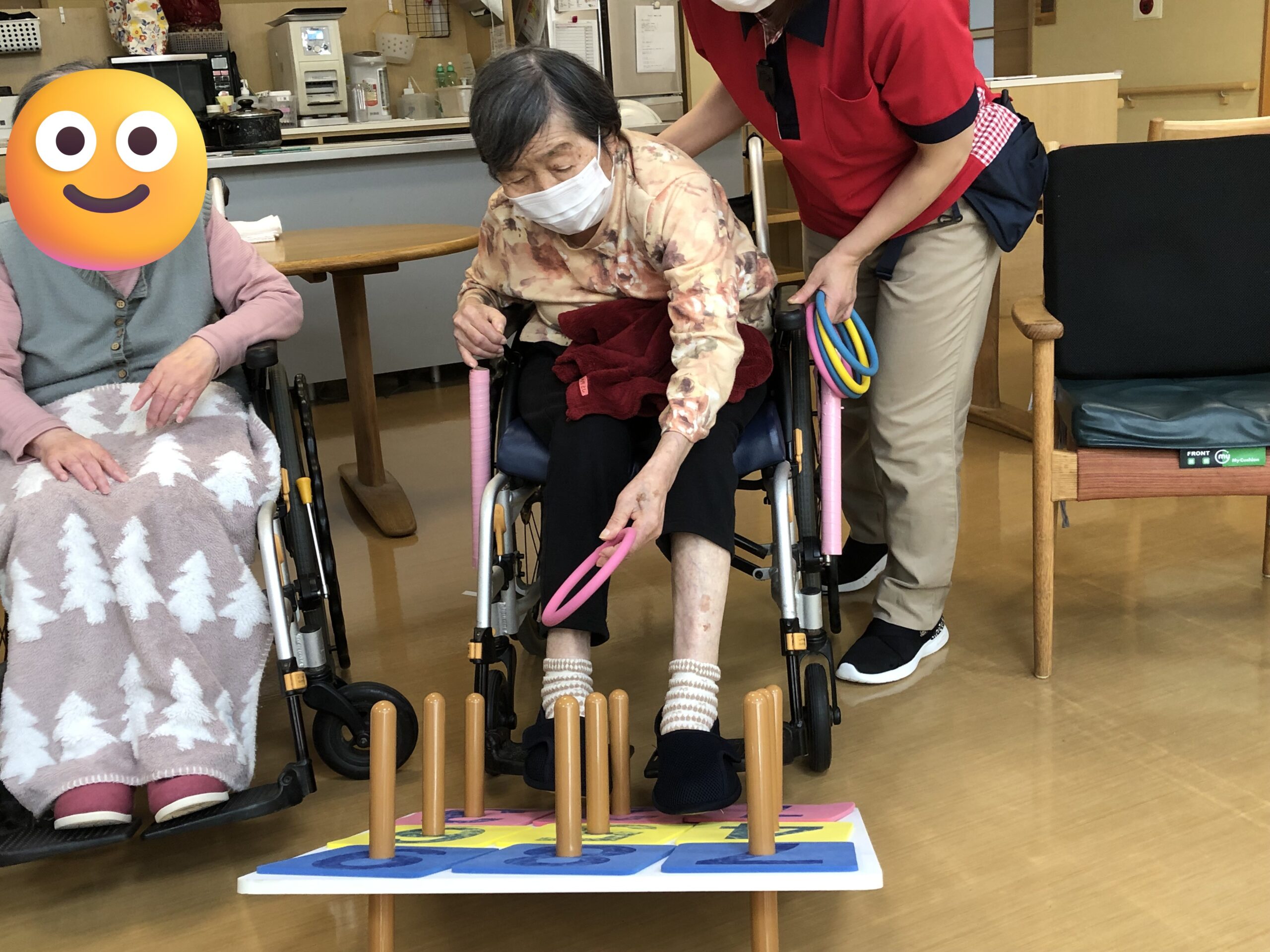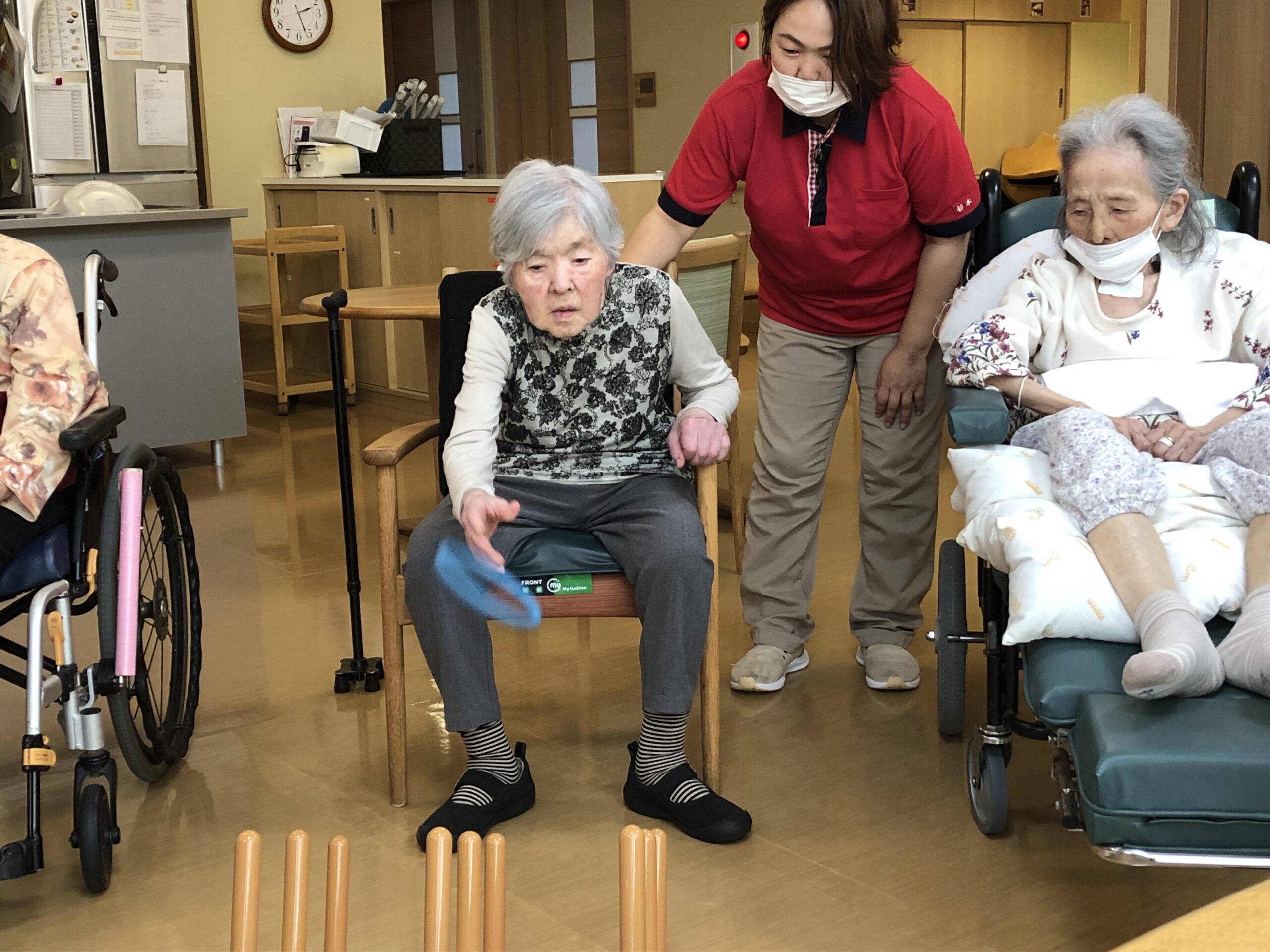 輪投げは体が不自由なお客様でも参加することができ、競争性もあって、皆さんで盛り上がれるレクの1つです。
