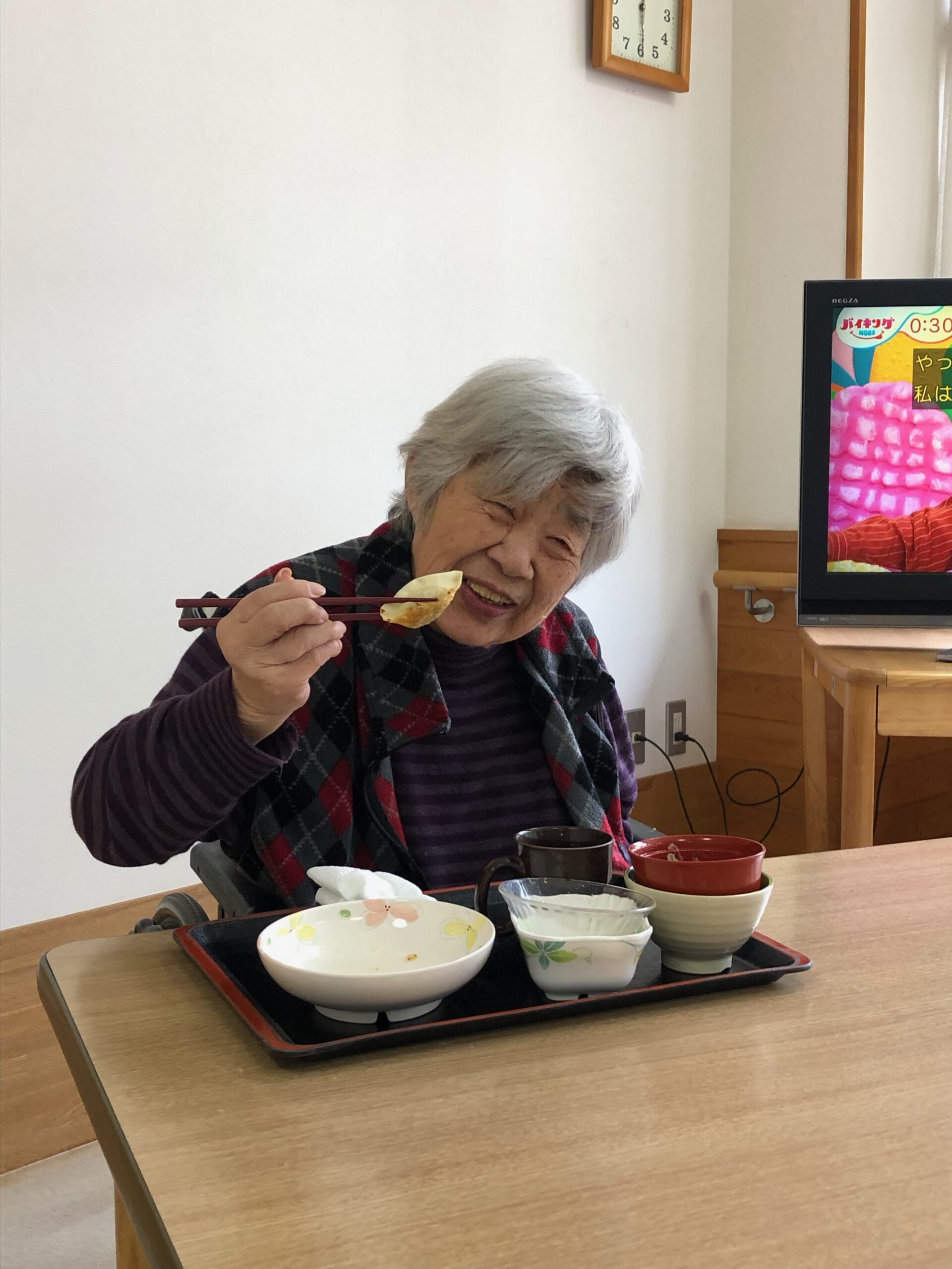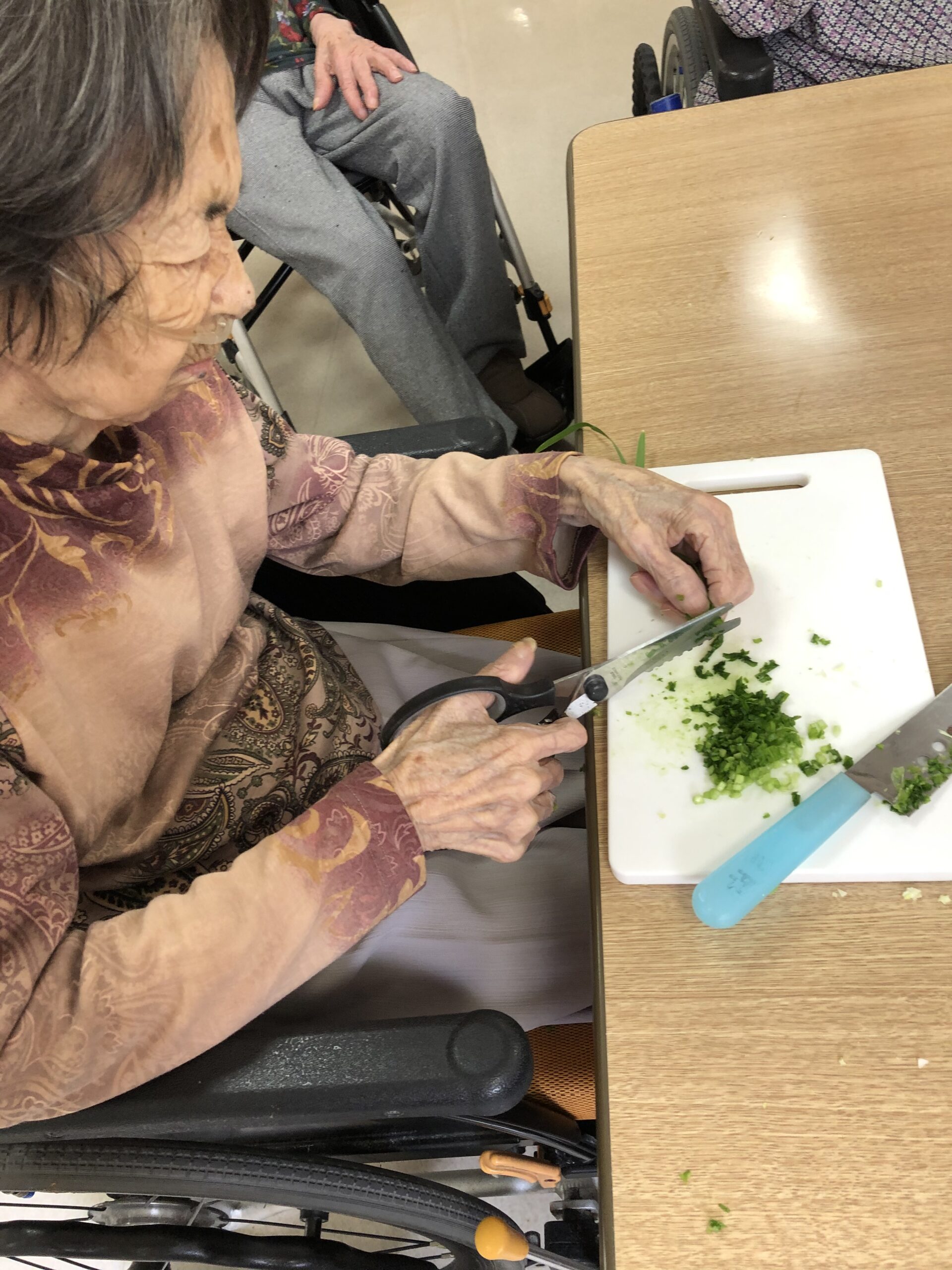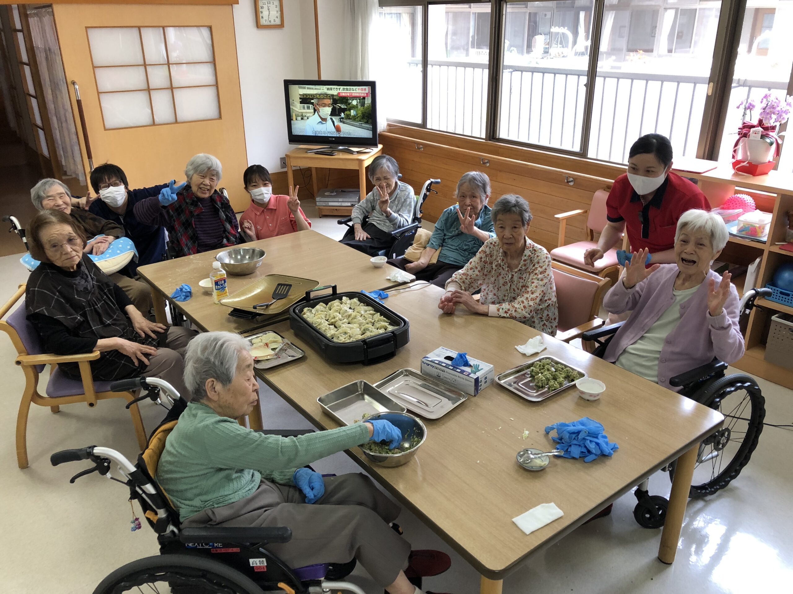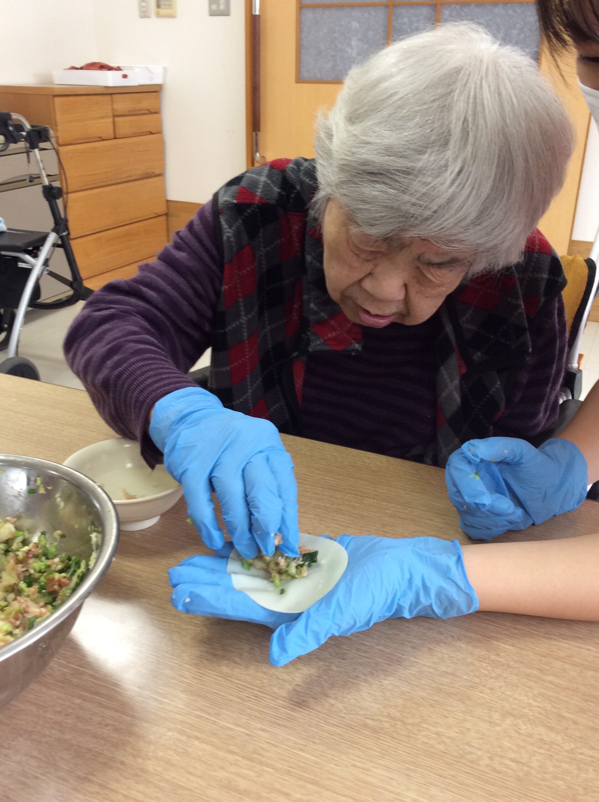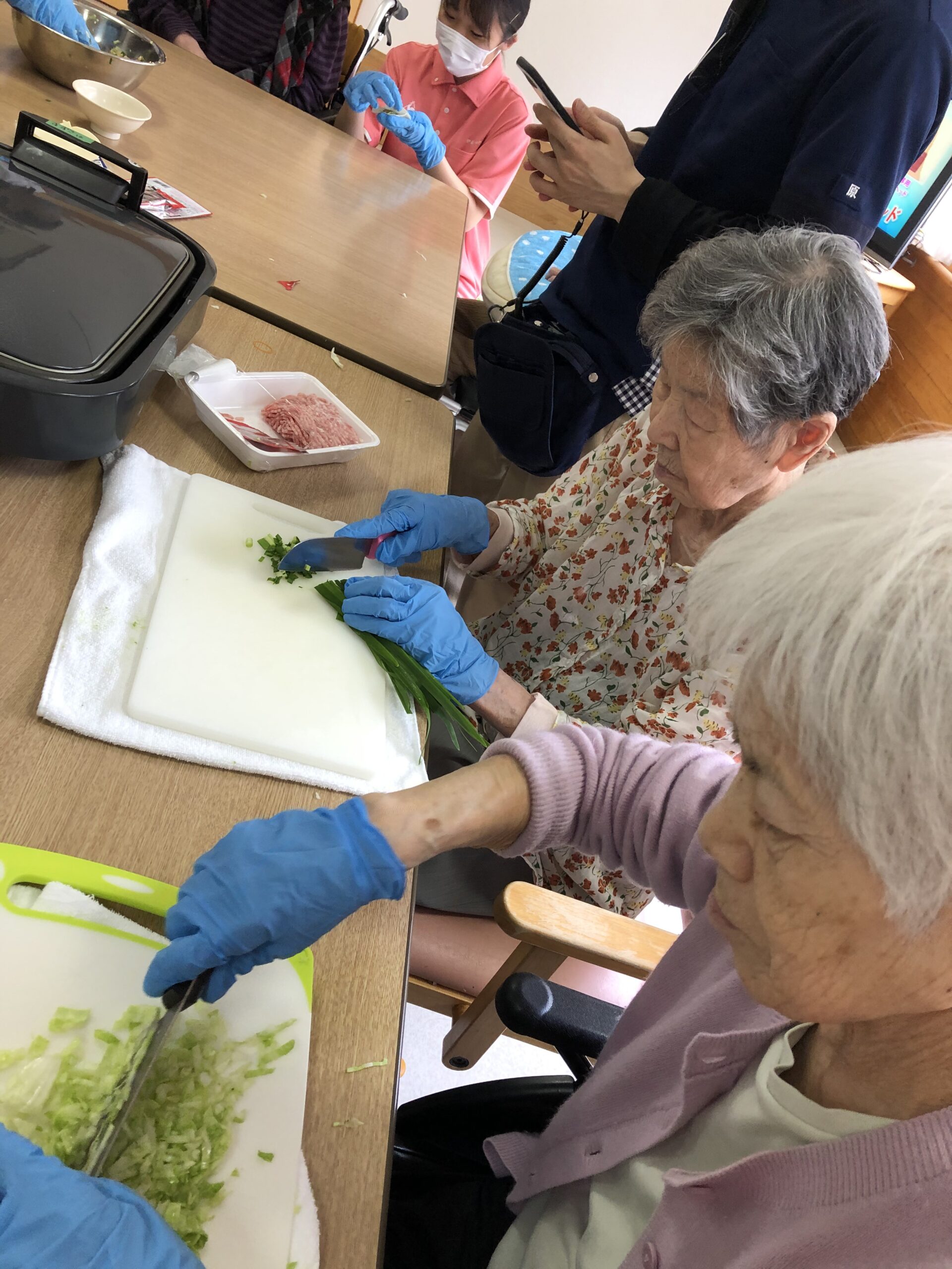今回の餃子作りは、日常生活の中で昔からやっていた”調理”をすることで自立支援につなげようという目的で、お客様にはニラという普段嗅がない匂いやご自身で作ったものを食べるということを楽しんでいただく企画です。
