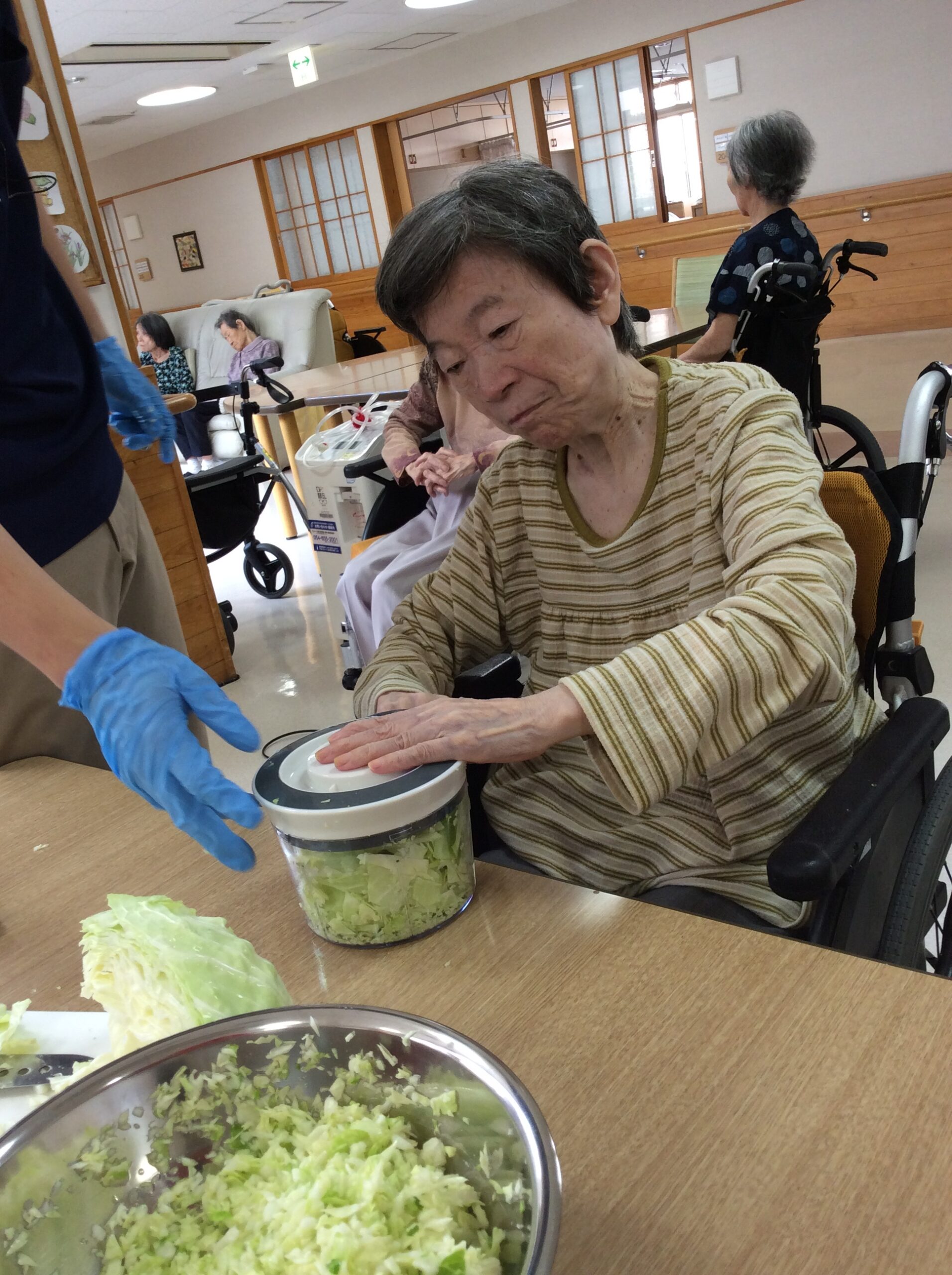 また片麻痺のお客様がみじん切りする際は、ハンドチョッパーという持ち手を引っ張るだけで簡単にみじん切りができる調理器具を使うことで上手に切ることができ、餃子の皮包みではテーブルに腕をのせることで上手に餃子を包むことができました。