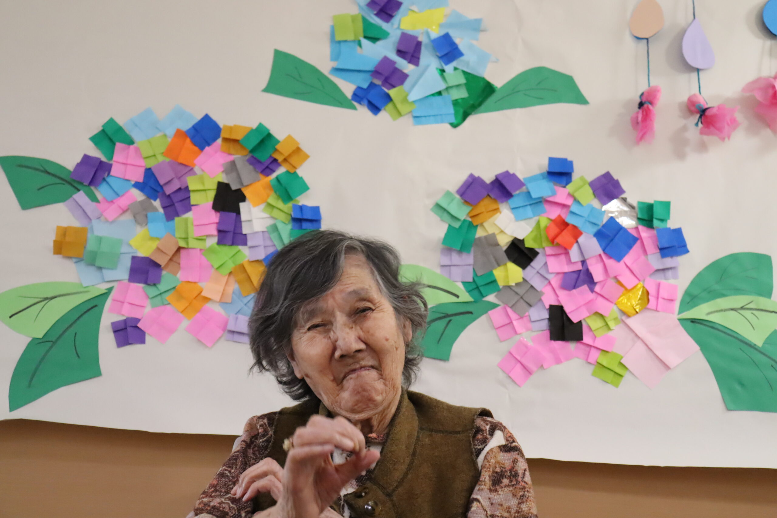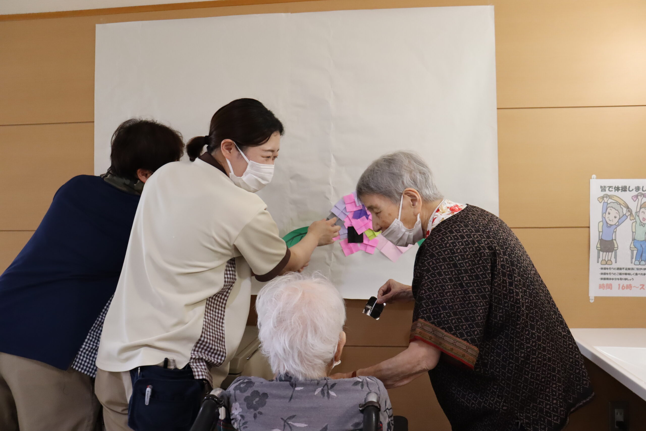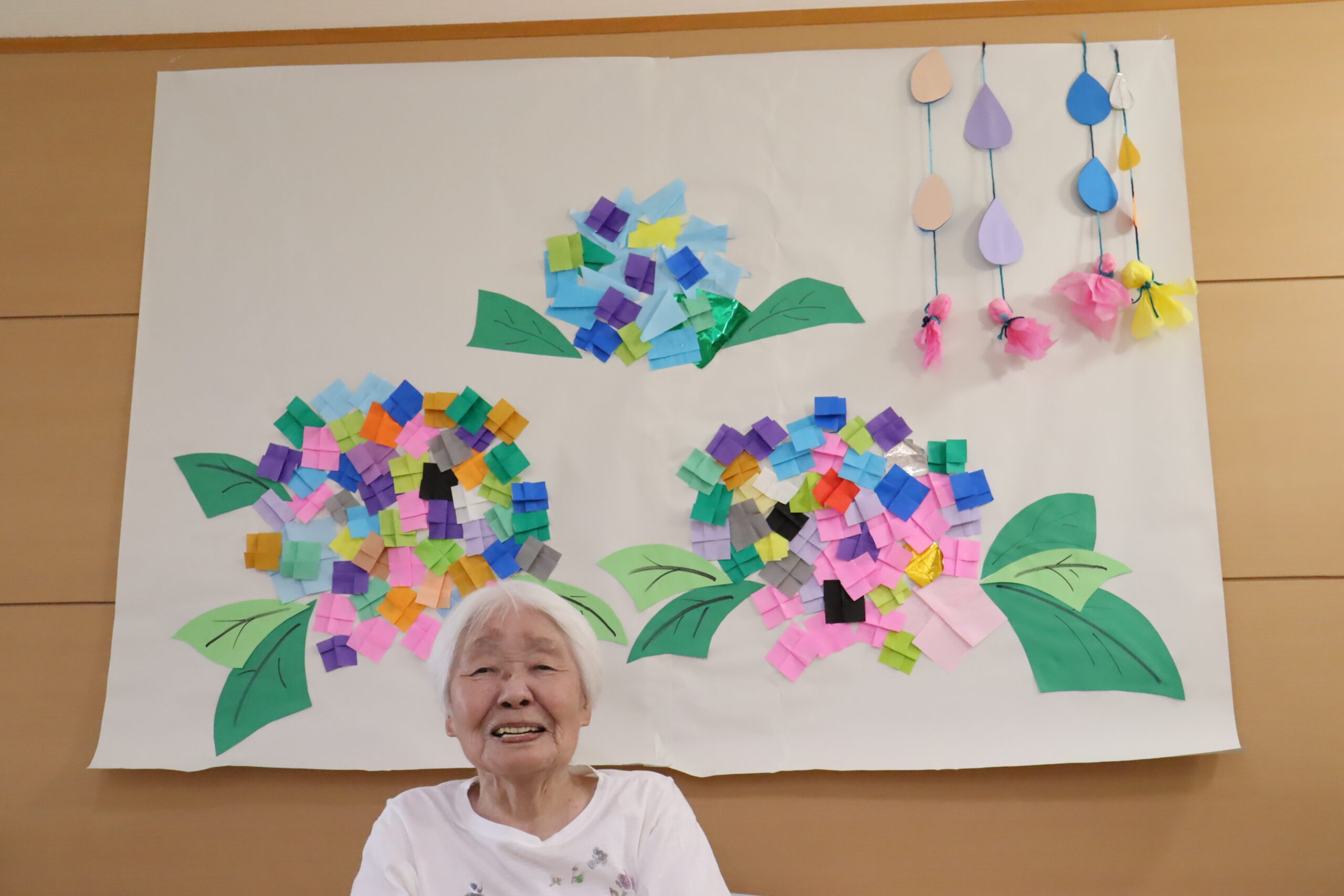 普段、飲食のレクリエーションが多いため、今回は趣向を変え6月に合わせた紫陽花の壁画をお客様と一緒に製作しました。