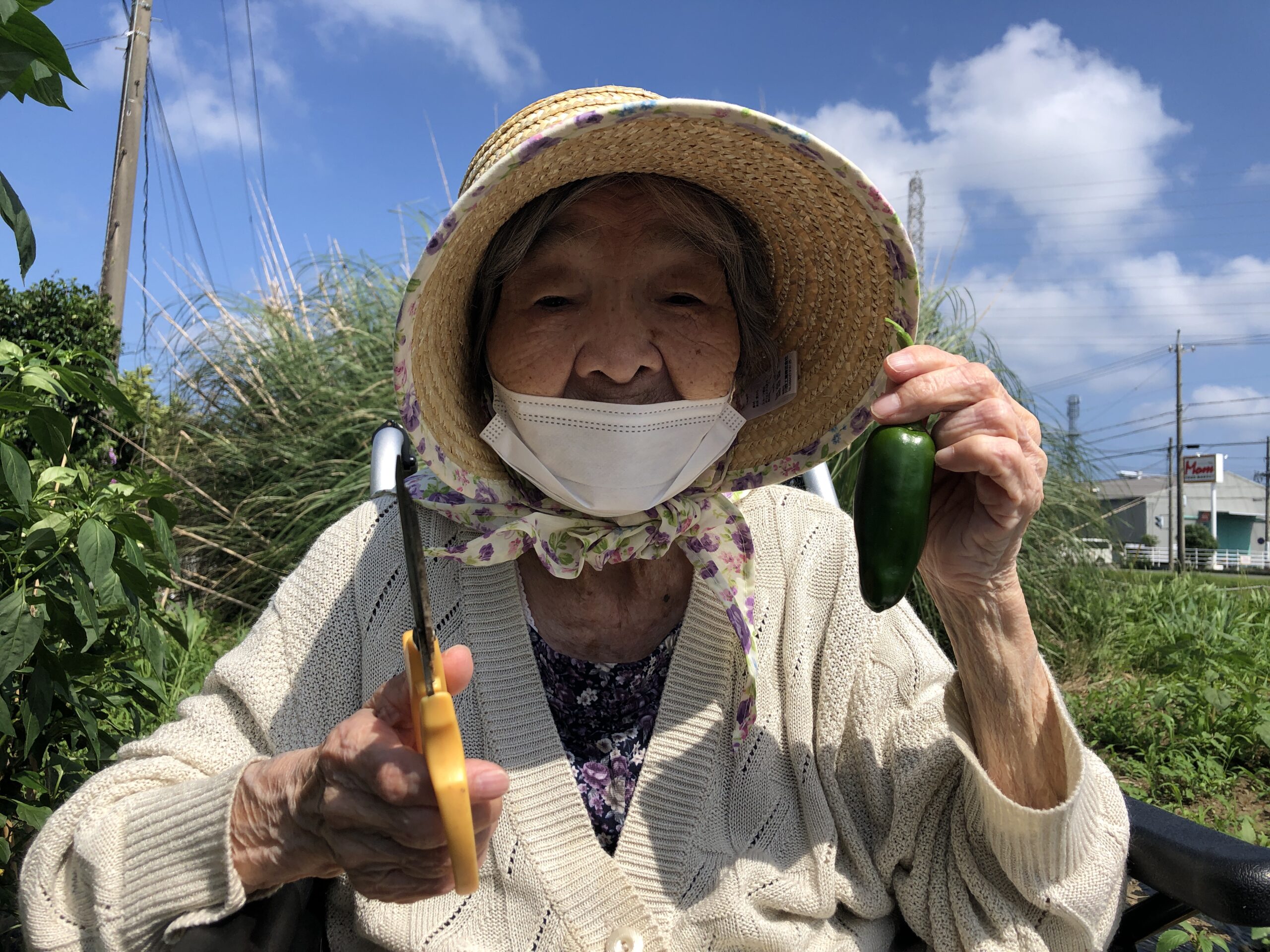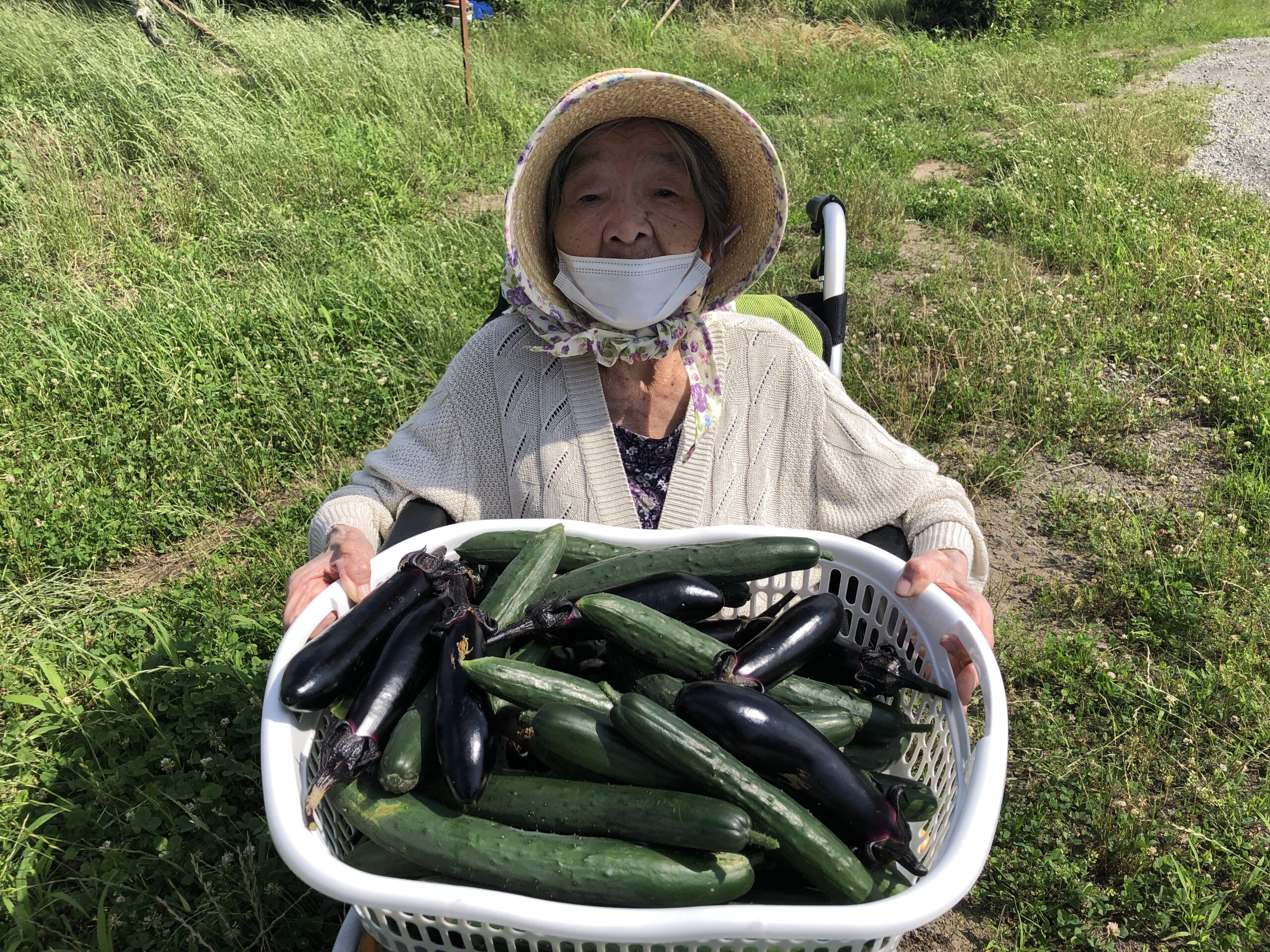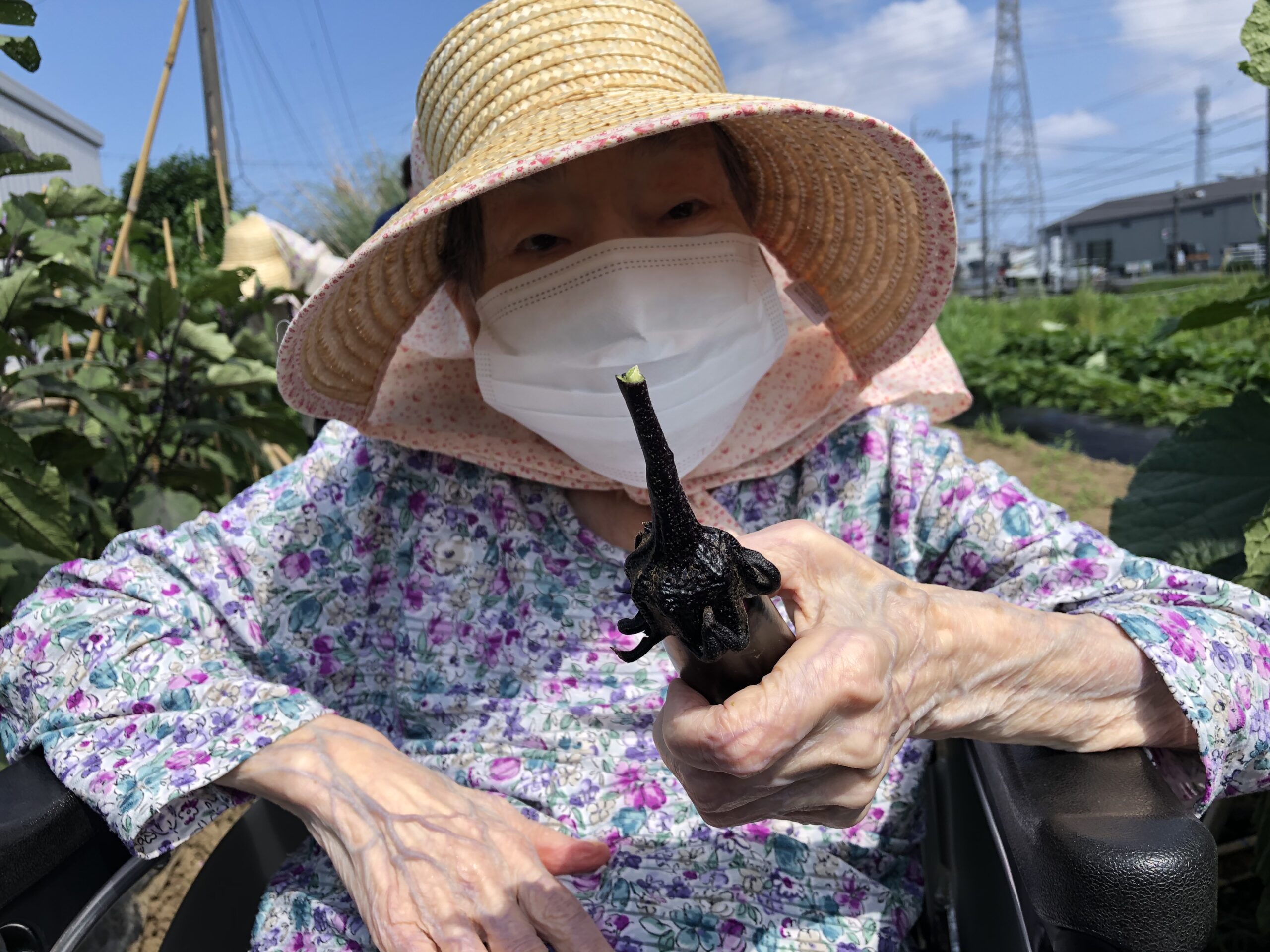 同行したお客様は歩行ができる方でしたので、ハサミもご自分で持たれ、美味しい野菜はどれかな?と吟味しながらも苗の奥の方まで足を運び、手を伸ばして収穫されていました。