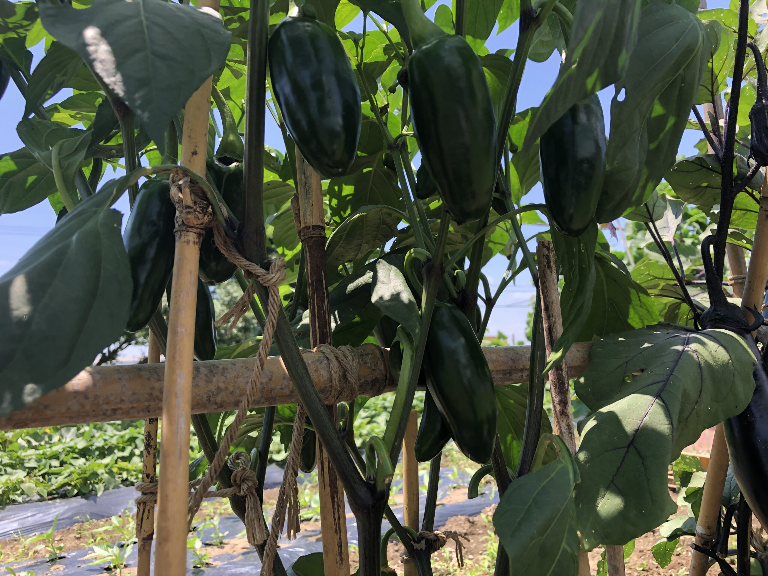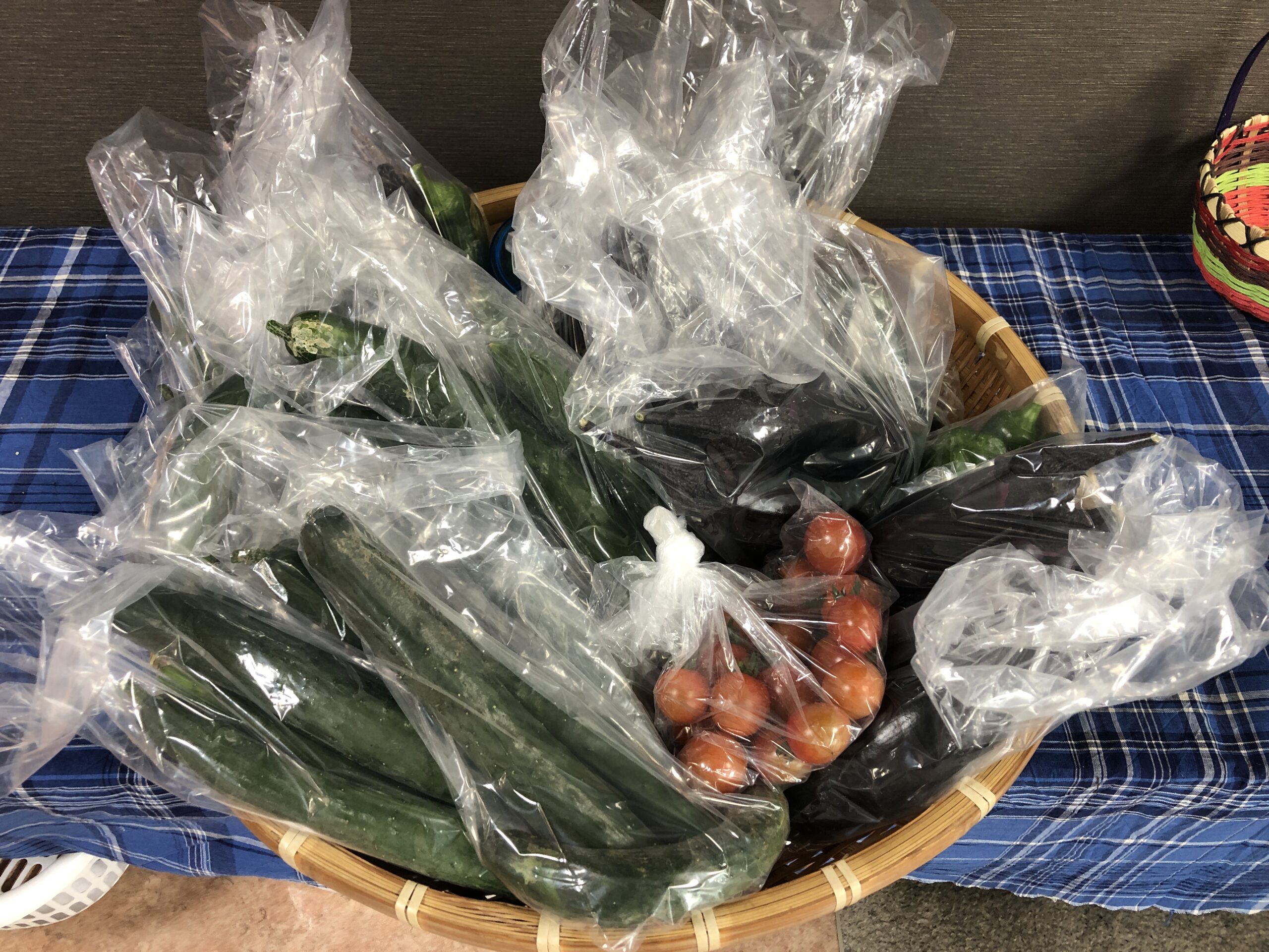 6月の浦田農園はなす、トマト、きゅうり、おくらを収穫しました。