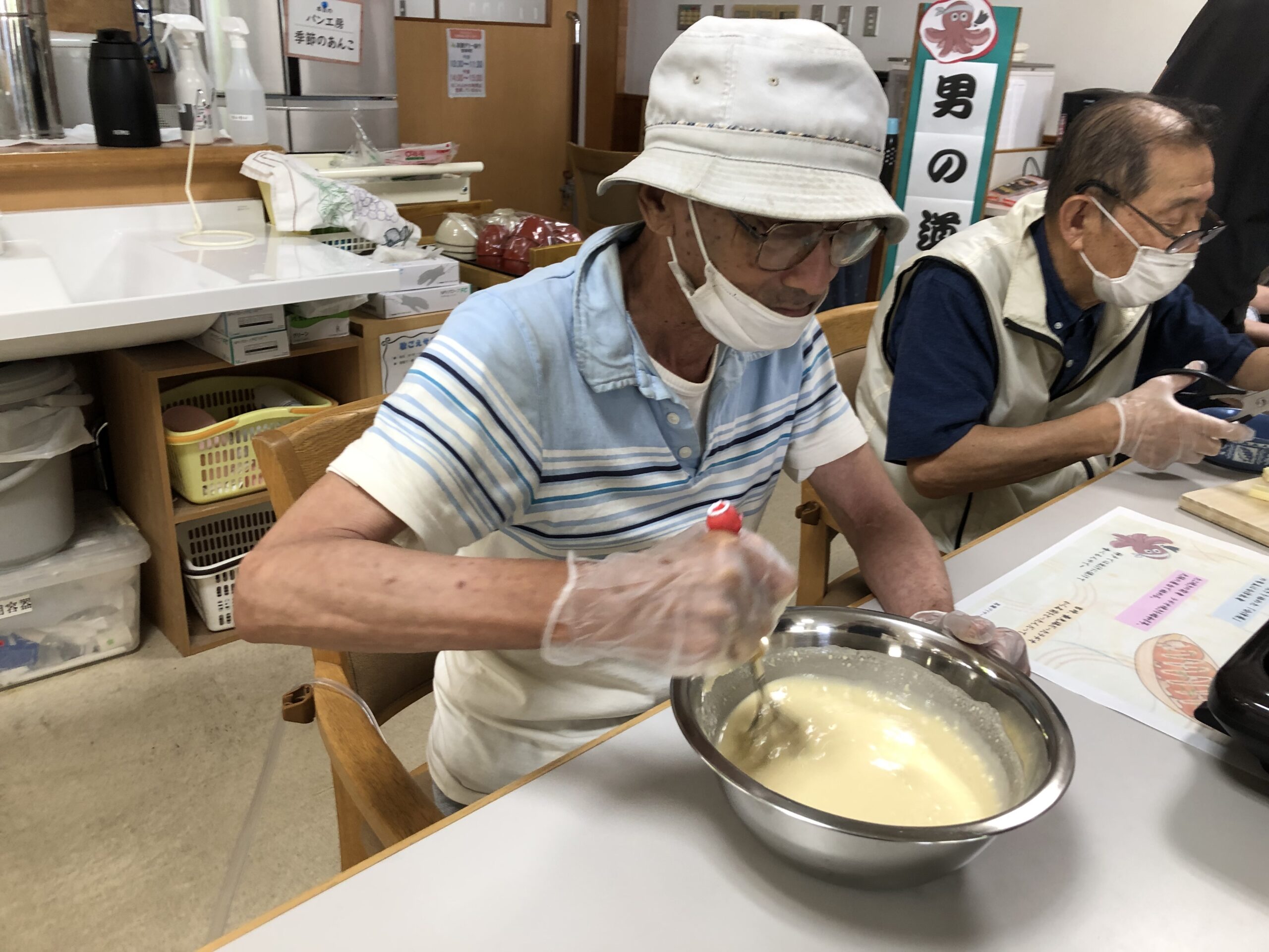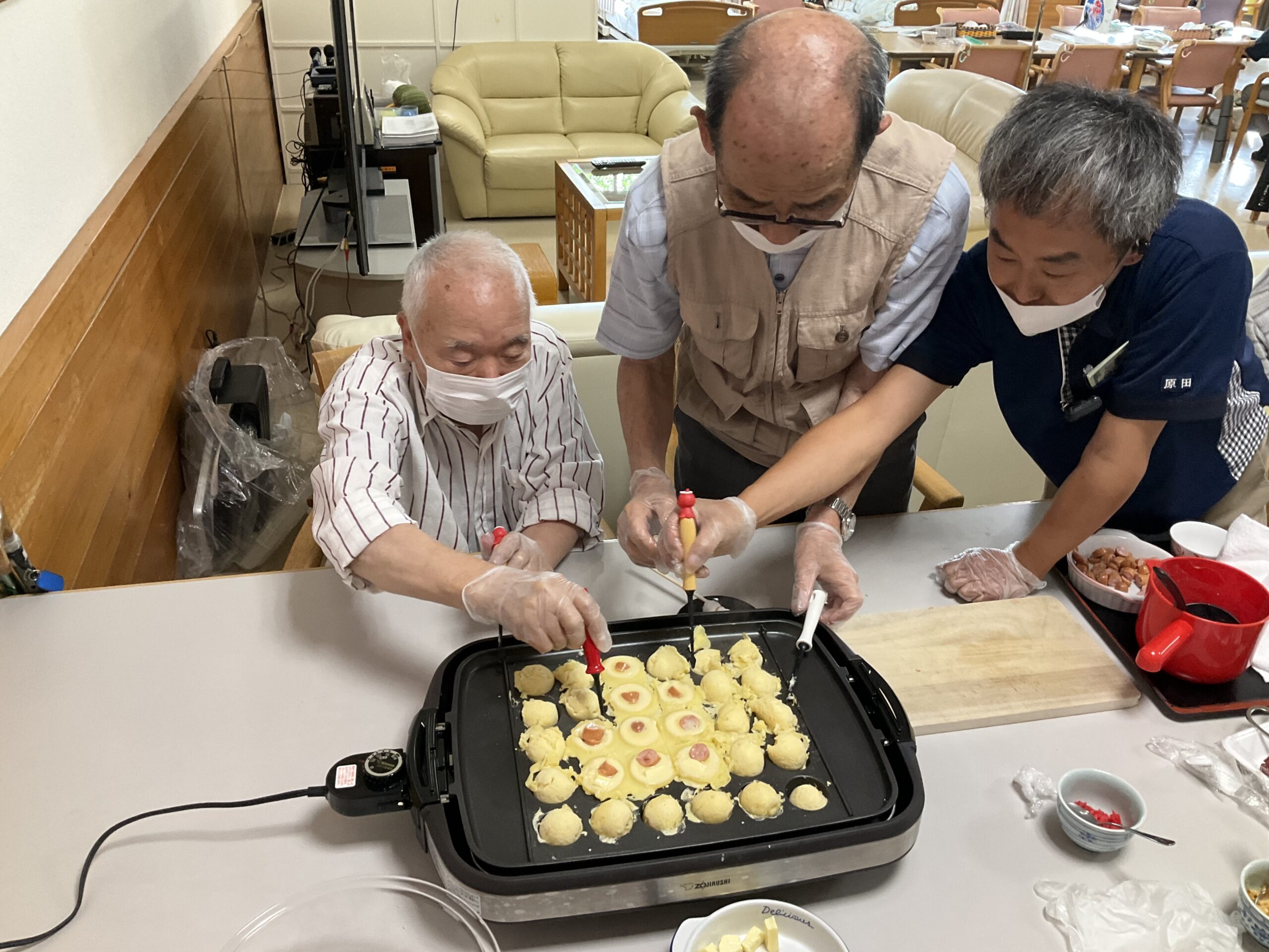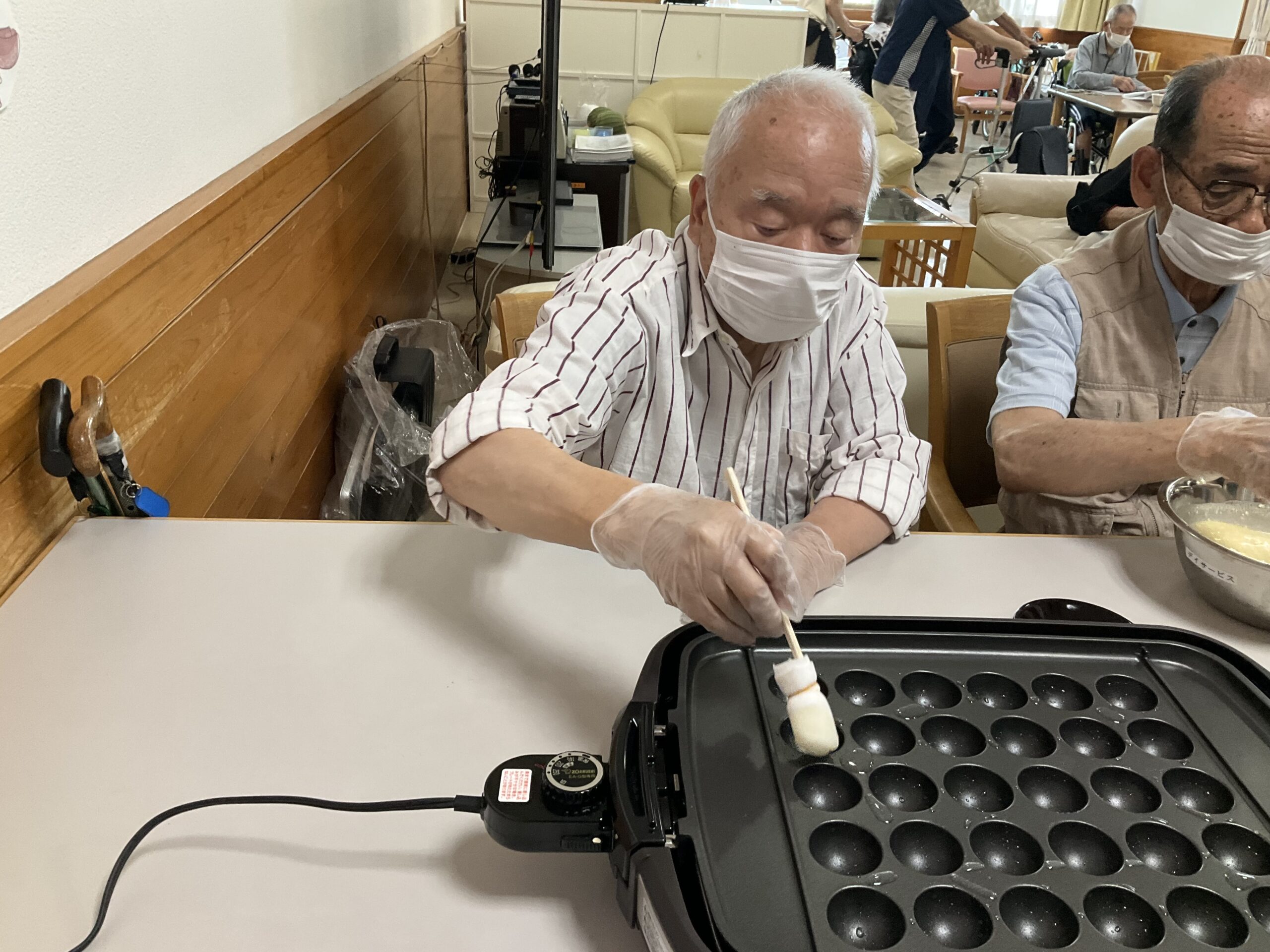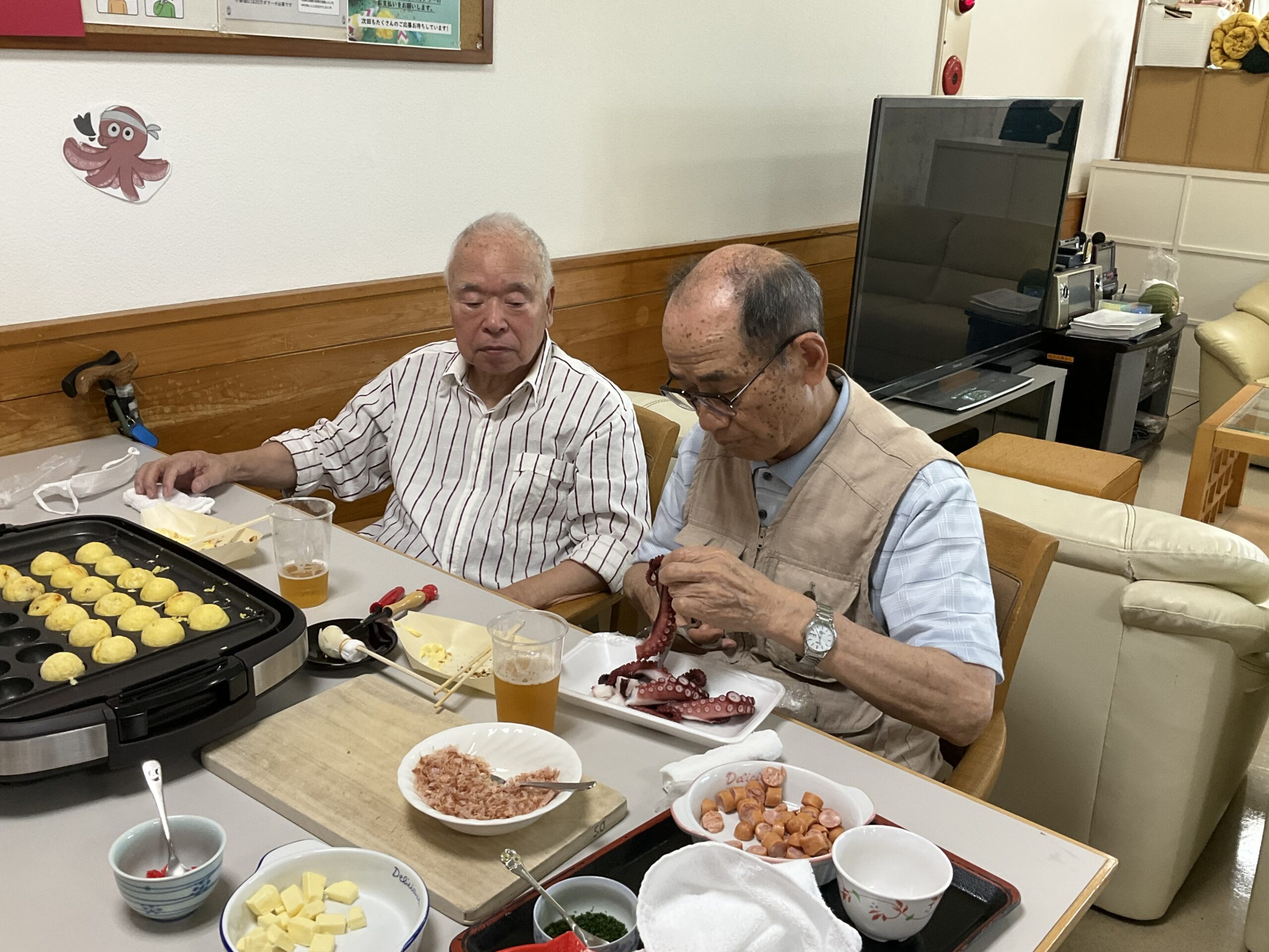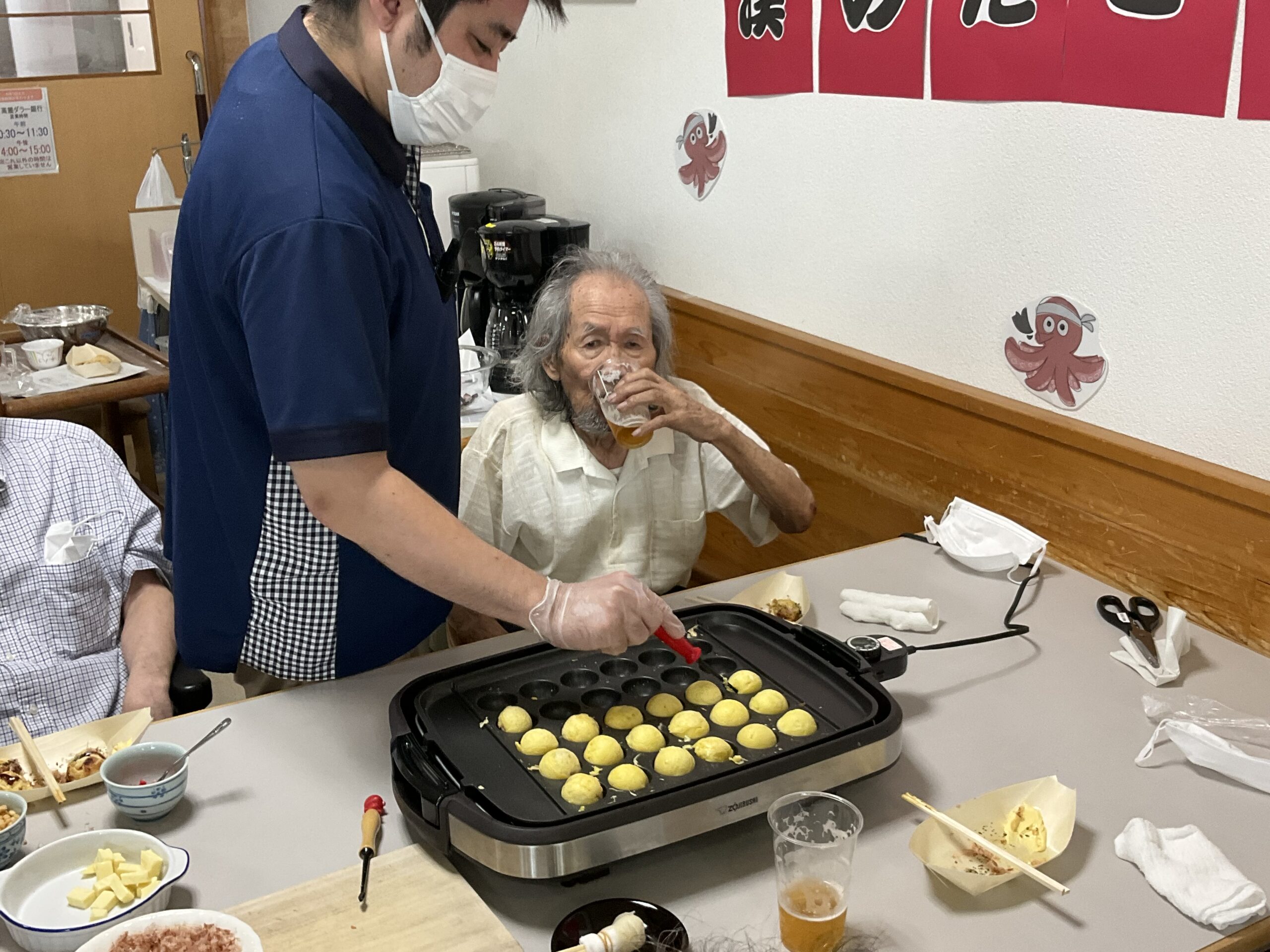 活動の一つに、男性のお客様を対象にした「漢の〇〇シリーズ」があり、7月はたこ焼き大会を実施しました。