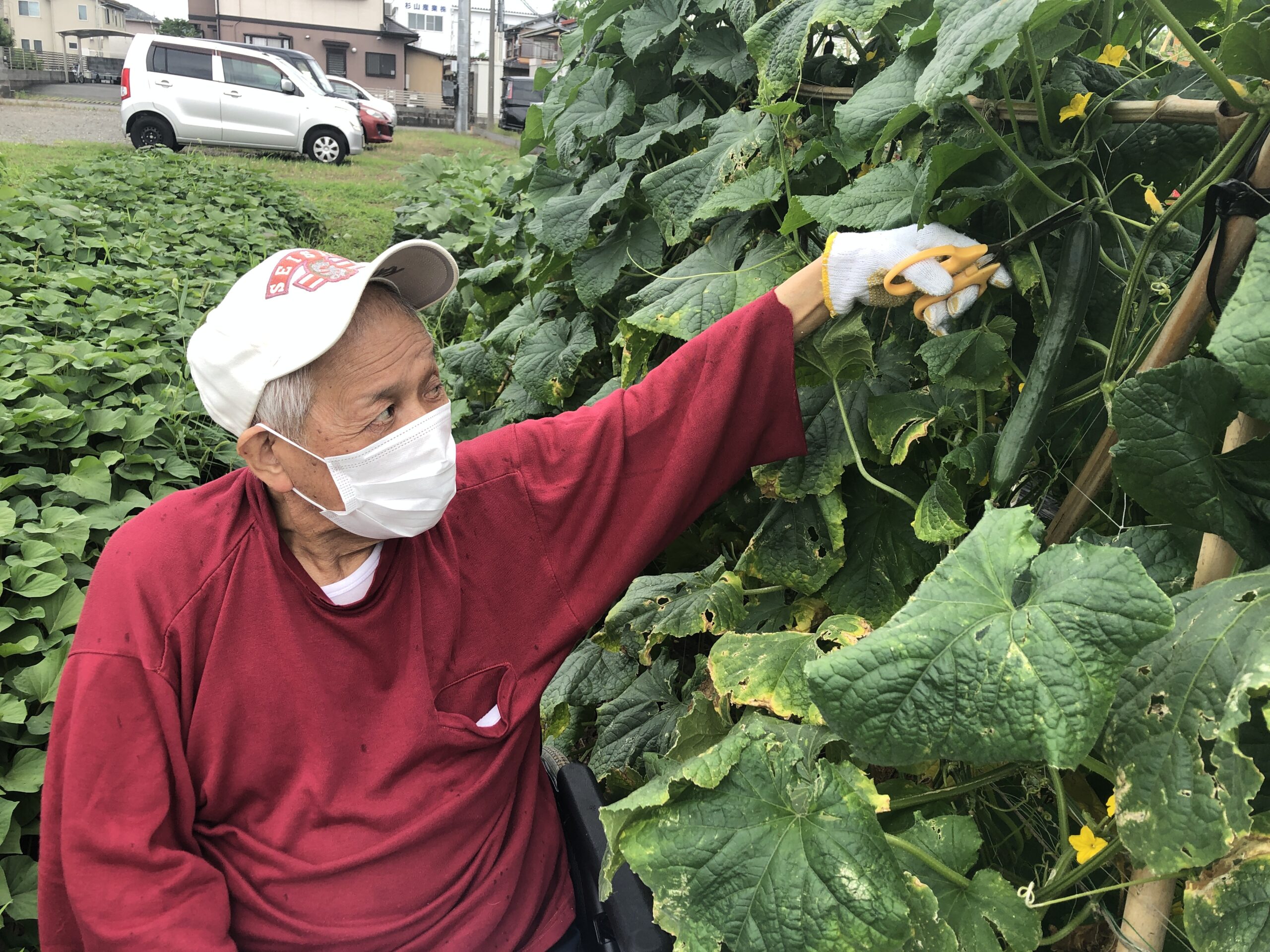 「きゅうりとナスは塩で揉んで食べるのが一番だね」とリクエストも。収穫の時はいつも会話が弾みます。
