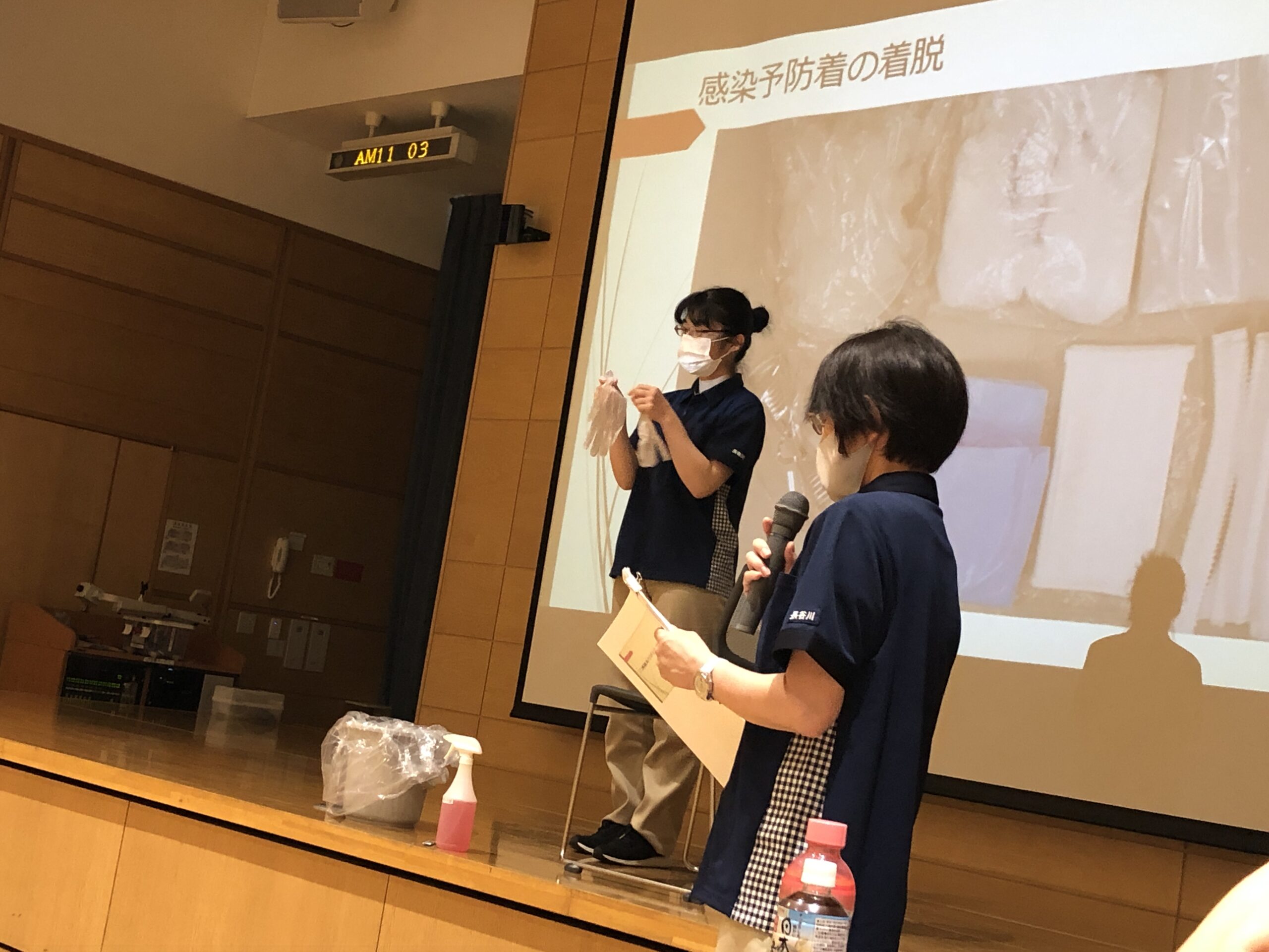 講座で最初にお話しさせていただいたのは感染予防着の着脱方法についてです。