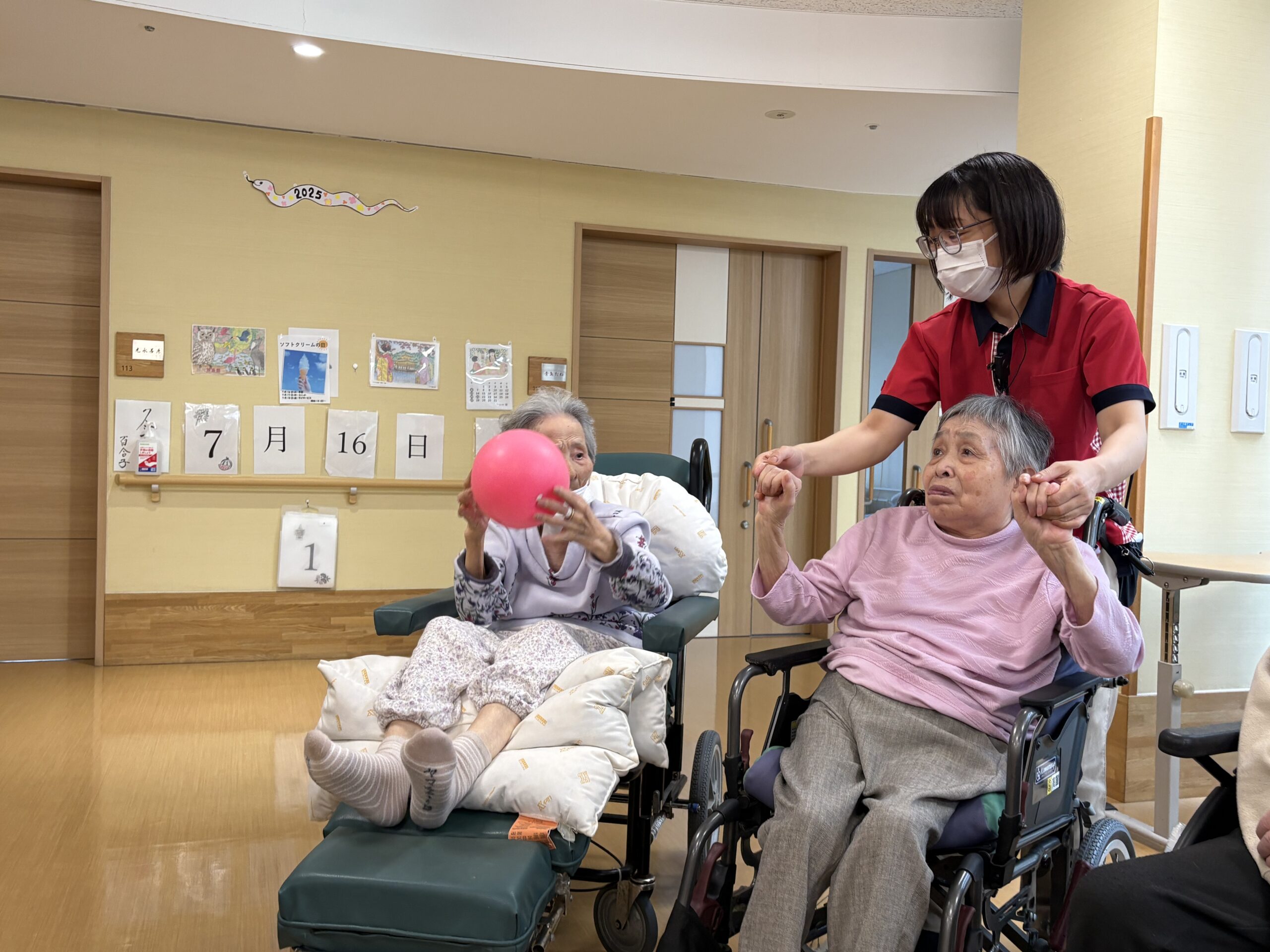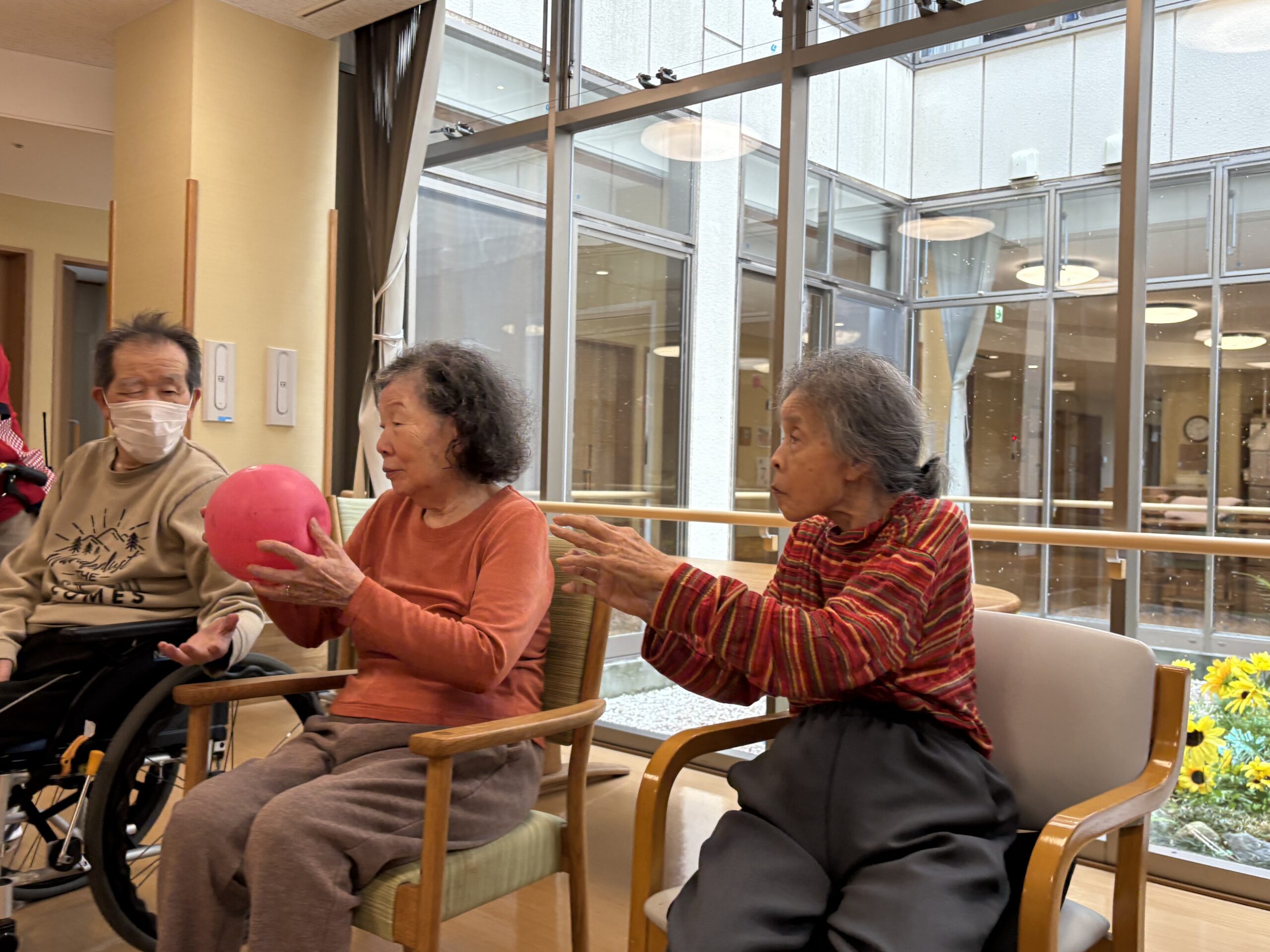 そのため、運動不足解消も兼ねてフロアの親睦を高めるべく、体操やボール運びの運動をしました。