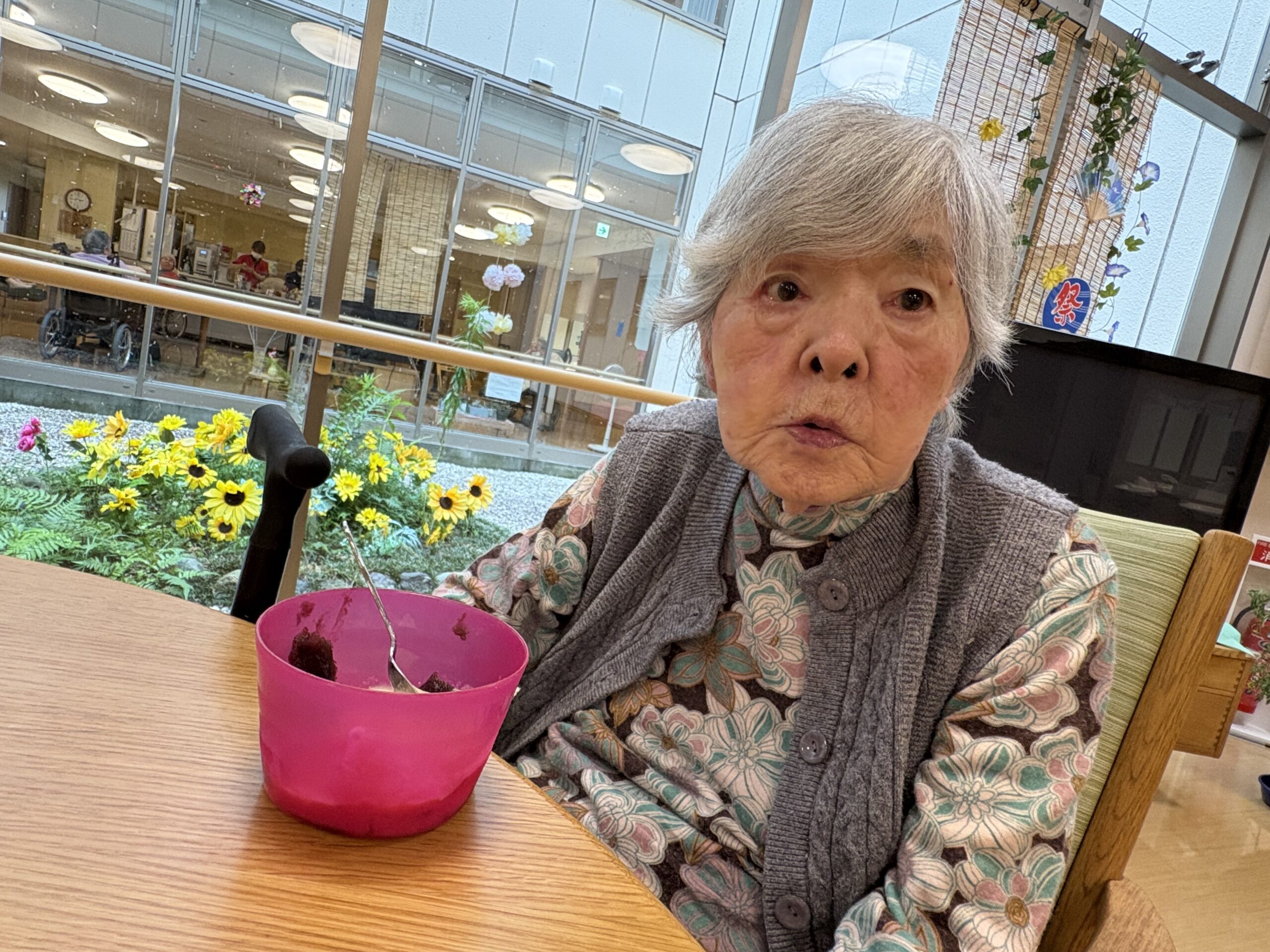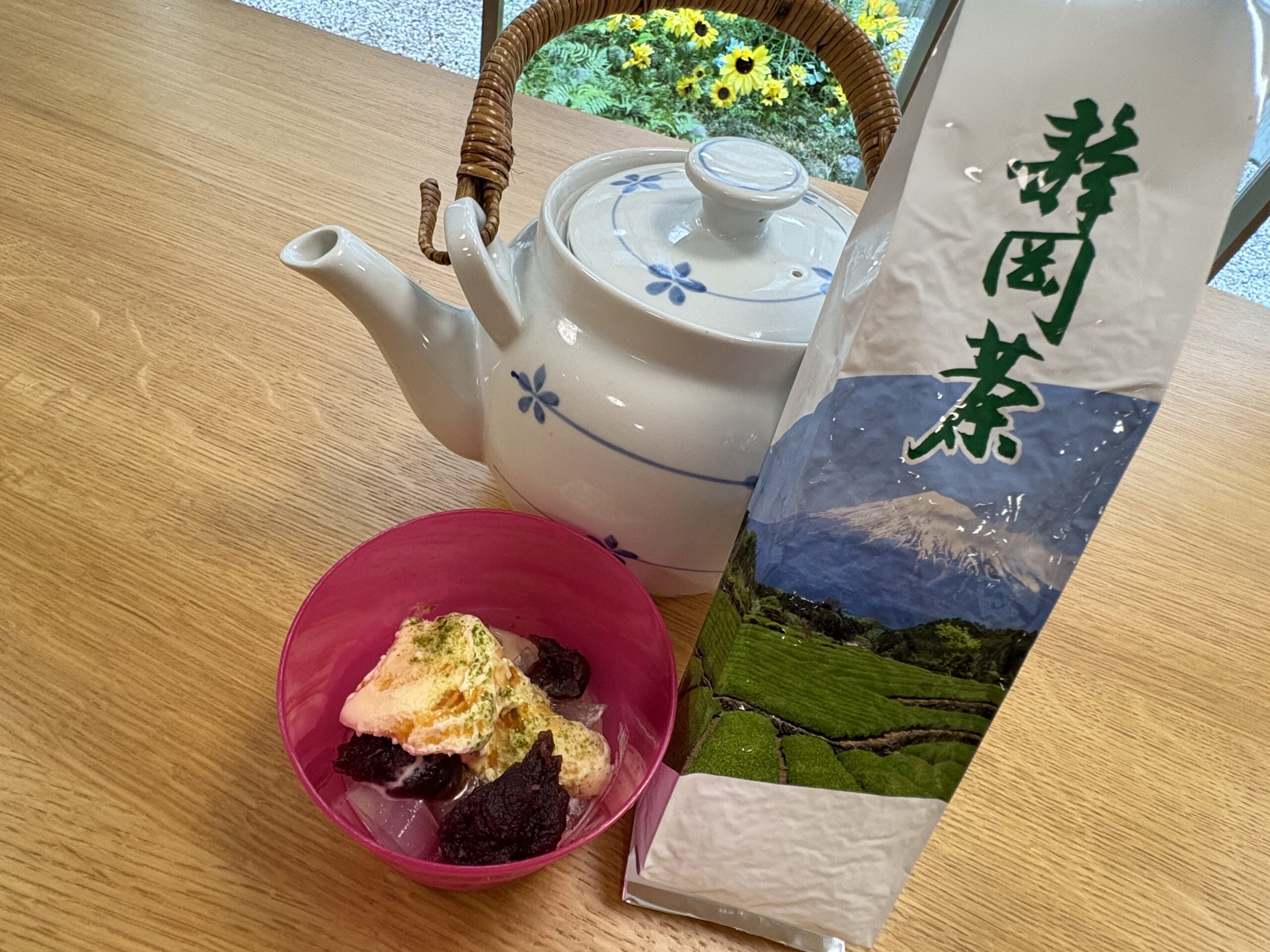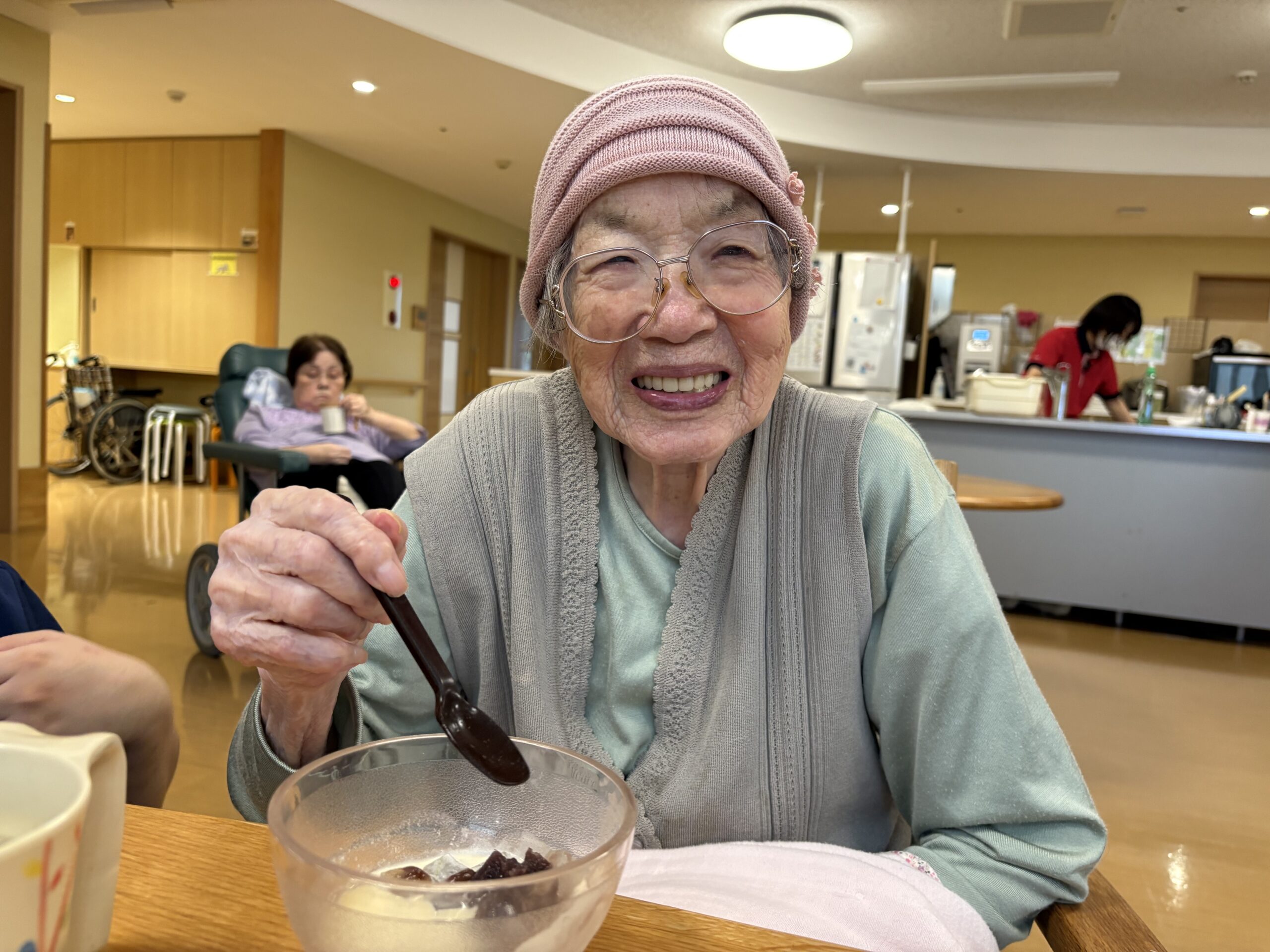 運動後には、水分と甘味を補給のためにあんみつとお茶を提供させていただきました。