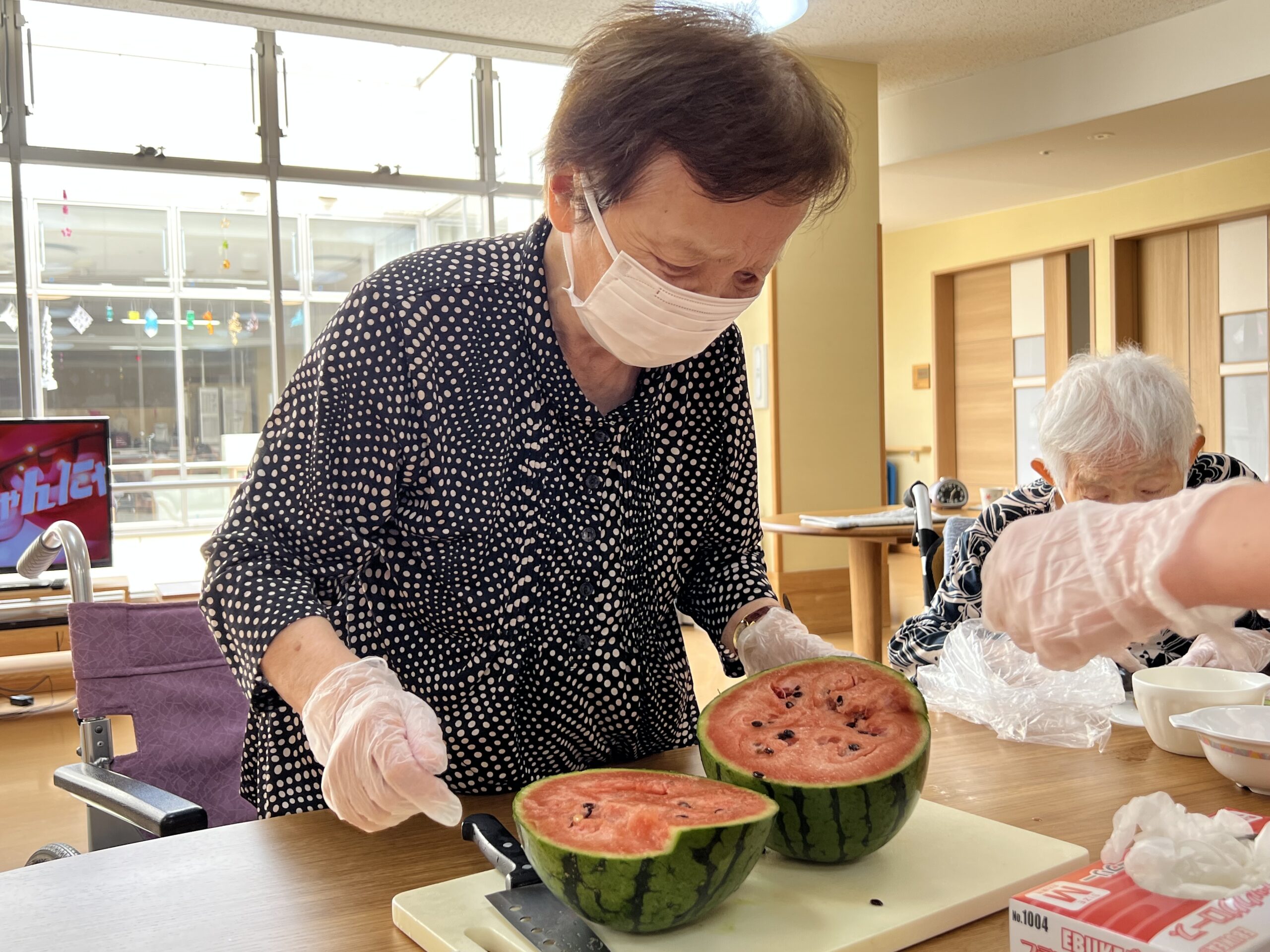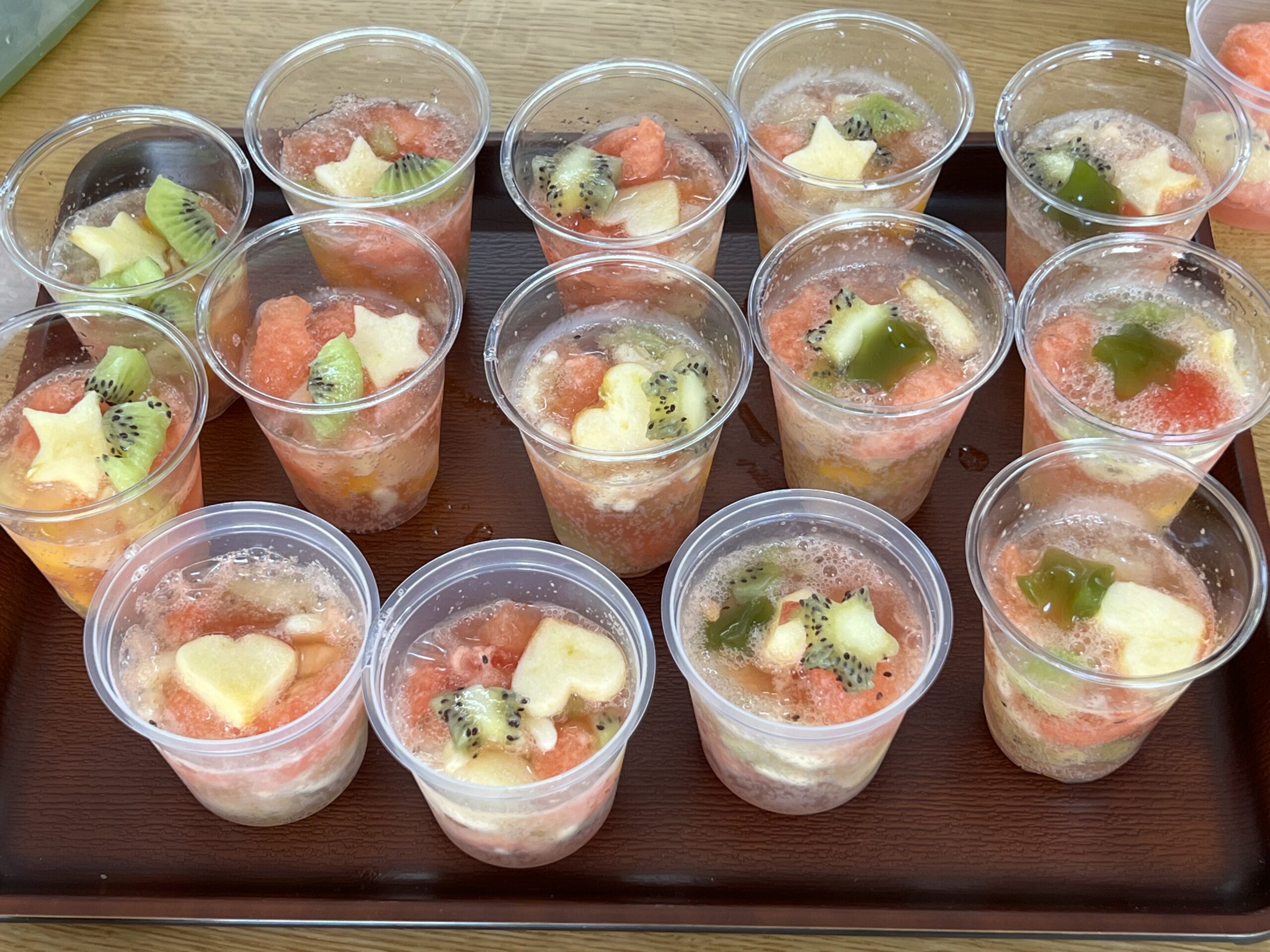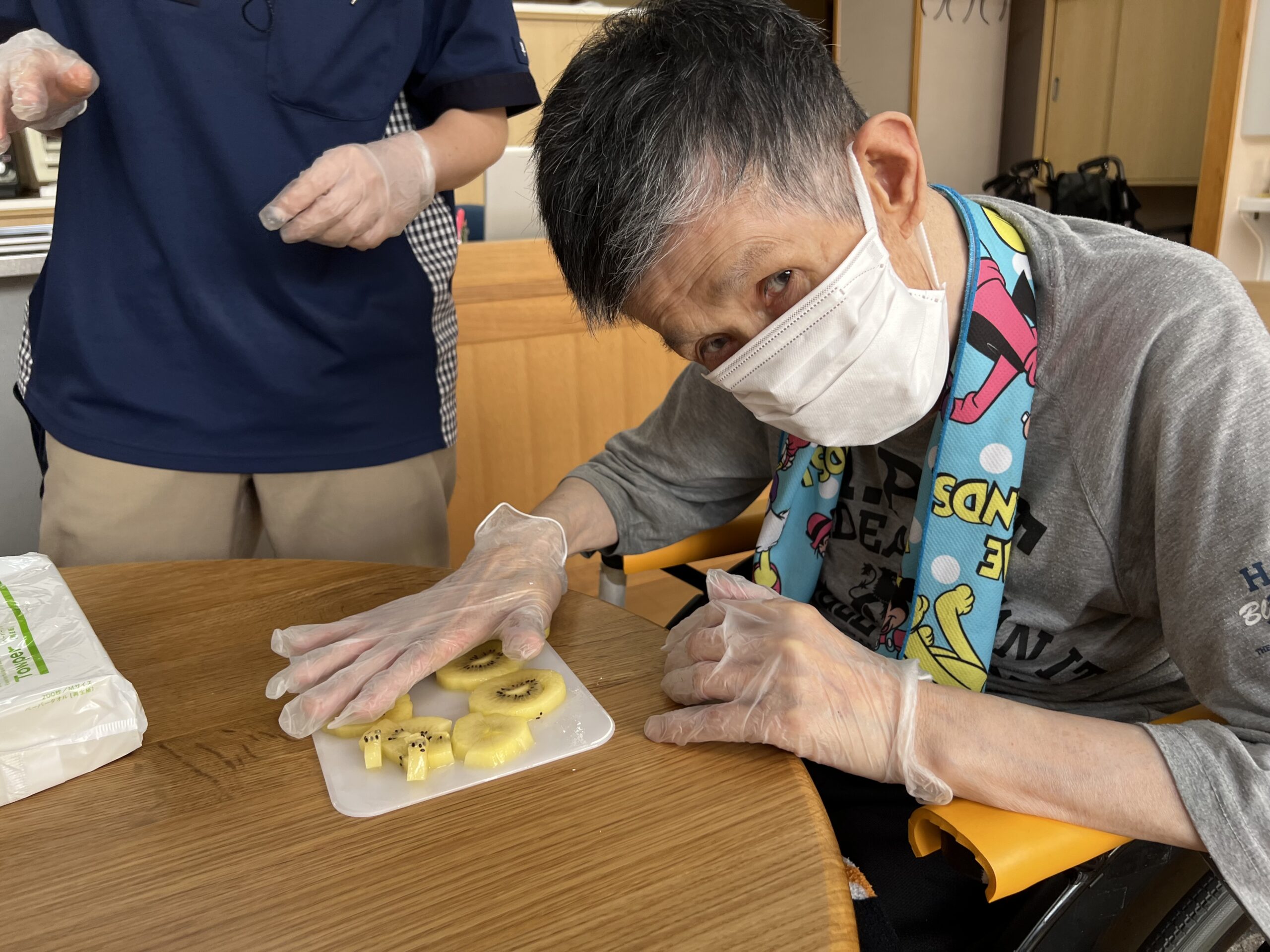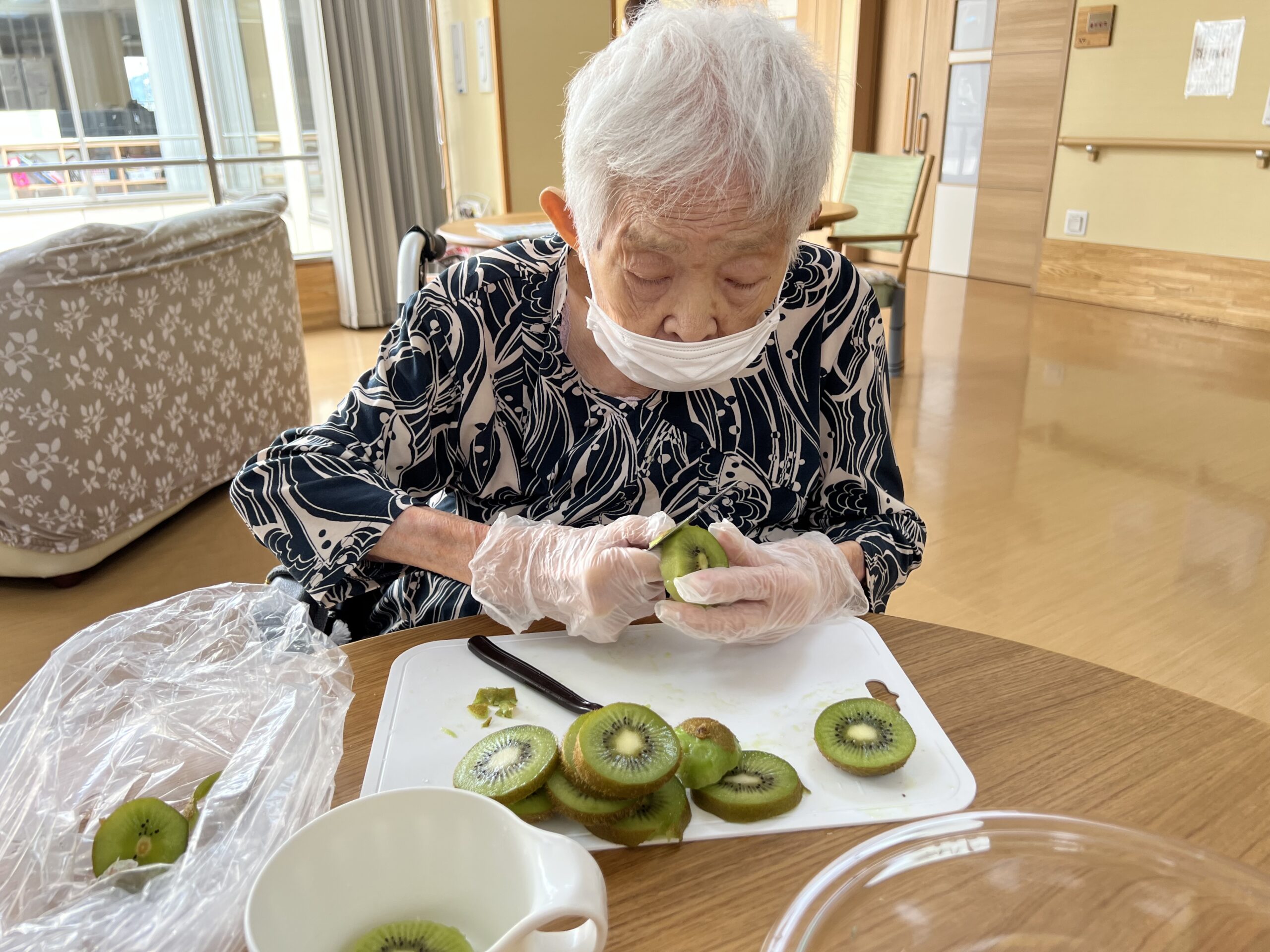 スイカやキウイなど果物のカットや型抜きは細かい作業が多かった為、作業を皆様と楽しみながらも指先の運動にもつながっています。