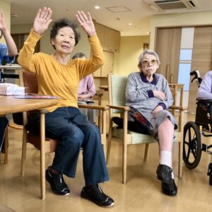 日常的に行っている体操に普段は参加されないお客様や実習生さんも参加され、大人数で踊りました。