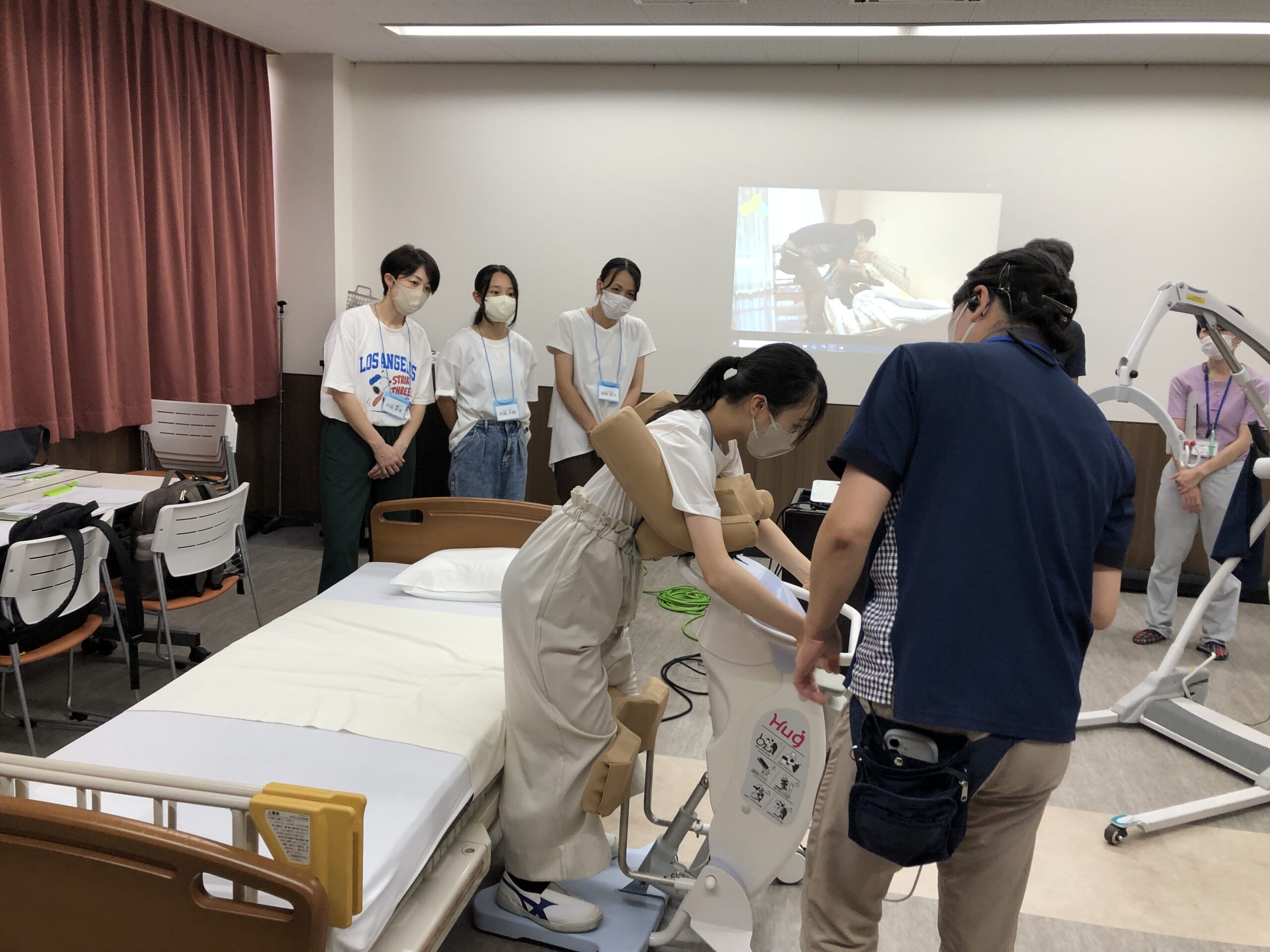 介護機器を使った移乗で力がなくとも介護ができることやお客様・職員双方が身体負担を軽減していることやボディメカニクスを学び・体験する班では、