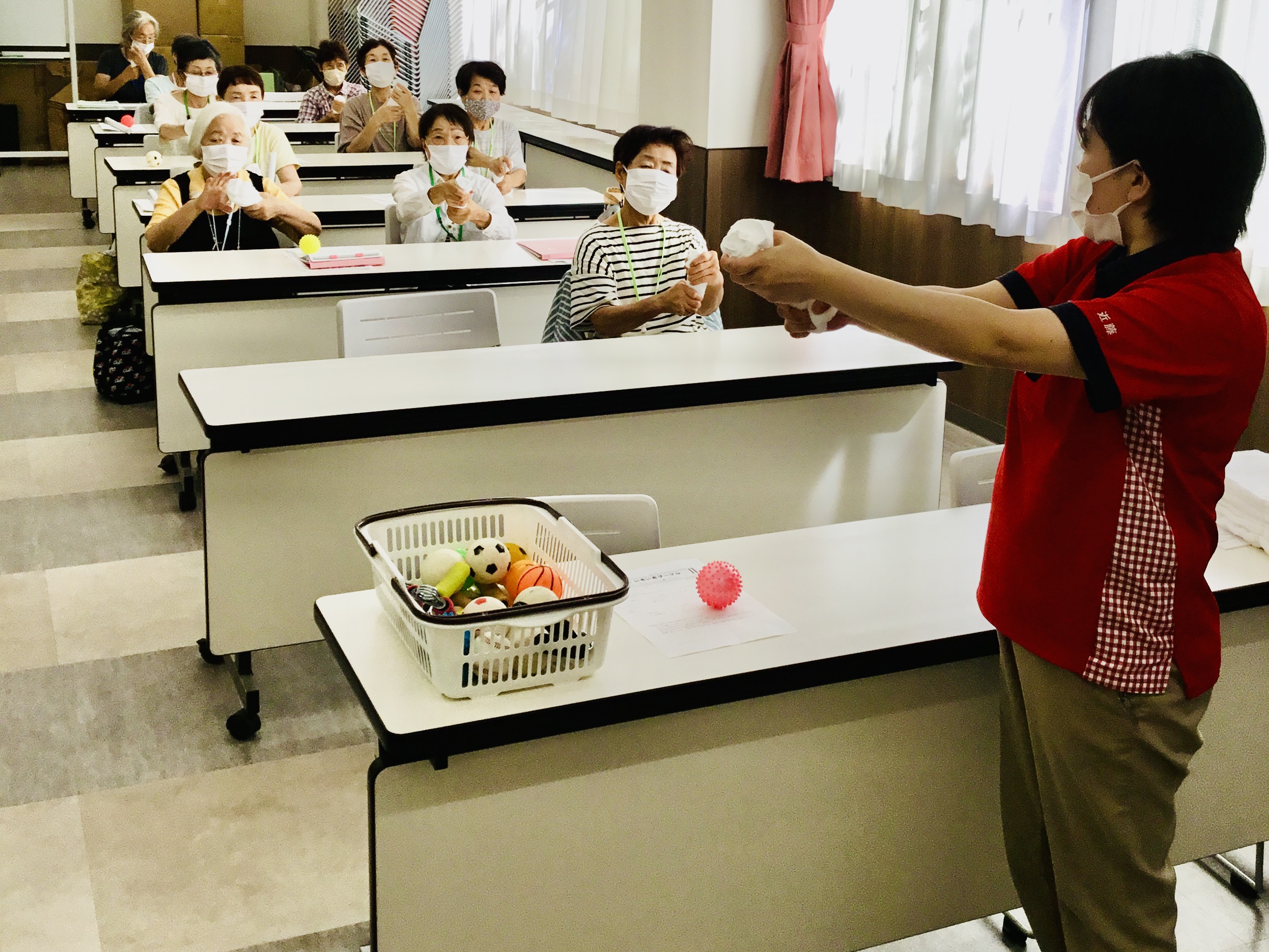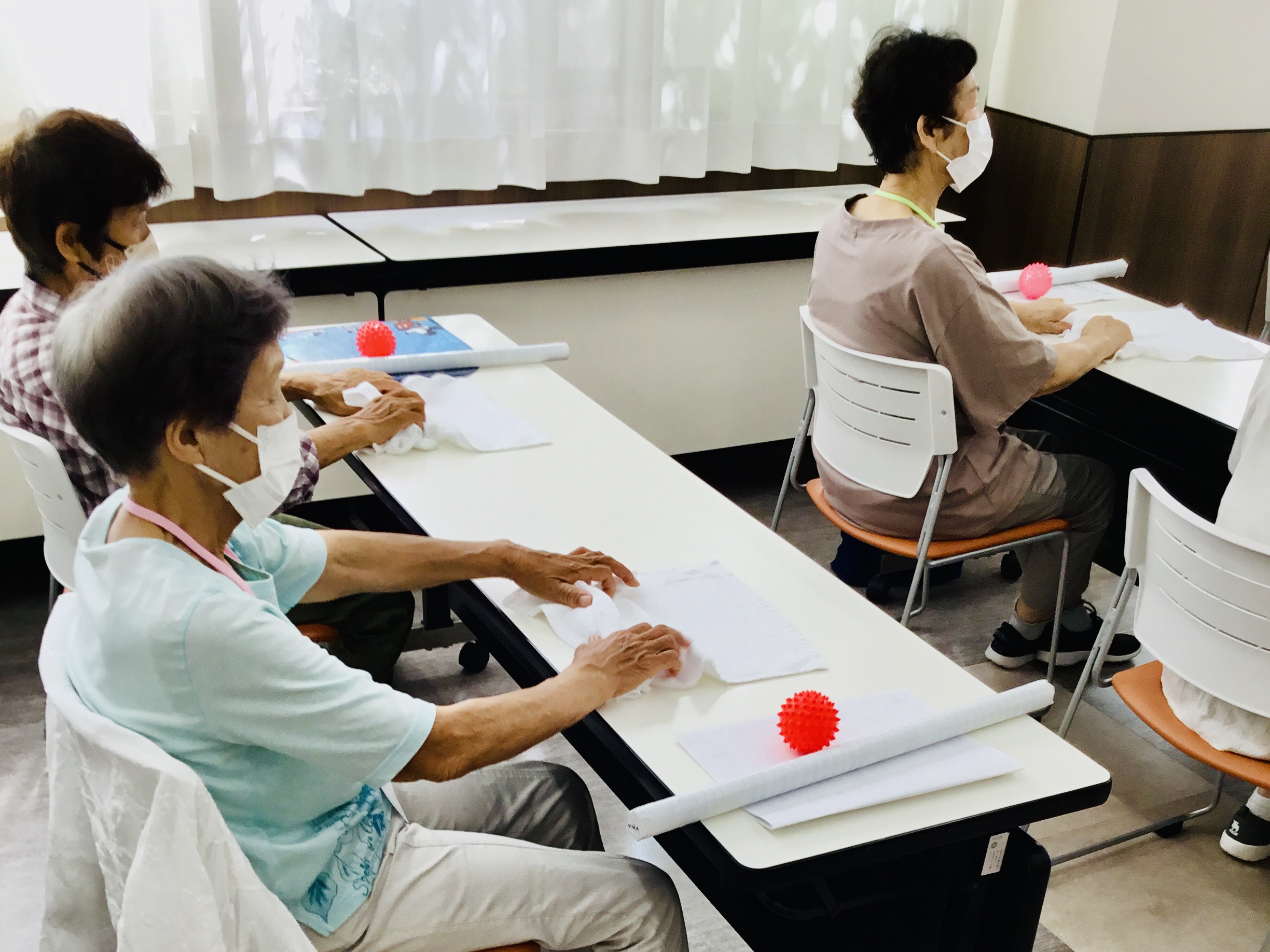 ・椅子に座ってボールや雑巾を使い、手指を動かす運動