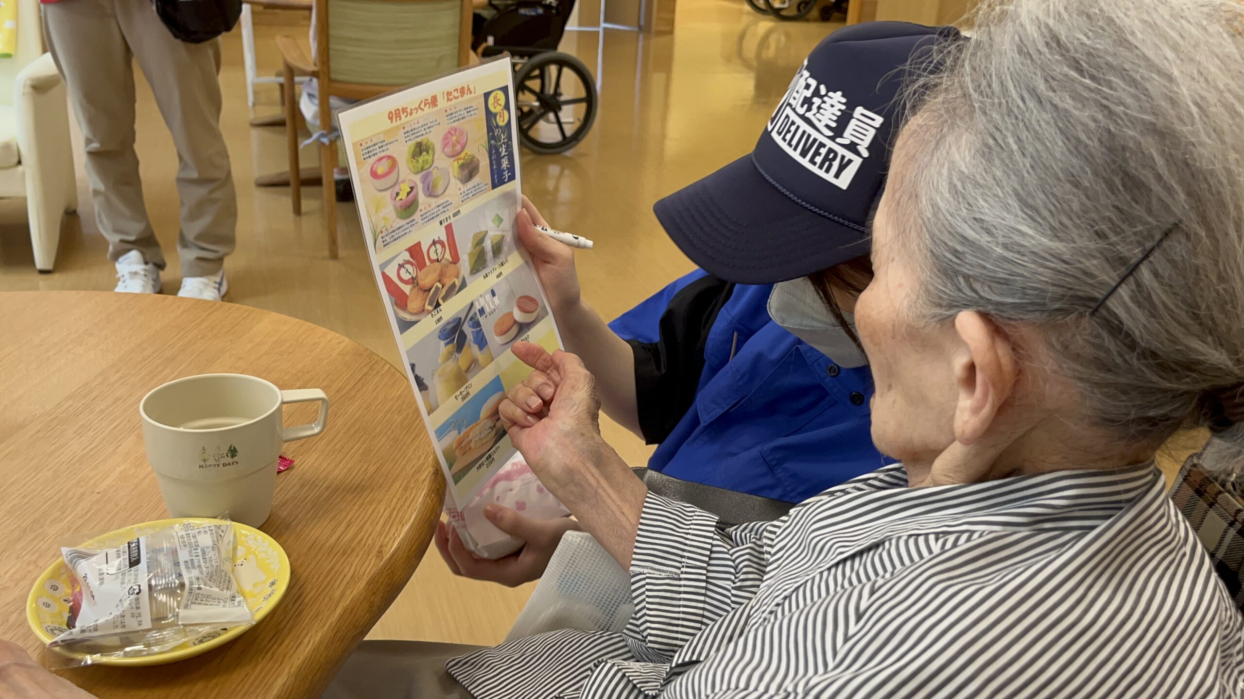 月に一度、職員がお店を提案して、その中から代行してほしい商品を選んでいただきお届けしていく仕組みです。