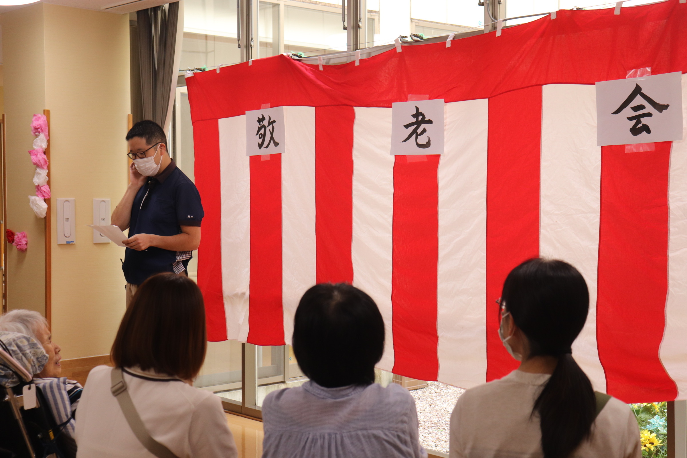 紅白幕を飾り付け、ユニット1階の東西のお客様が集まります。