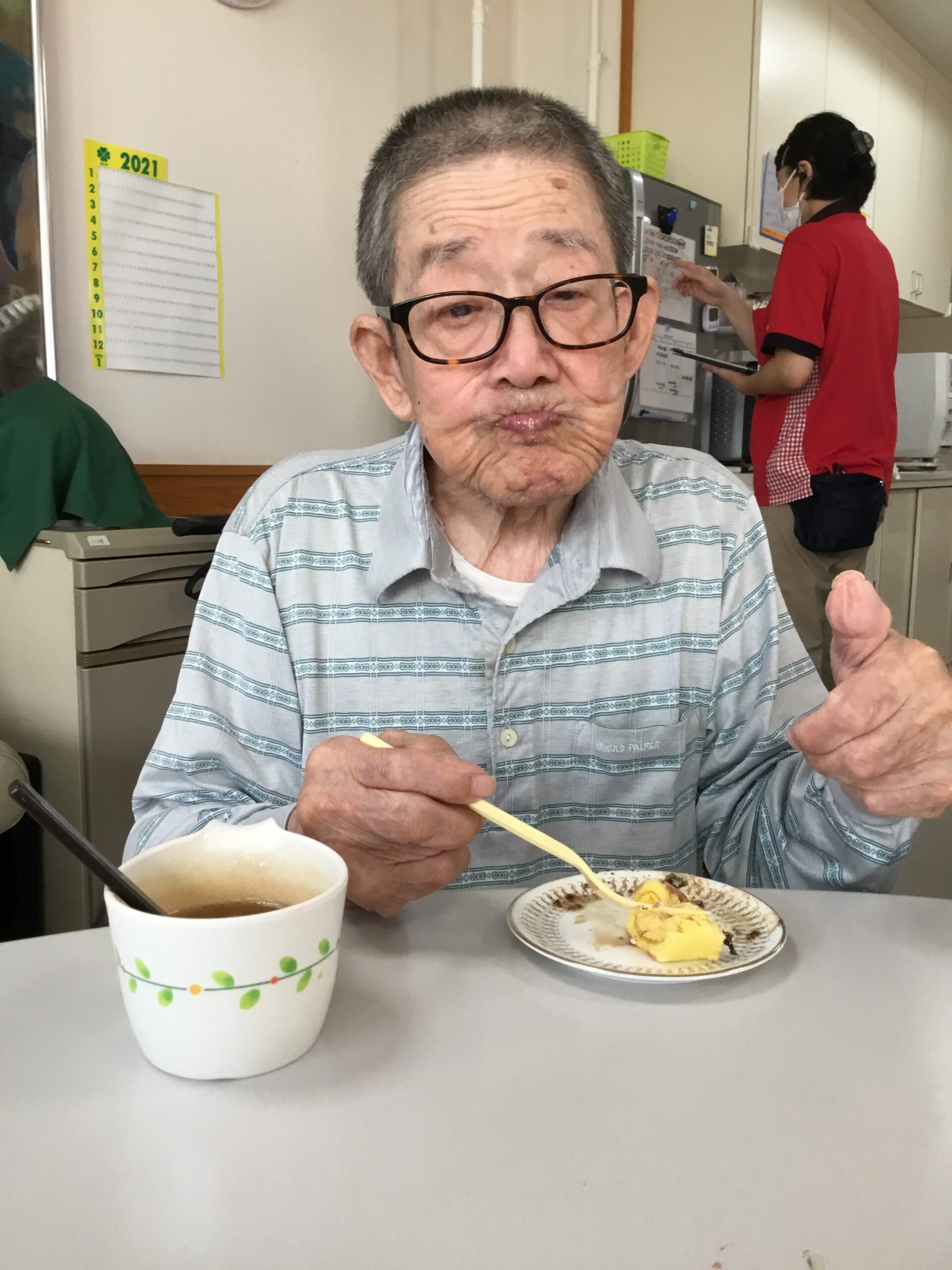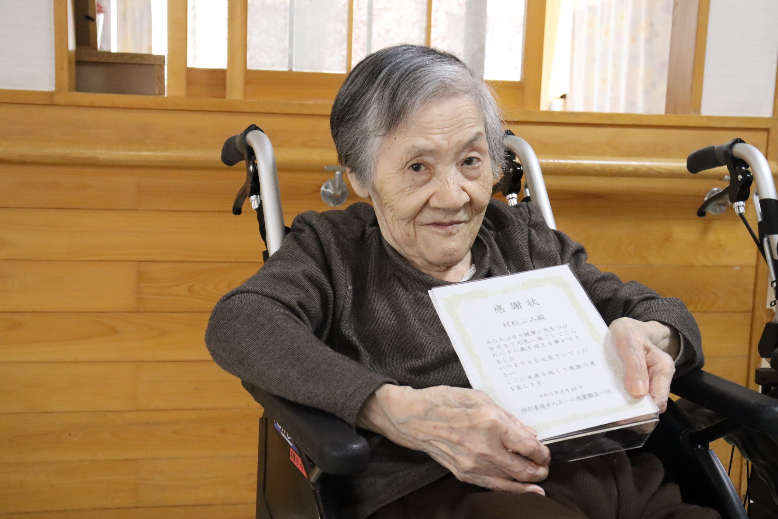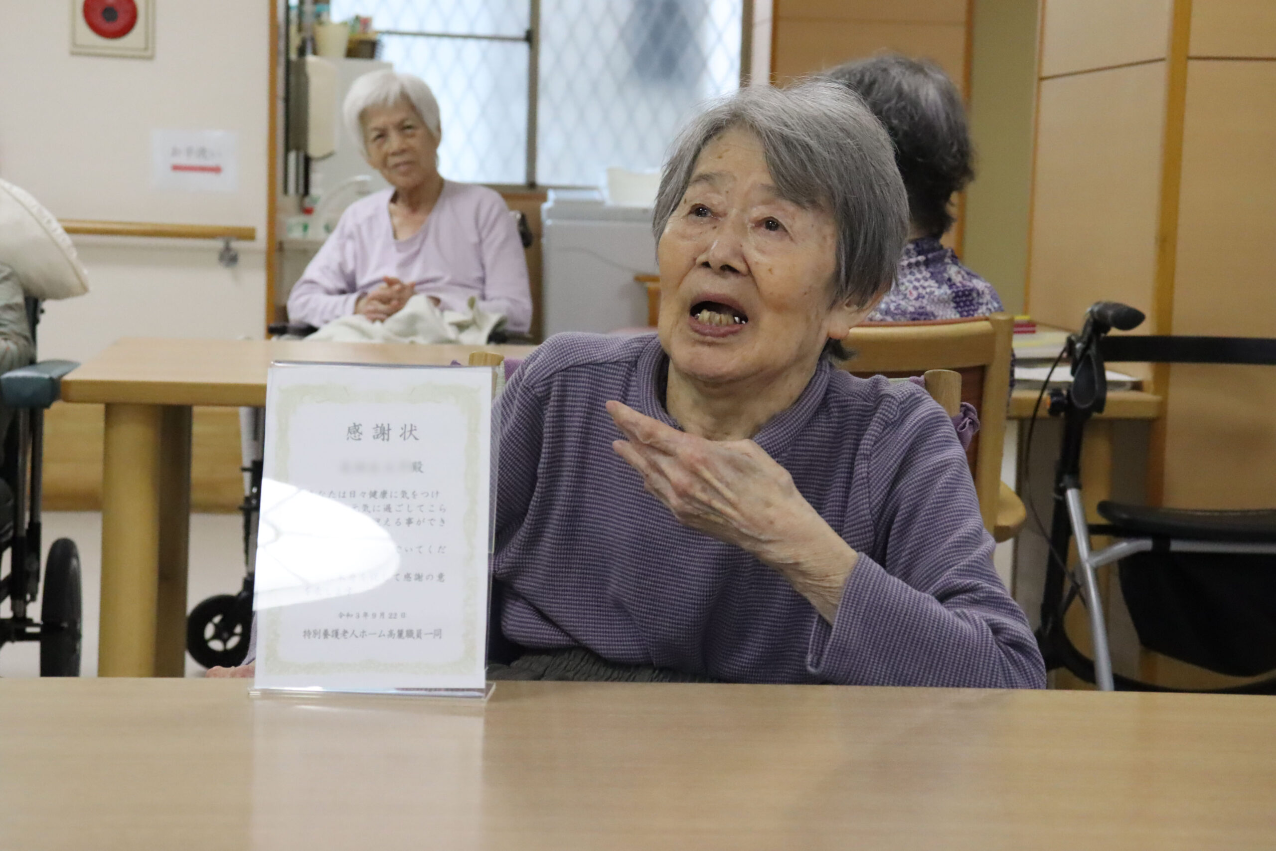 和やかな雰囲気の中、施設長からお祝いの話をすると、笑顔を浮かべながら聴いているお客様もいれば、真剣に聴き入っているお客様もおりました。