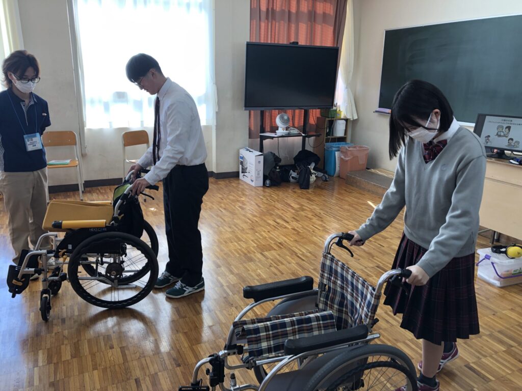 車椅子の開閉の仕方や注意点を学びます。