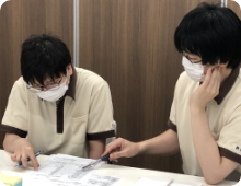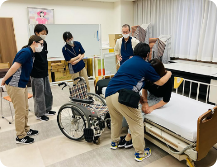 介護技術を向上させるためにその時課題に挙がっている、移乗や食事、排泄等の介護技術を勉強したり、新しく導入した介護機器の使い方等学びます。