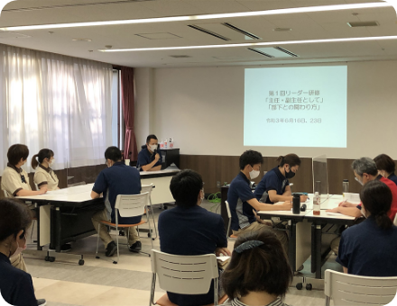 人事考課、キャリアパスにより管理職になった職員を対象に研修を実施しています。役職別や部門別で実施することもあり、それぞれのセクションで課された役職者としての使命を果たせるように研鑽します。今後より強化をしていく研修でもあります。